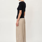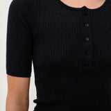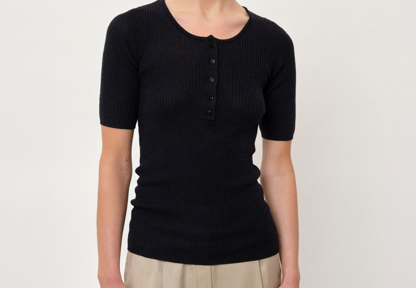 Introducing the Agnes Knit Blouse: A fitted knit blouse featuring a ribbed texture, half-length sleeves, and a button closure at the front.