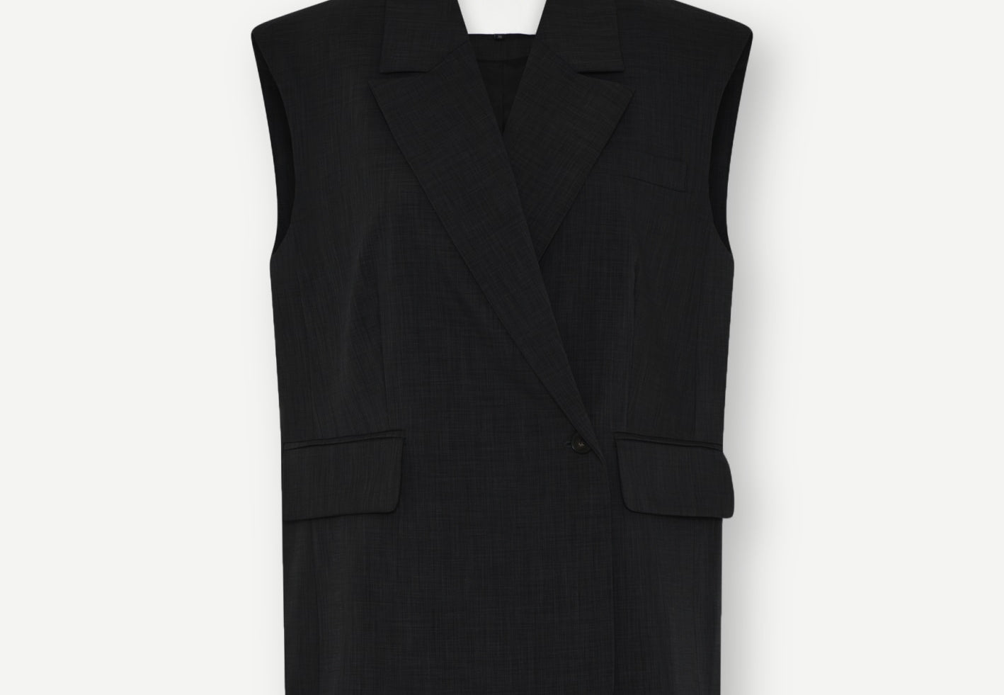 The Averill Blazer is an oversized sleeveless blazer featuring a double-breasted design with a single button closure, shoulder padding for a classic blazer look, and side panels.