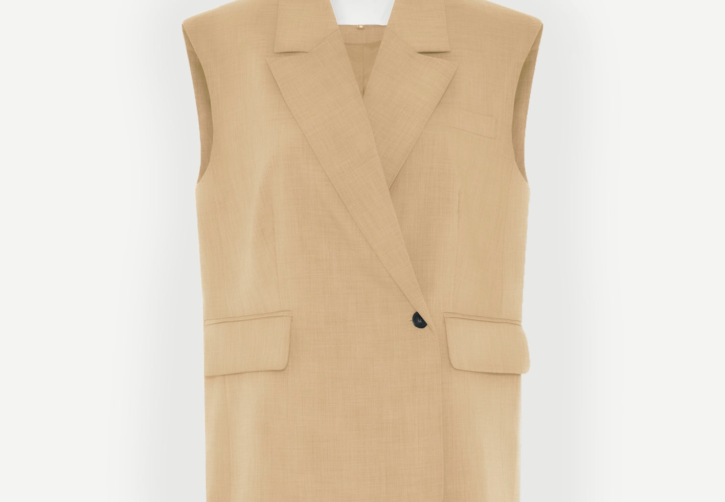 The Averill Blazer is an oversized sleeveless blazer featuring a double-breasted design with a single button closure, shoulder padding for a classic blazer look, and side panels.