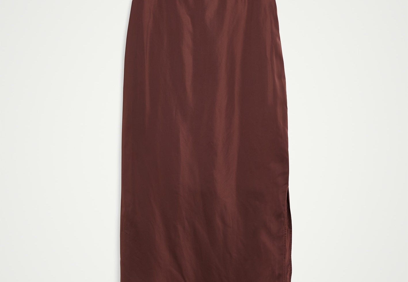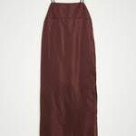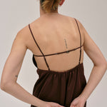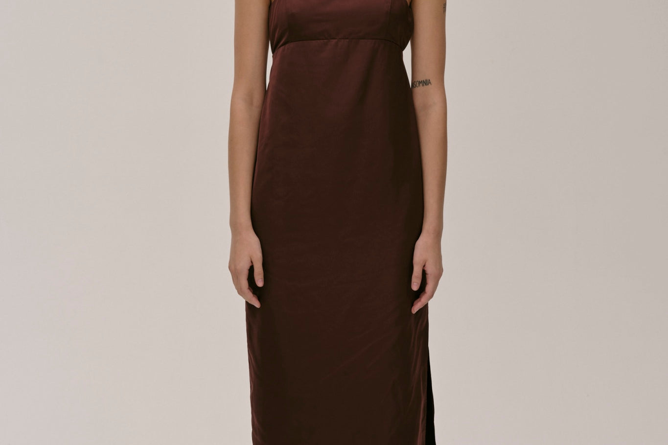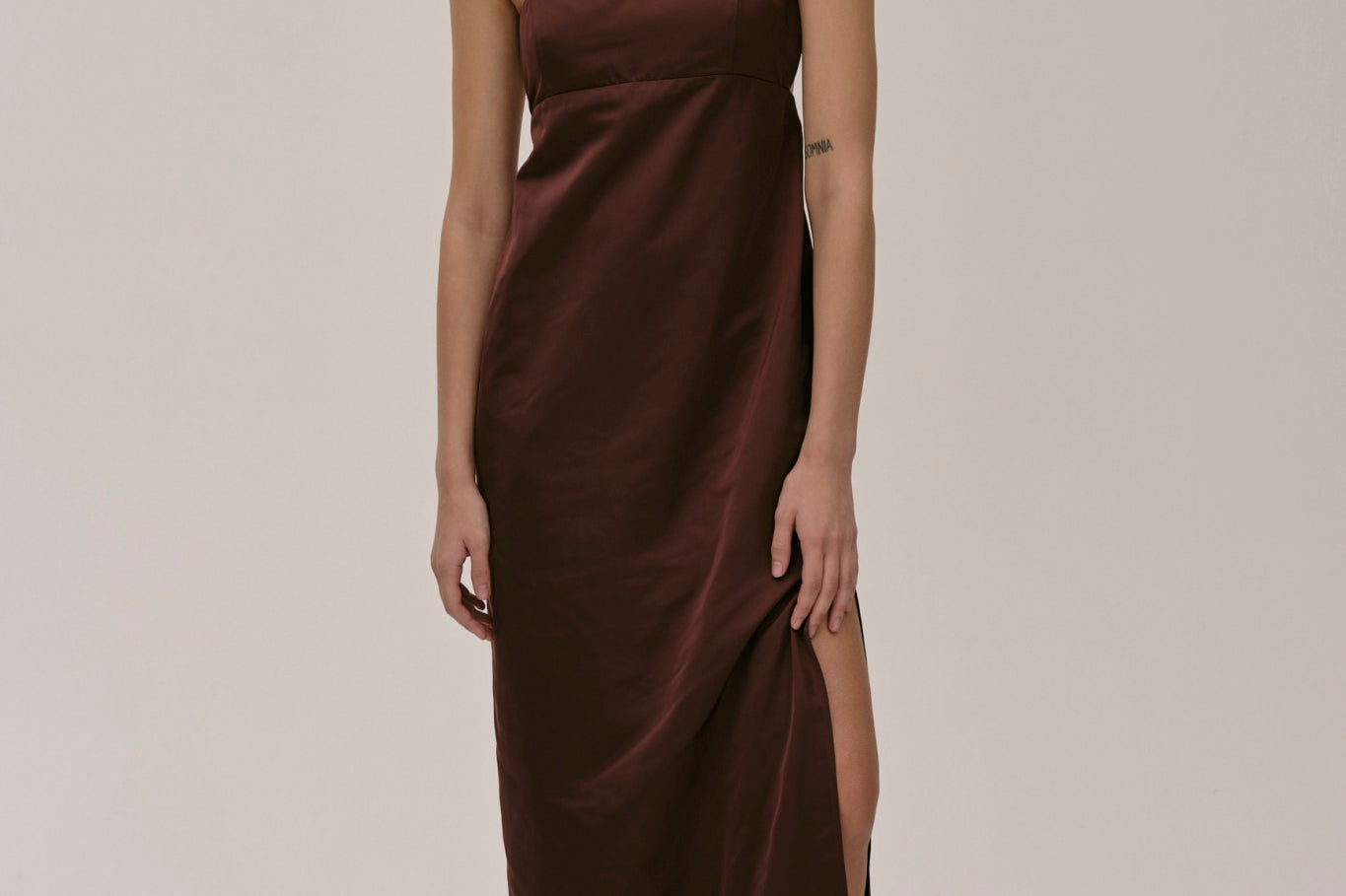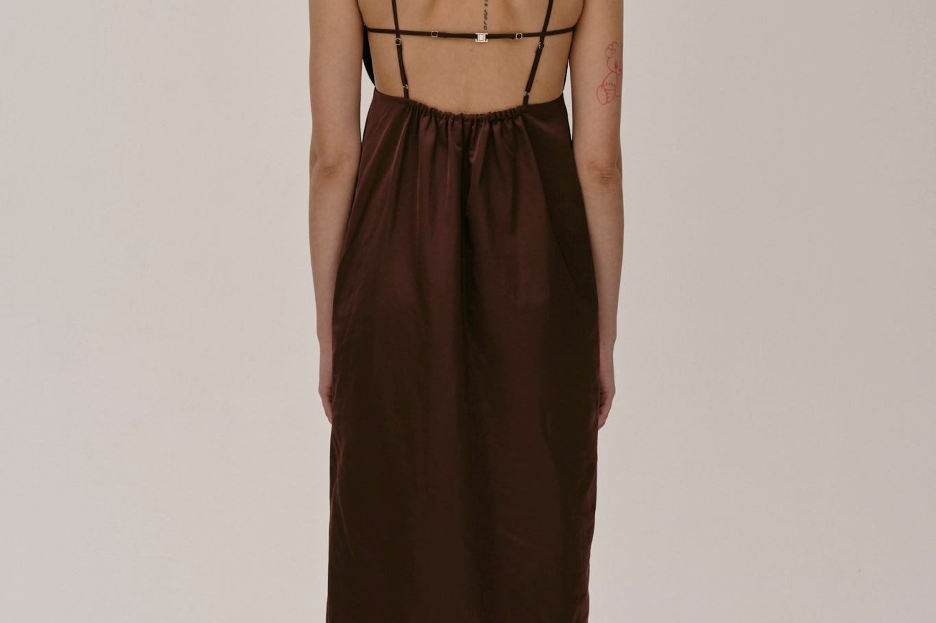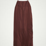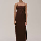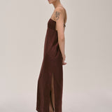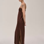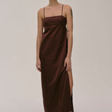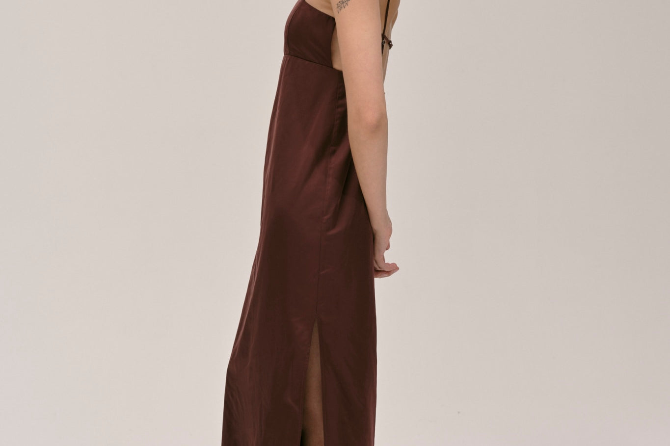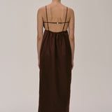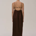 The Bach Dress is a full-length strap dress with a back strap and an open back in the upper part. The lower part features a bit more volume, along with a slit at the left side front.