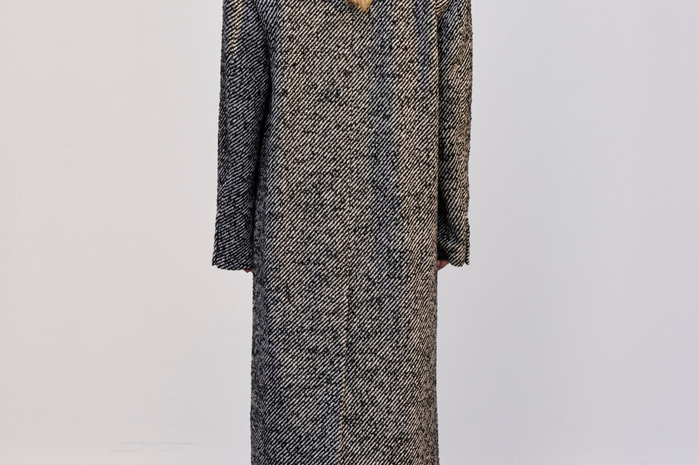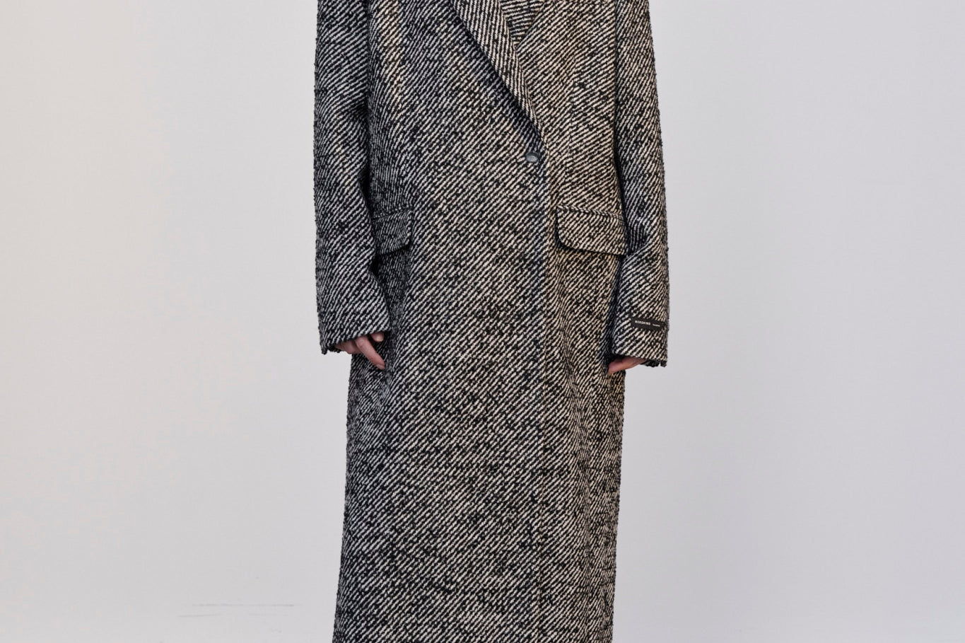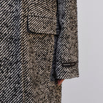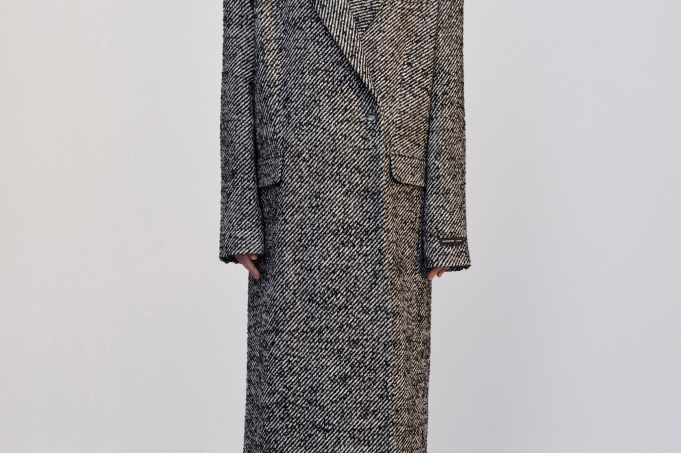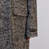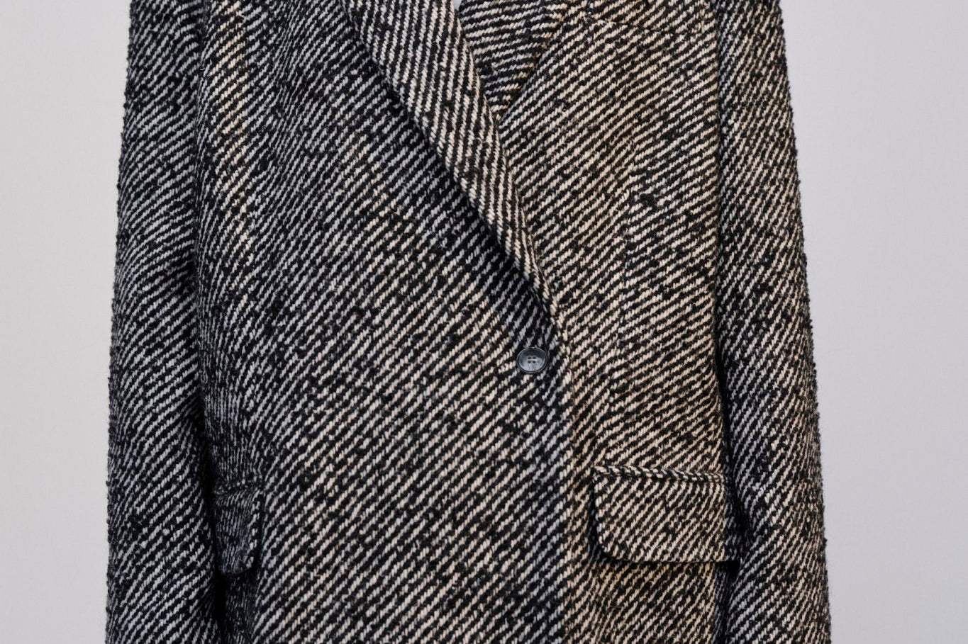 Introducing the Butter Coat: A men's shaped coat featuring an oversized body, double-breasted with only one button closure, no side seams but side panels, darts, and pockets with pocket flaps at the front. It is adorned with a woven label: LANIFICIONELLO GORI - Made in Italy.