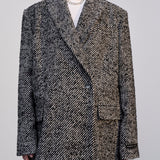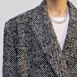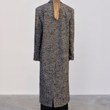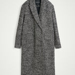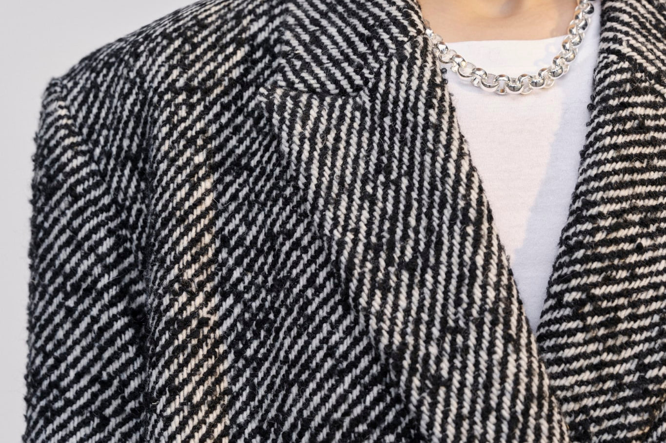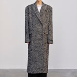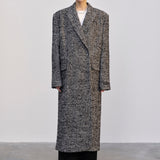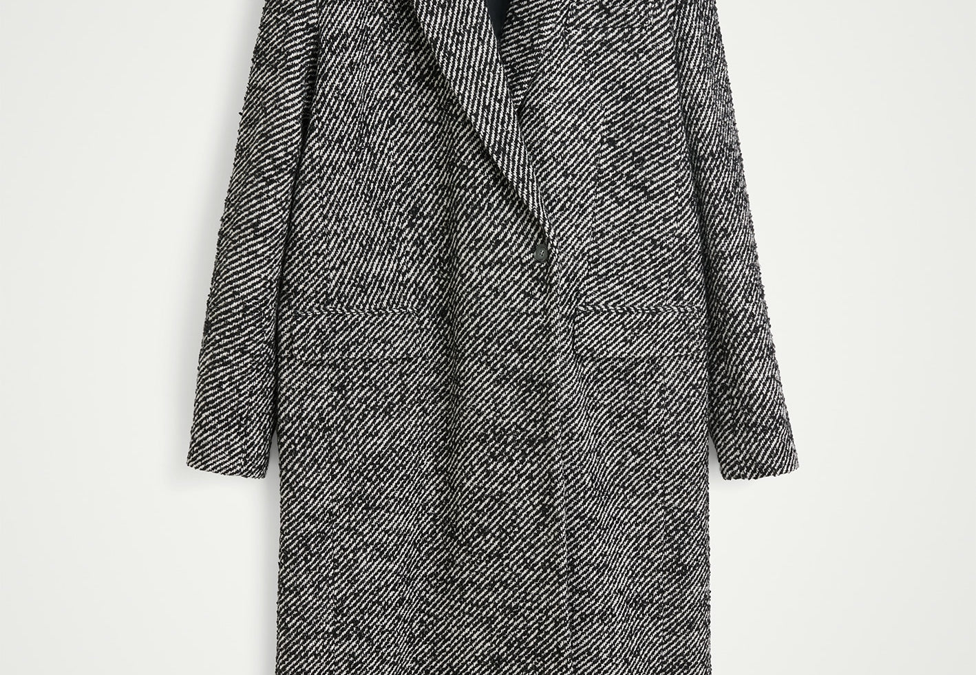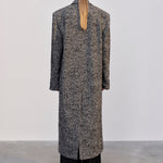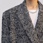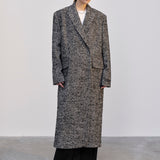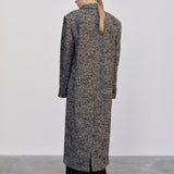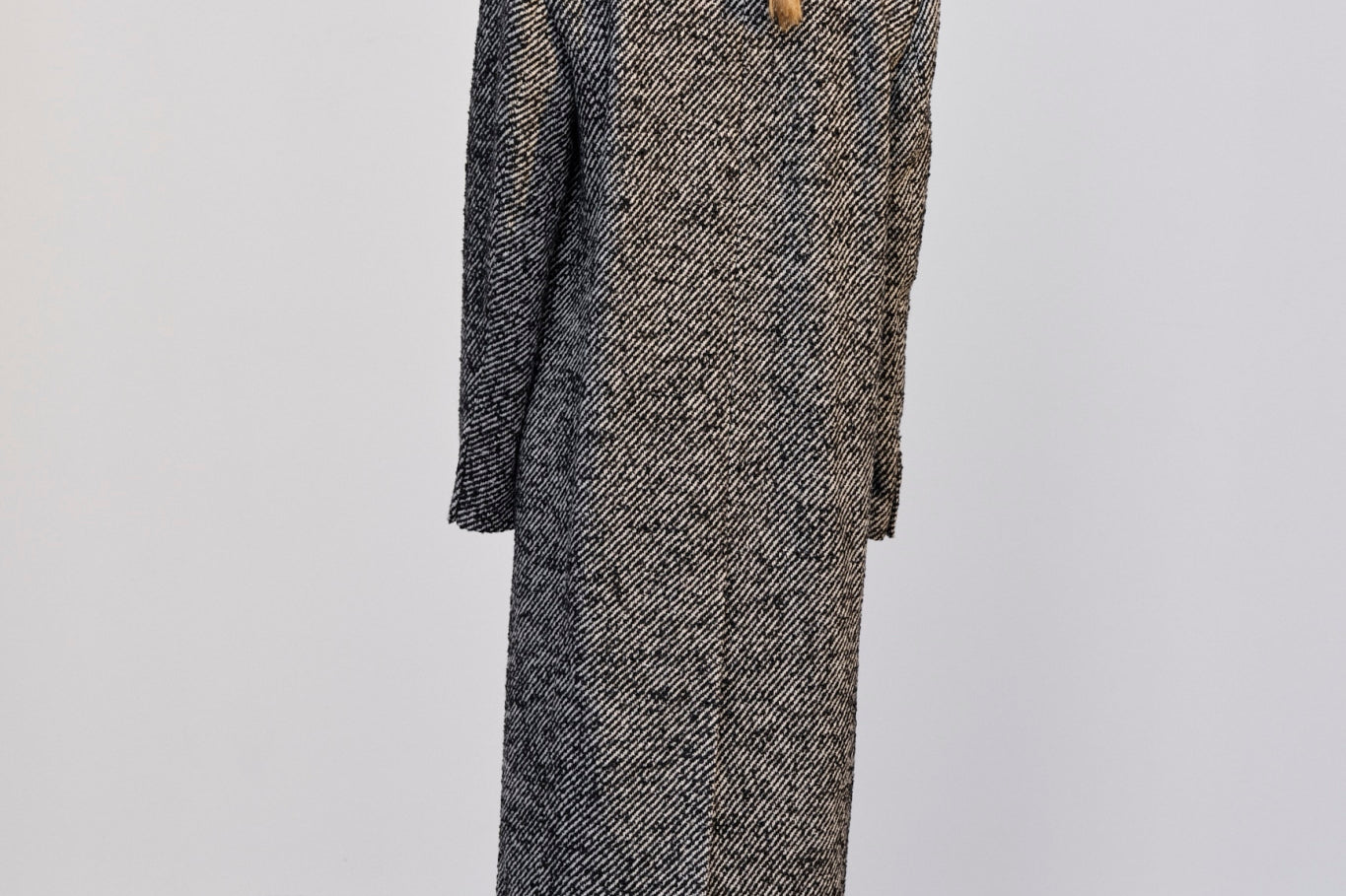 Introducing the Butter Coat: A men's shaped coat featuring an oversized body, double-breasted with only one button closure, no side seams but side panels, darts, and pockets with pocket flaps at the front. It is adorned with a woven label: LANIFICIONELLO GORI - Made in Italy.