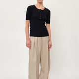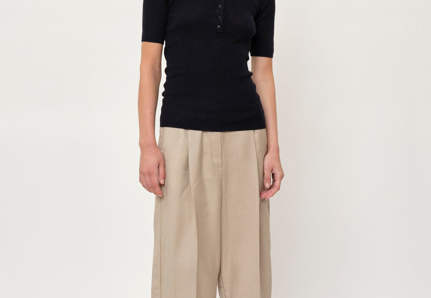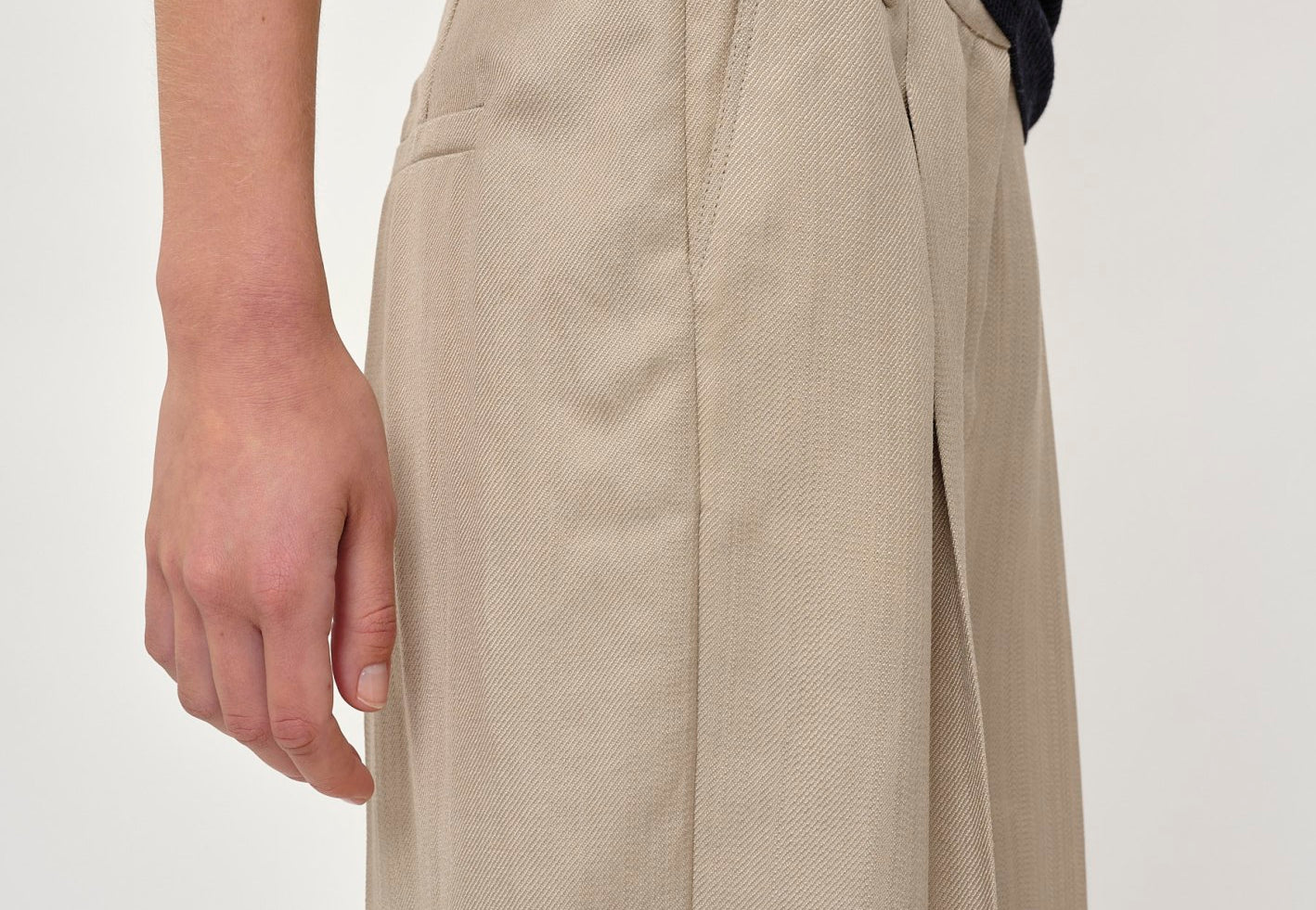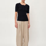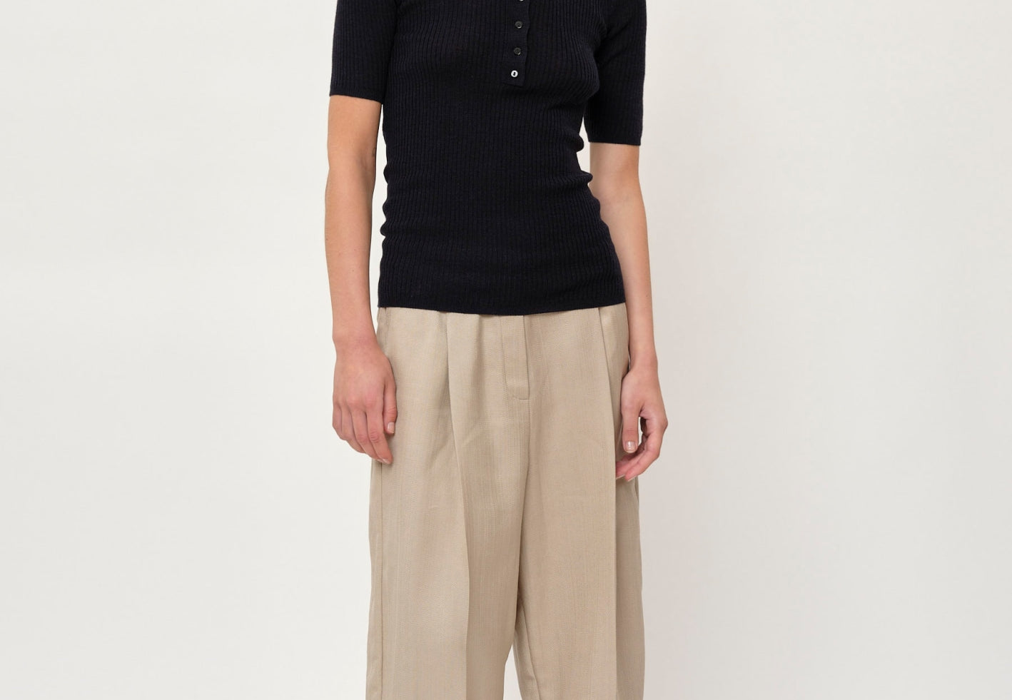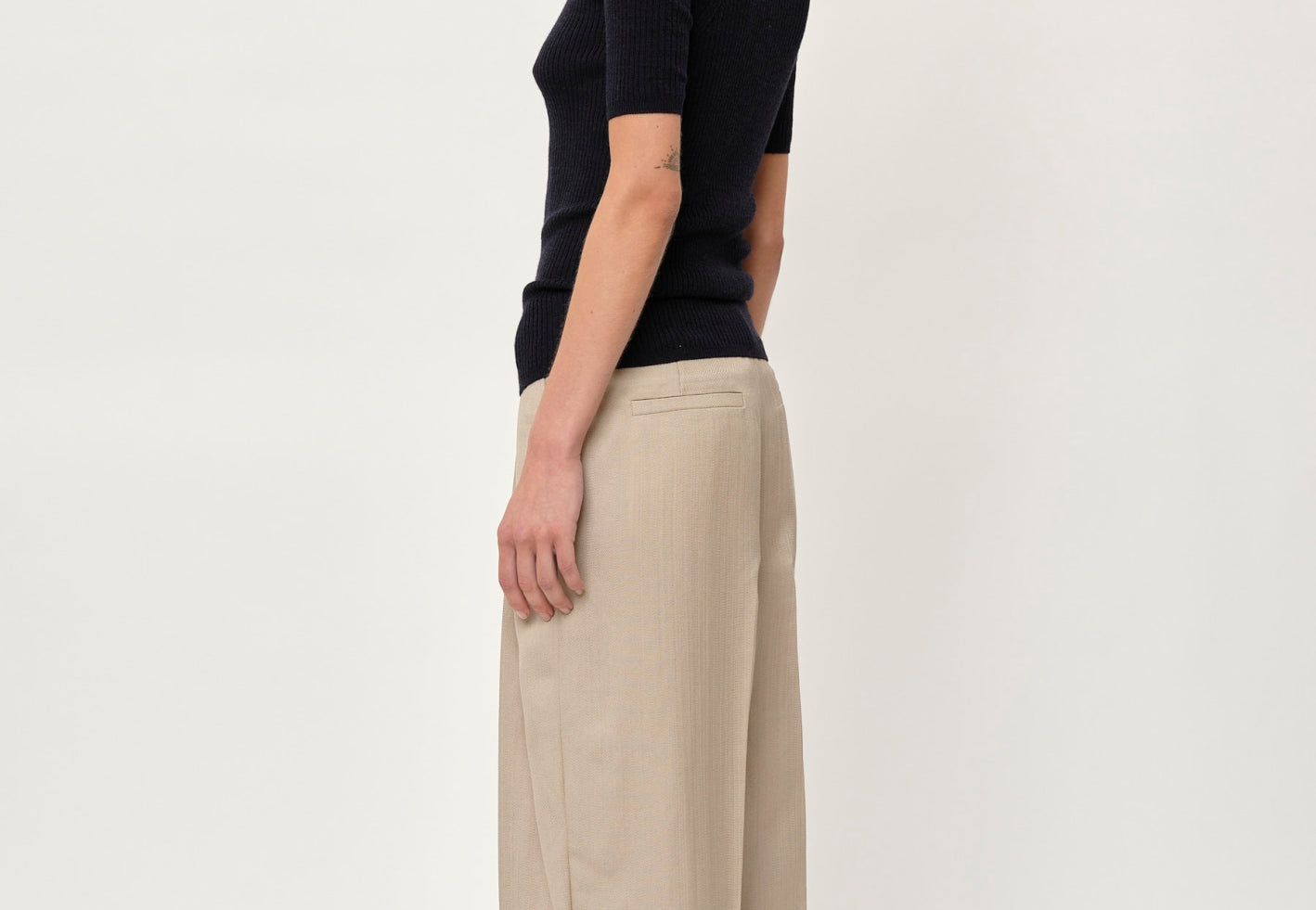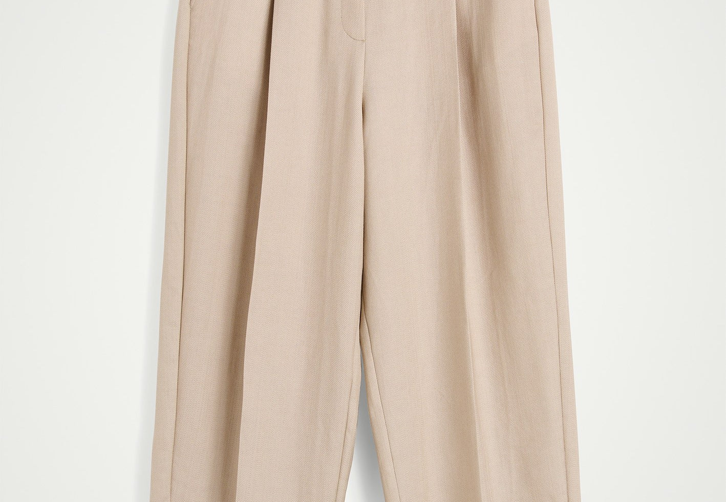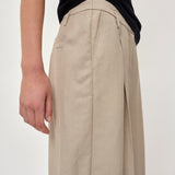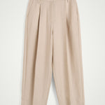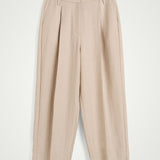 Introducing the Carla Pants: Long, baggy pants featuring folded pleats at the waistband and a slight cocoon shape.