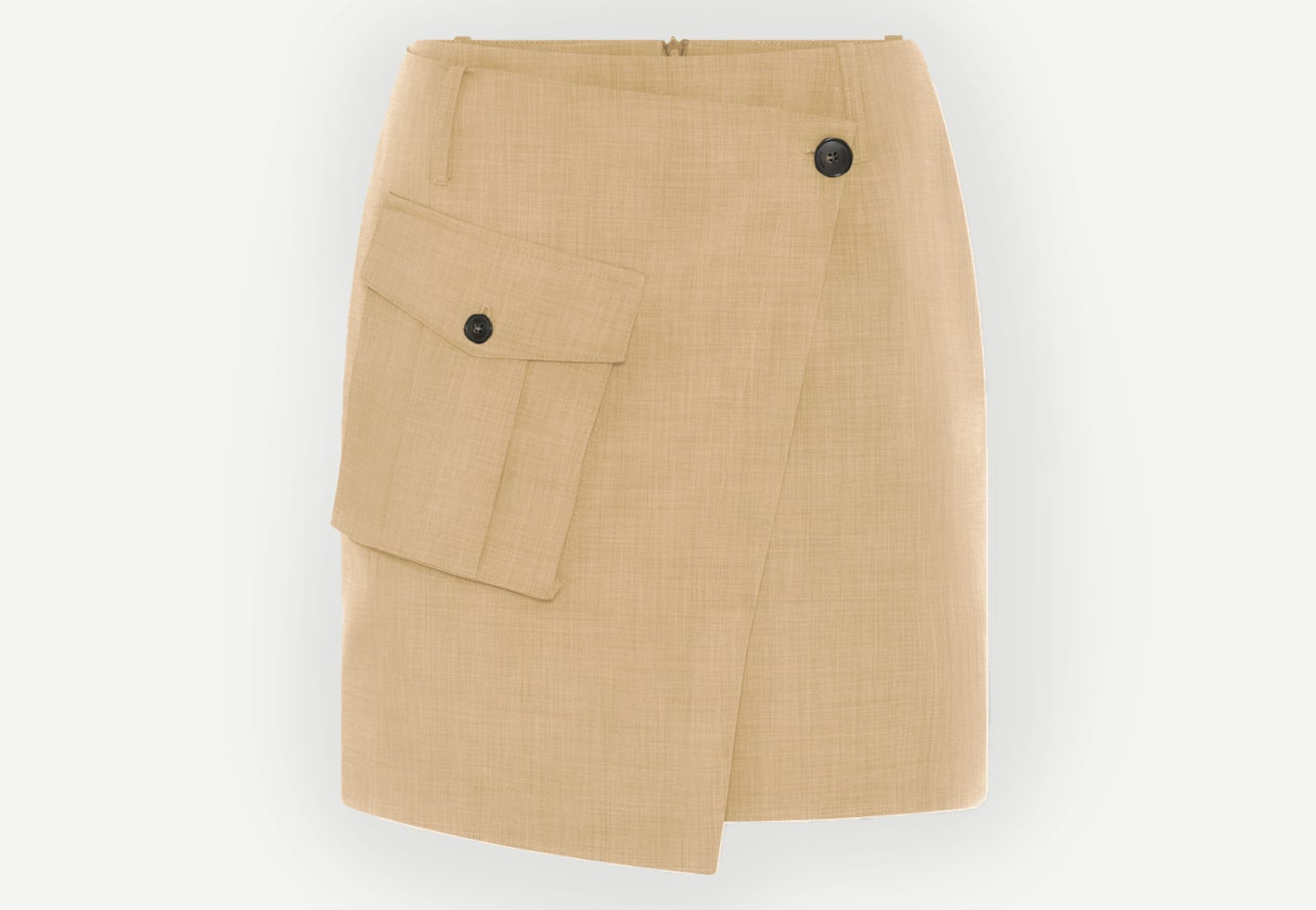 The Carolina Skirt is a mid-waisted mini wrap skirt with one big cargo pocket on the upper piece front.