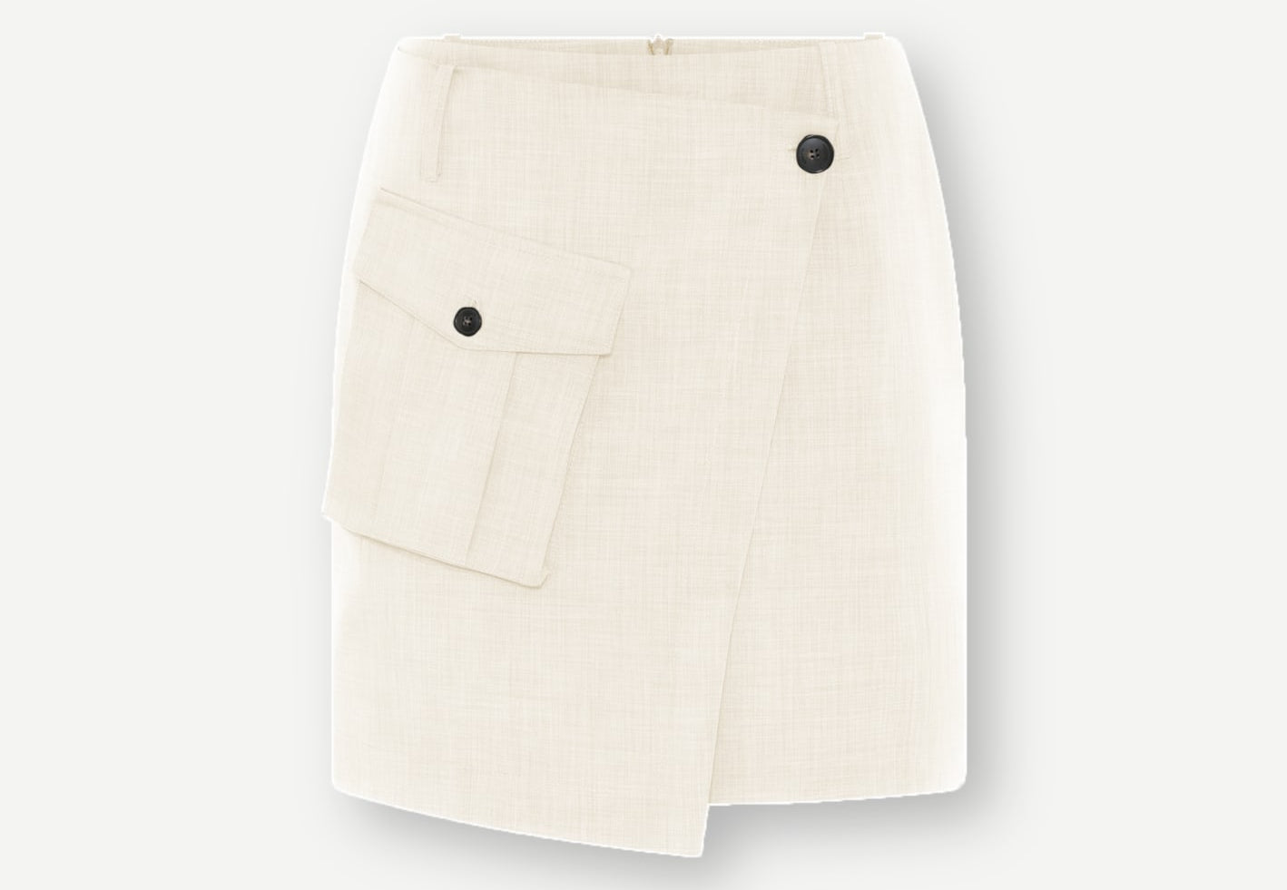 The Carolina Skirt is a mid-waisted mini wrap skirt with one big cargo pocket on the upper piece front.