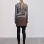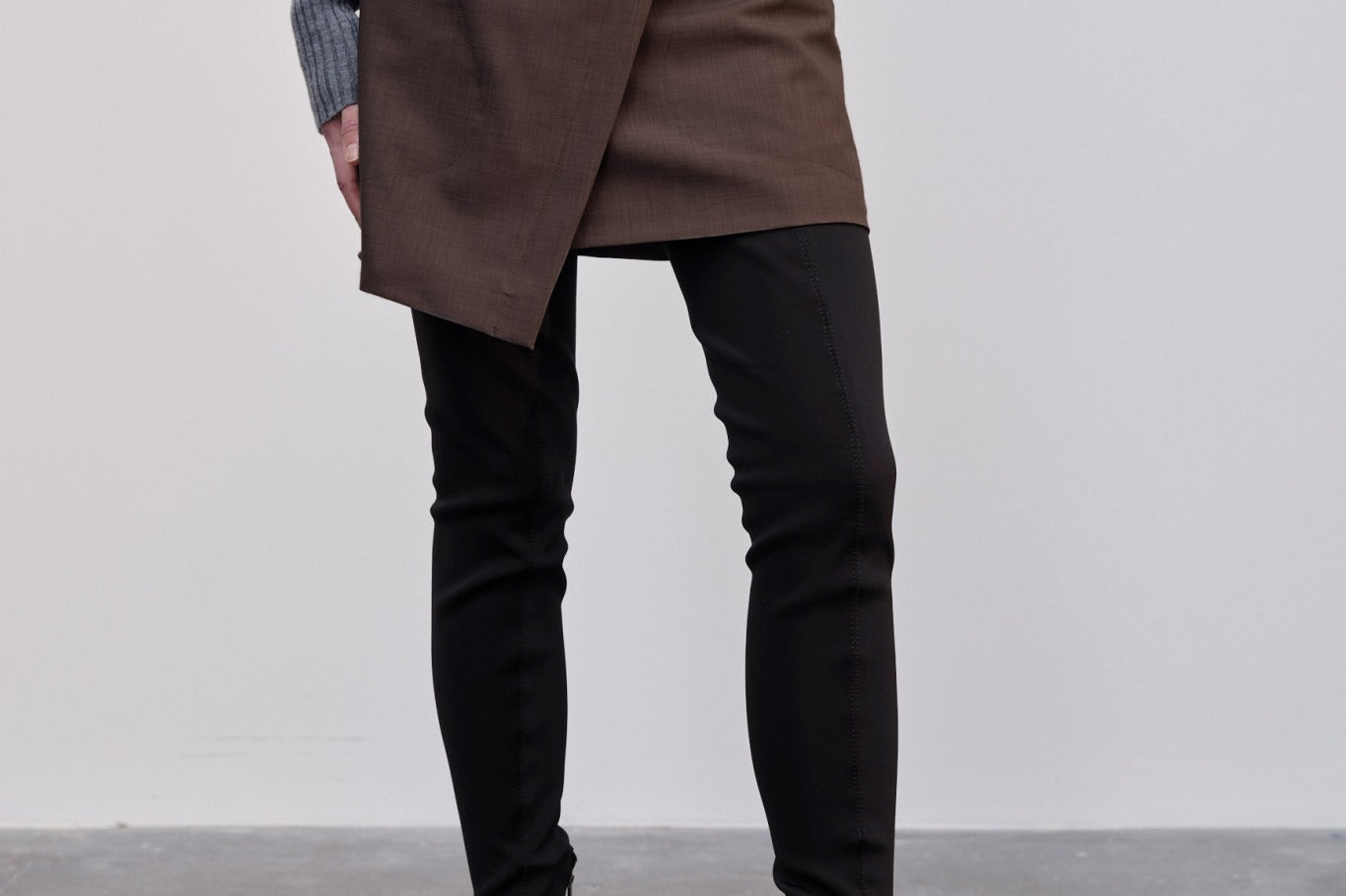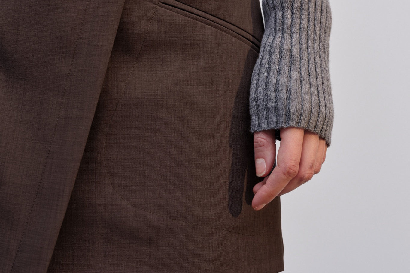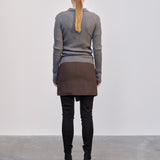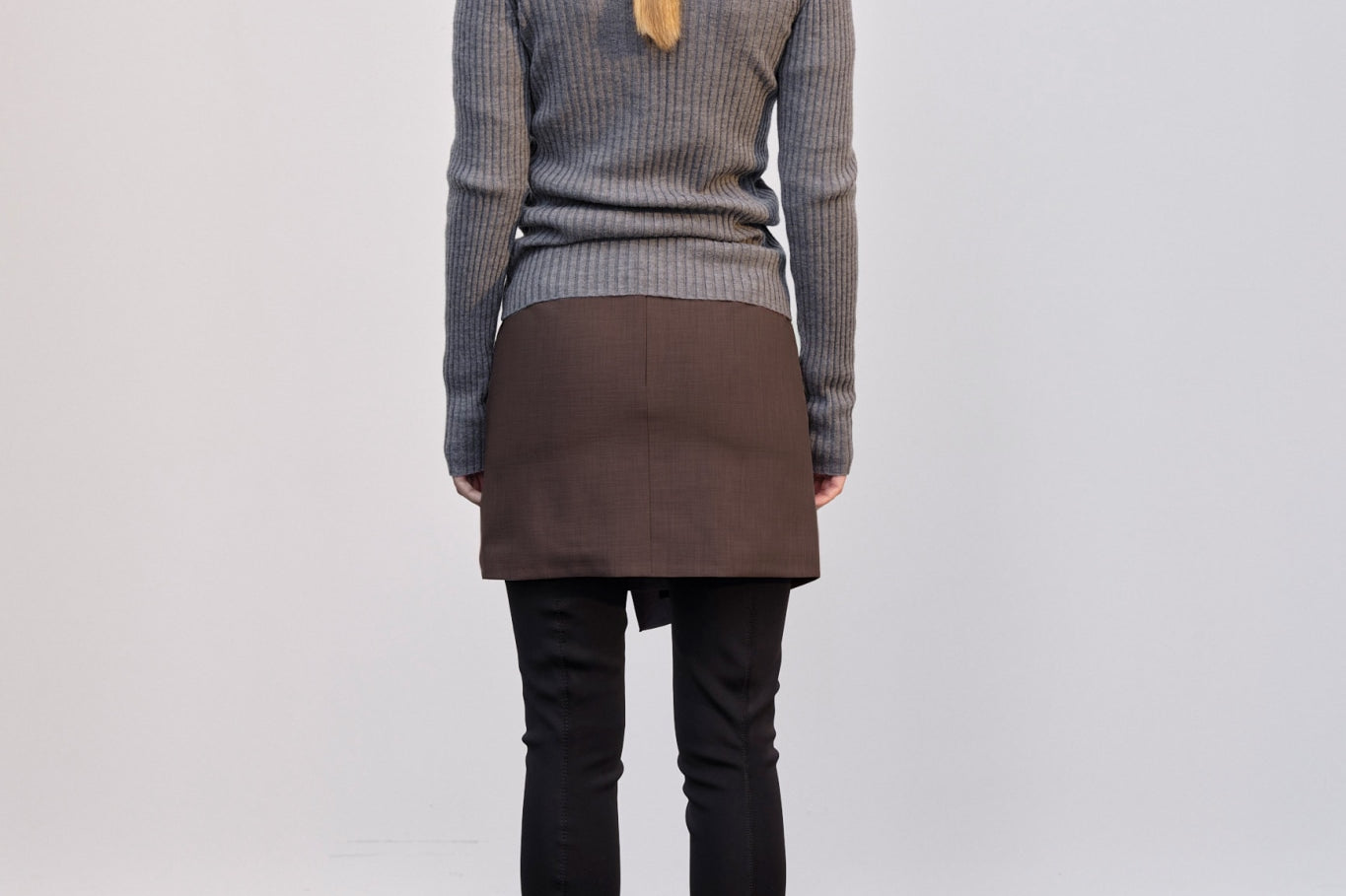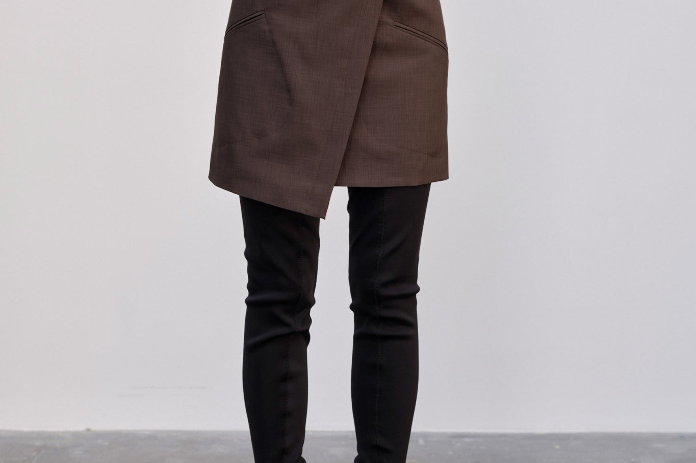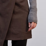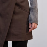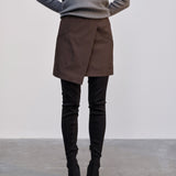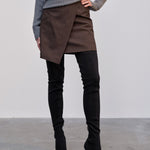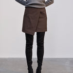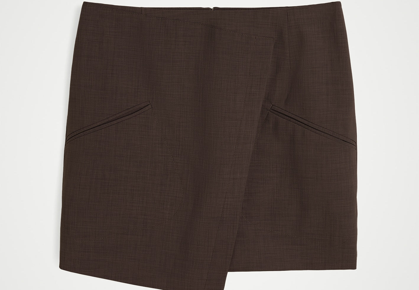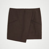 Introducing the Carolina Skirt: A mid-waisted skirt featuring a 'wrap' effect at the front, an asymmetrical bottom, and slanted paspel pockets at the front.