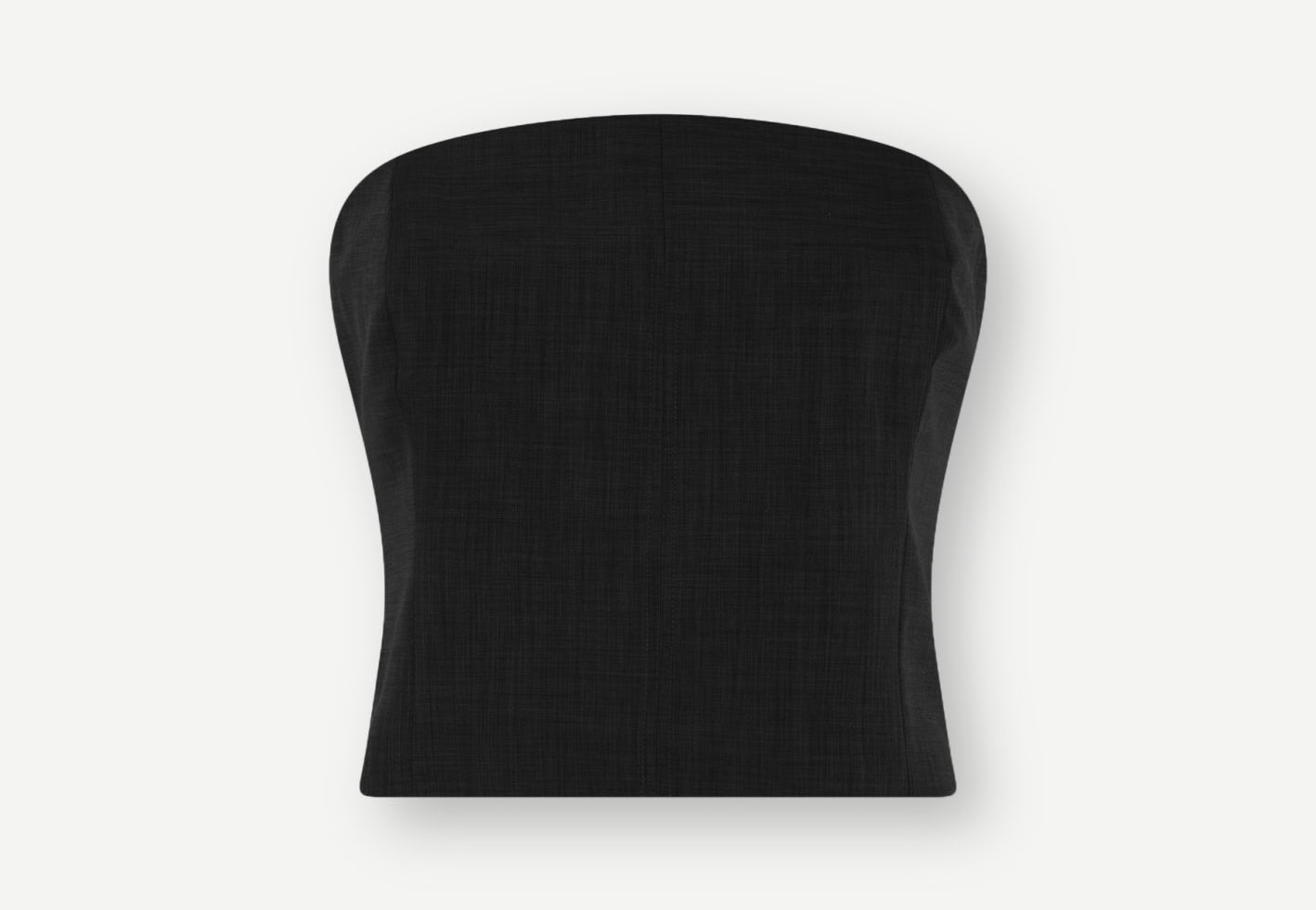 The Cosima Top is a bandeau corset top featuring vertical cutlines in the front and a zipper closure on the back.