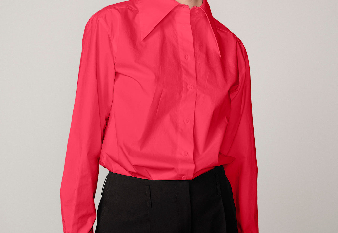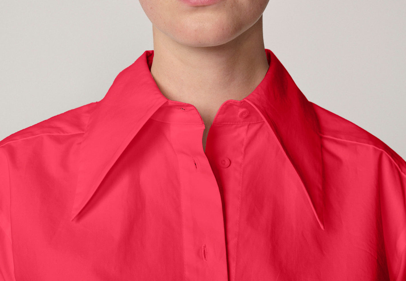 • Oversized pointed collar and button closure
