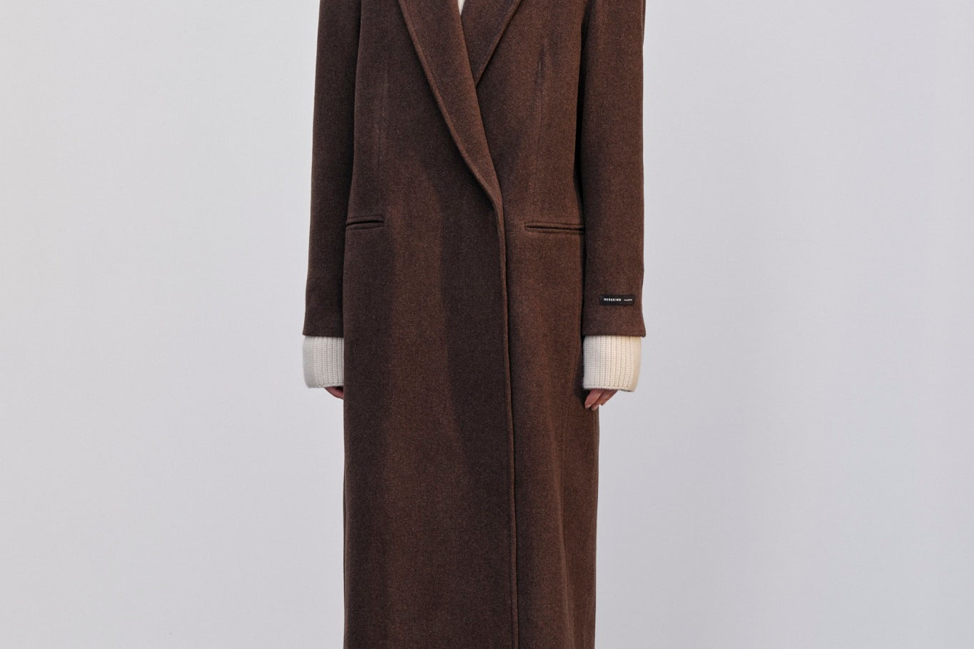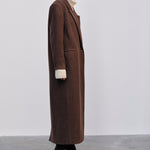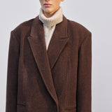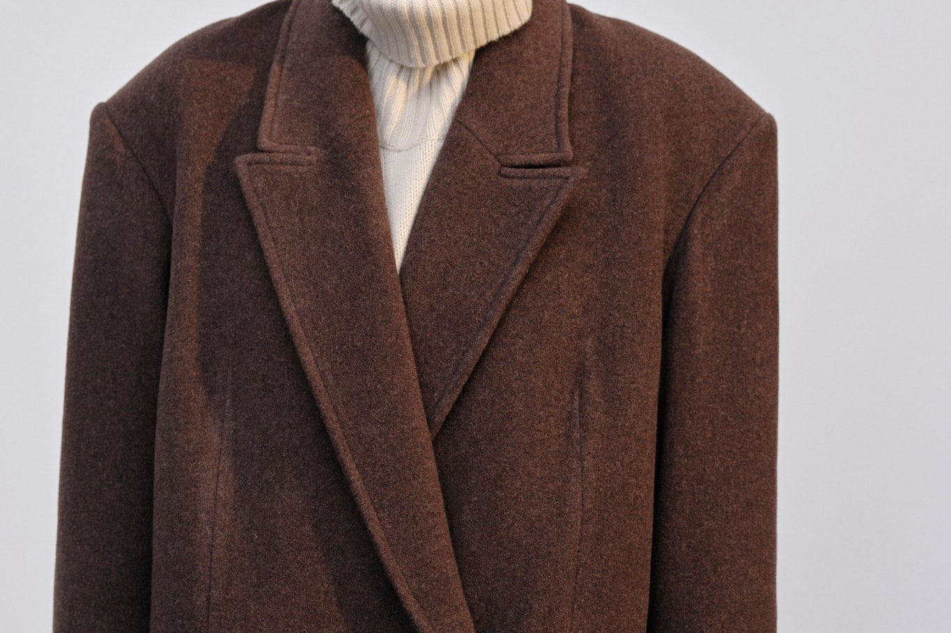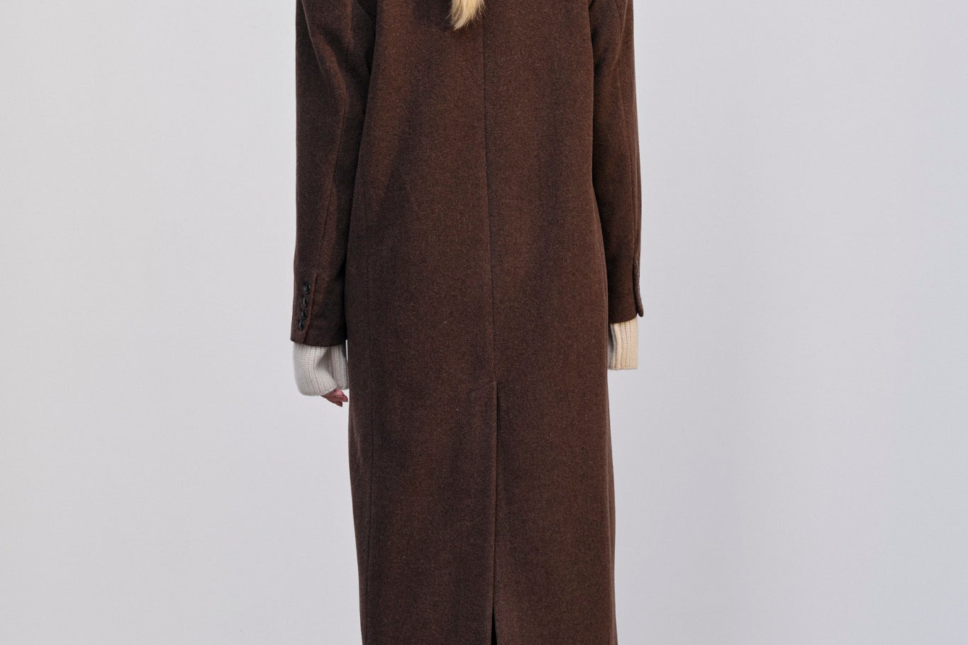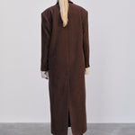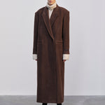 Introducing the Drew Coat: An oversized long coat with a double-breasted front, featuring big lapels, substantial shoulders, and a high slit at the back for added movement and style.