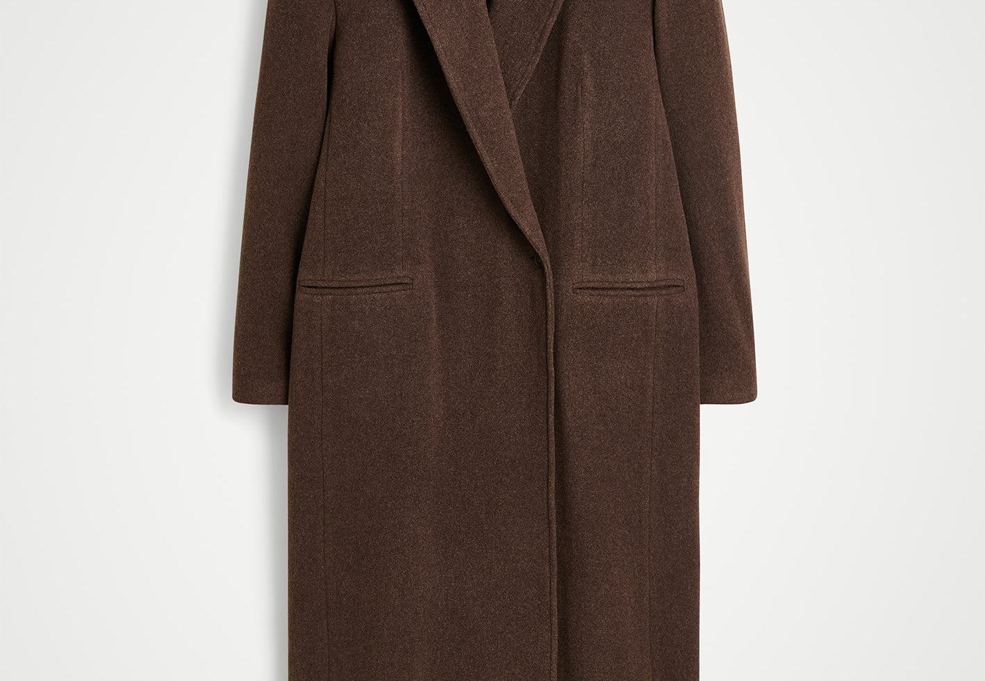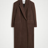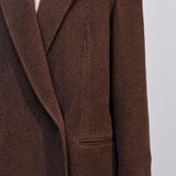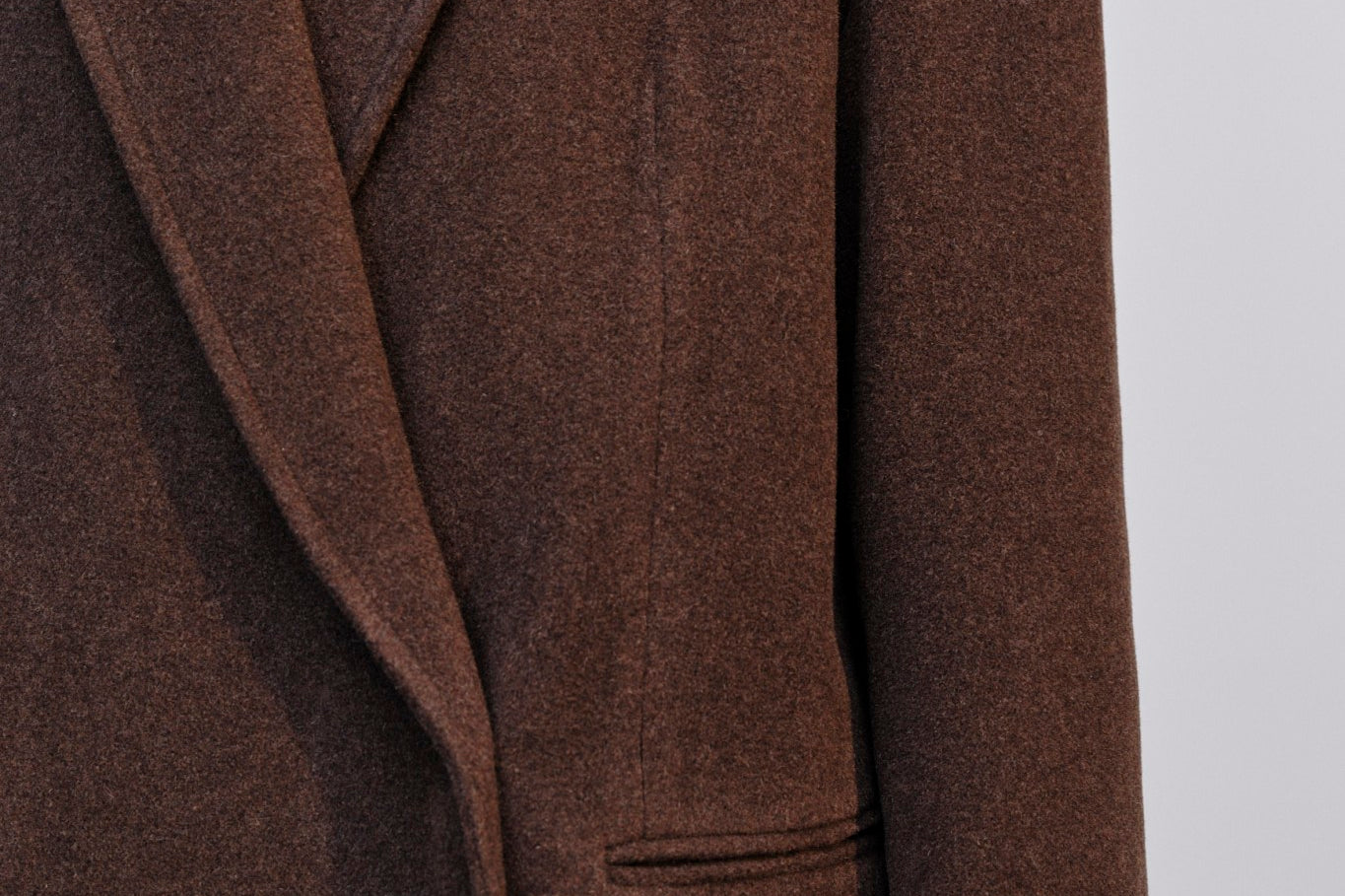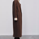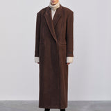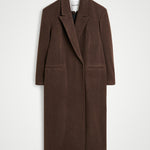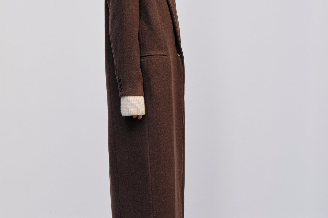 Introducing the Drew Coat: An oversized long coat with a double-breasted front, featuring big lapels, substantial shoulders, and a high slit at the back for added movement and style.