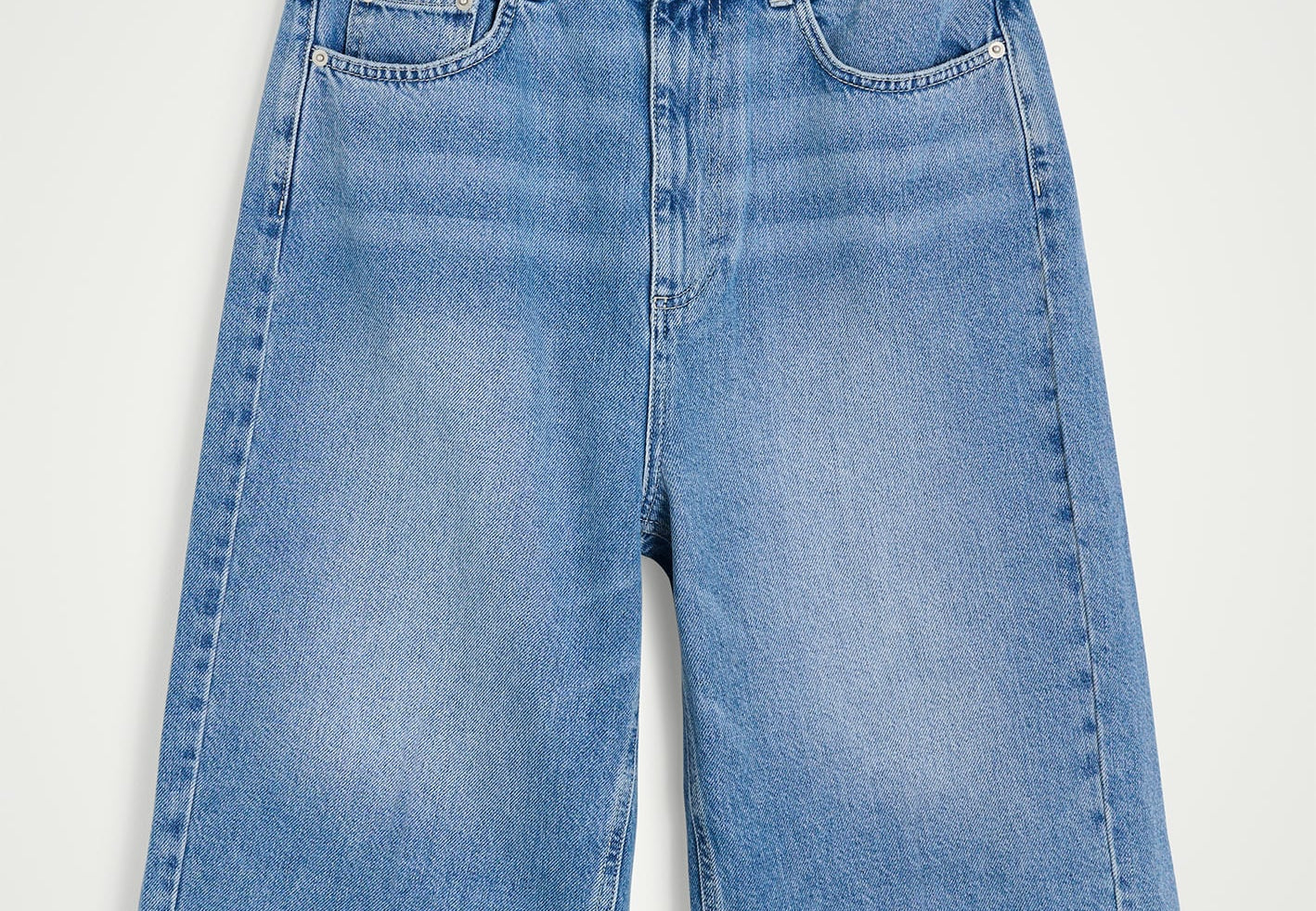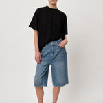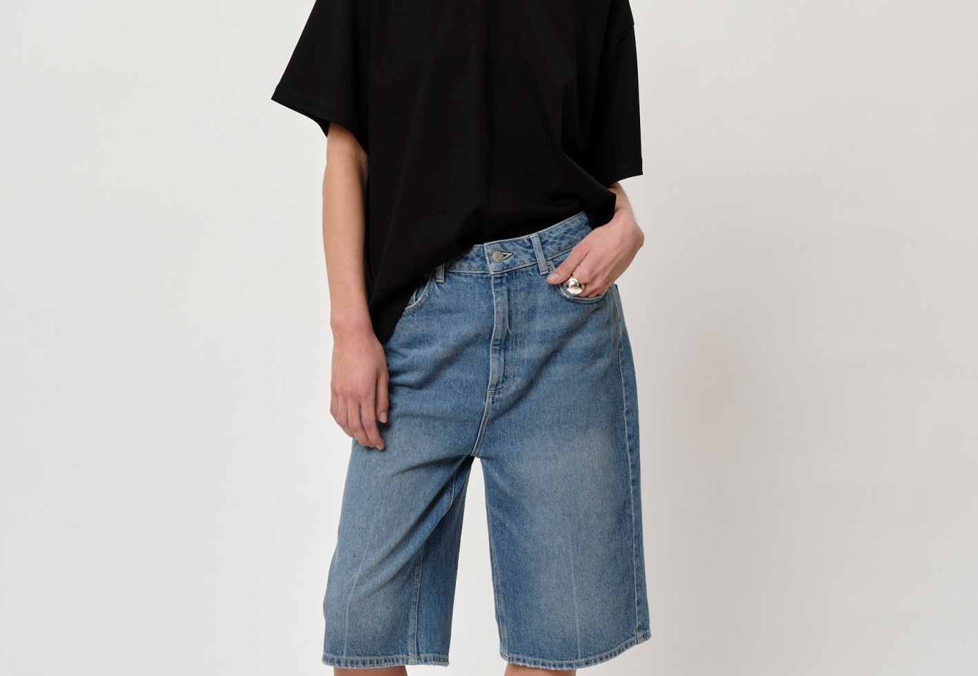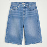 Introducing the Emily Denim Shorts: A pair of denim mid-waisted Bermuda shorts with a loose fit that hit at the knee.