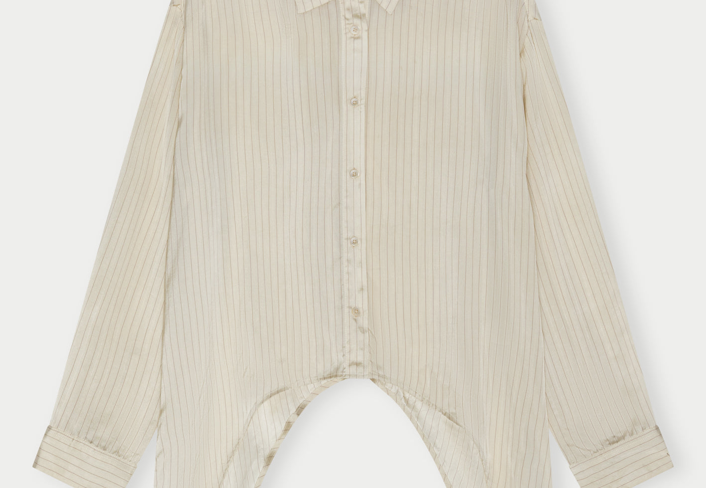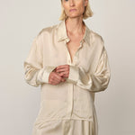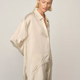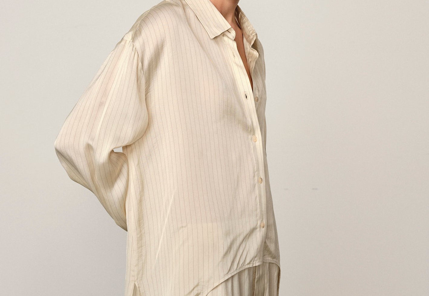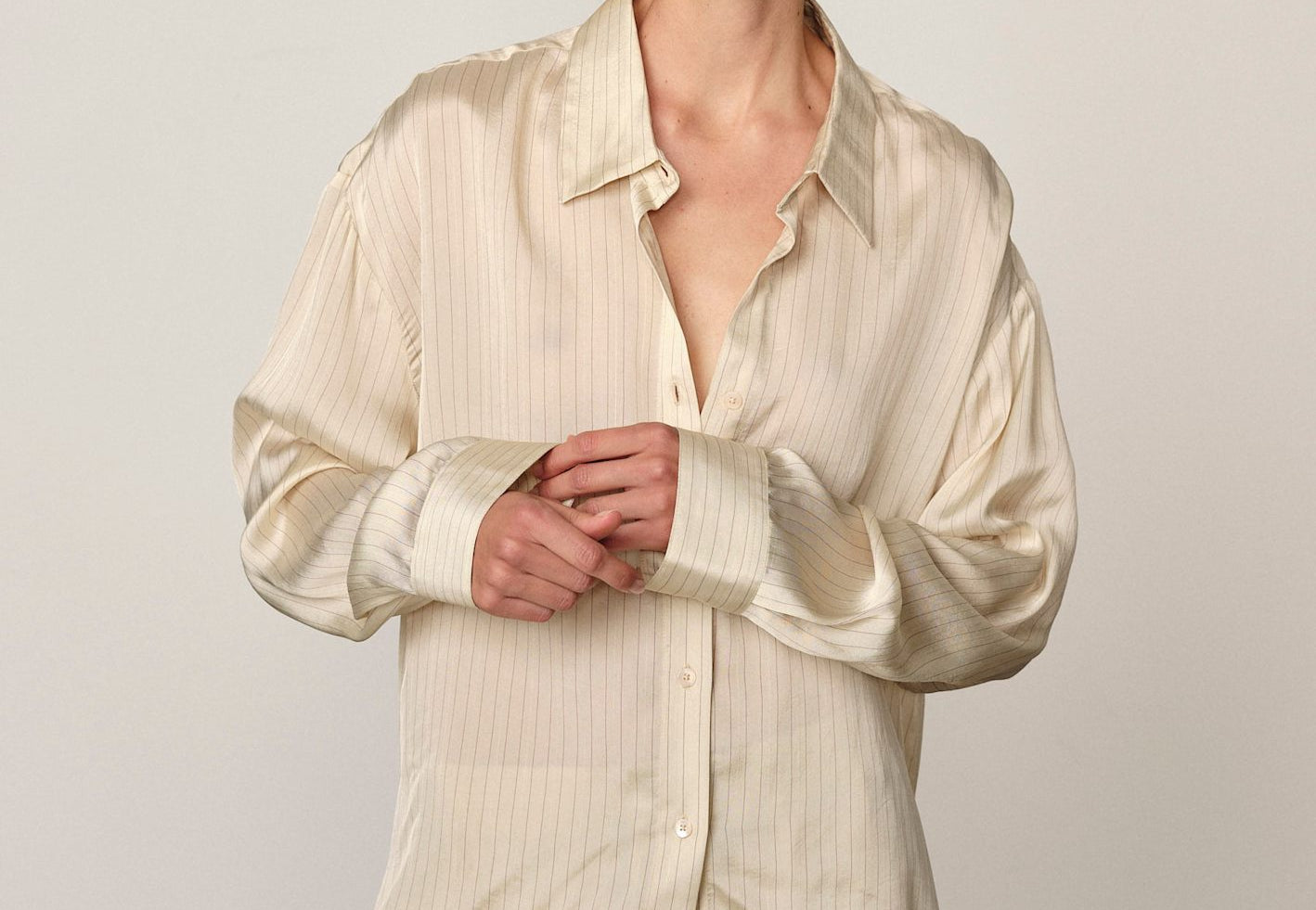 Defined by a loose silhouette with dropped shoulders, wide cuffs and subtle sheen. A timeless piece designed for effortless dressing — wear it tucked in or loose for a relaxed look.