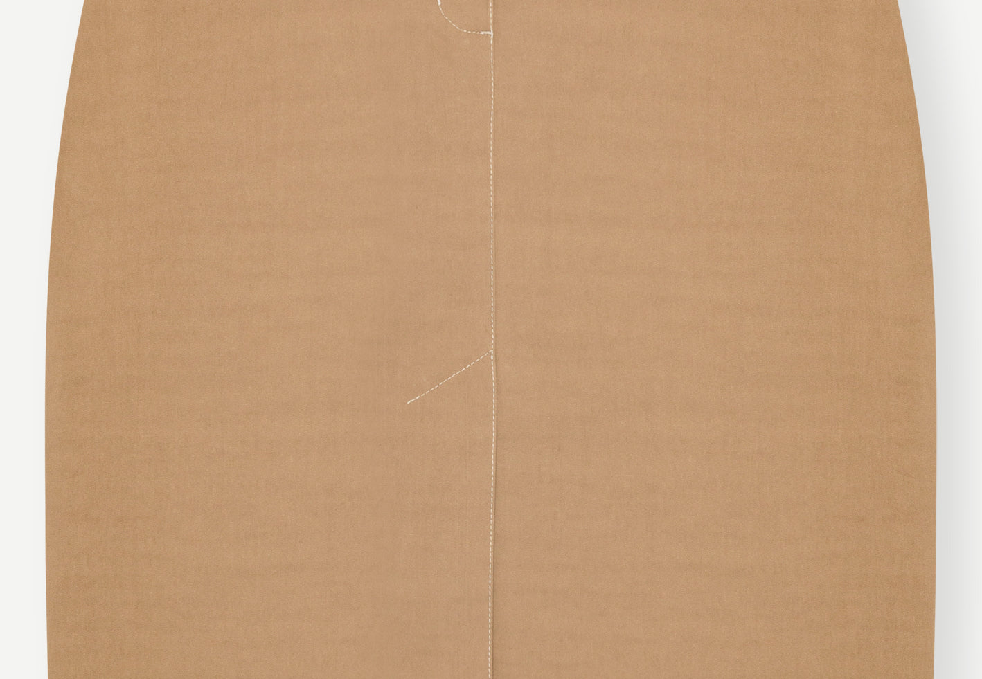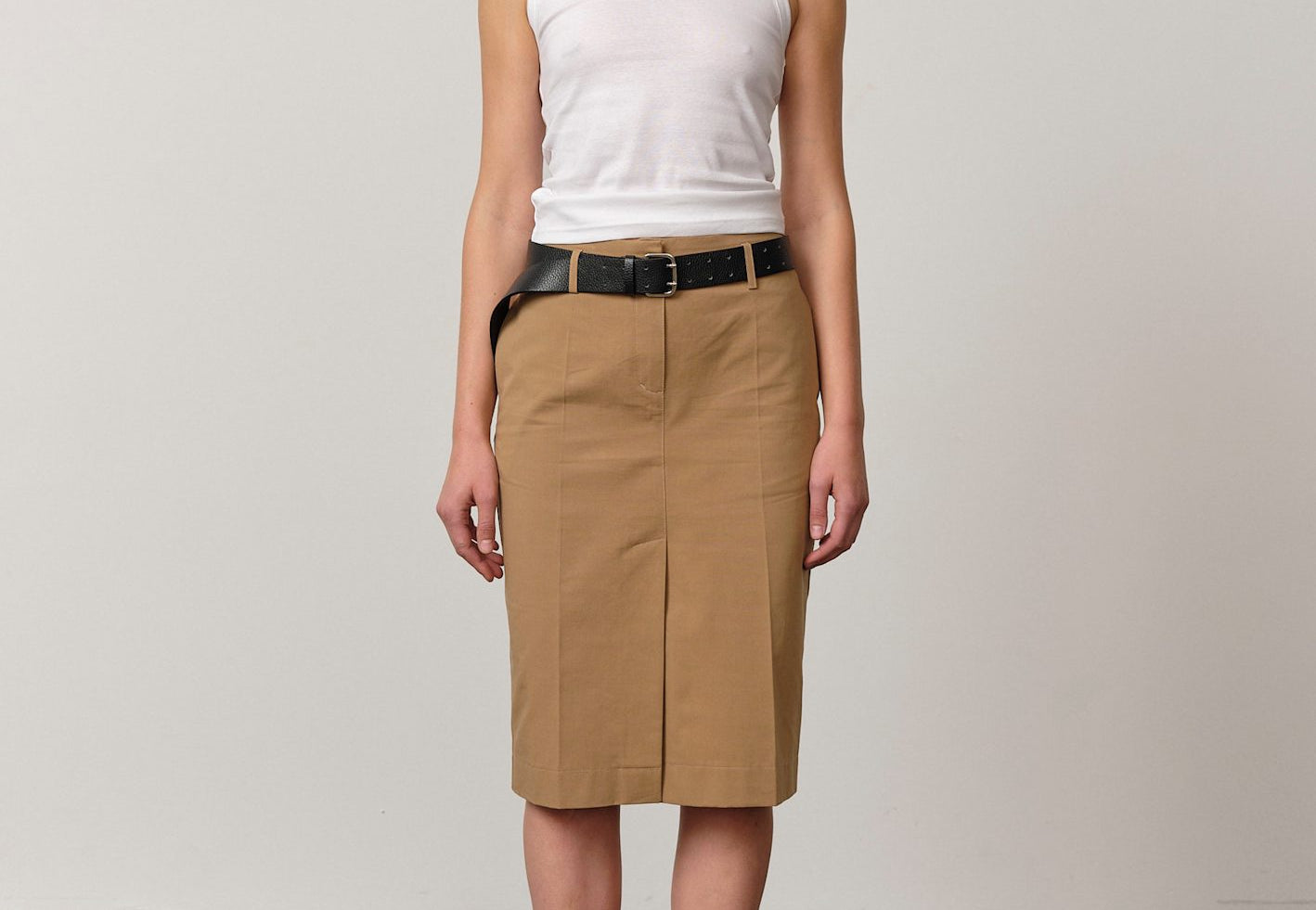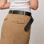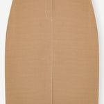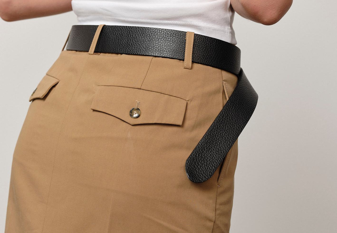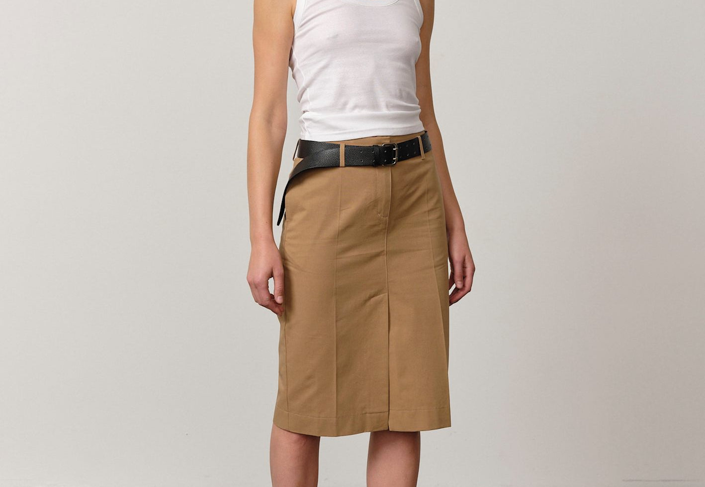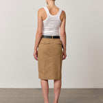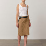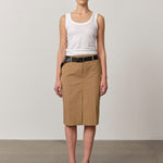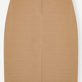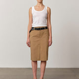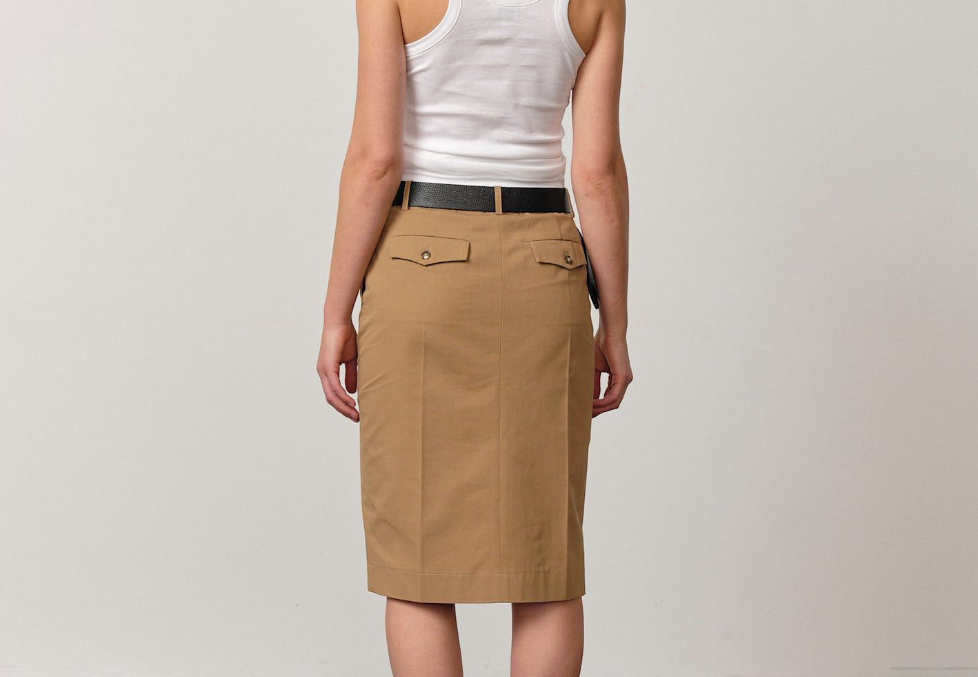Introducing the Grace Skirt: A midi skirt with a slit in the front, featuring crease lines at the front and back for a tailored look, and flap pockets at the back.