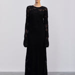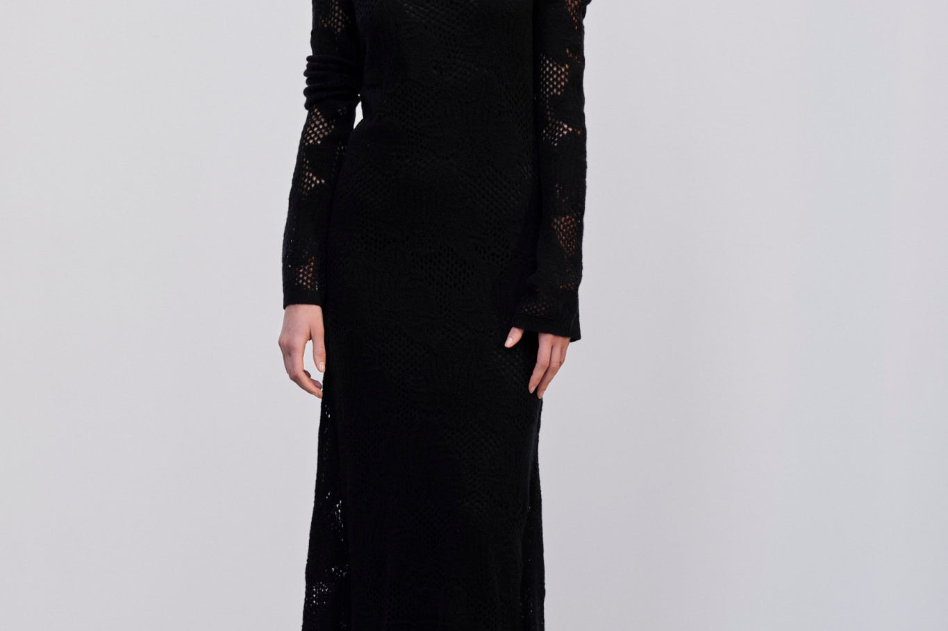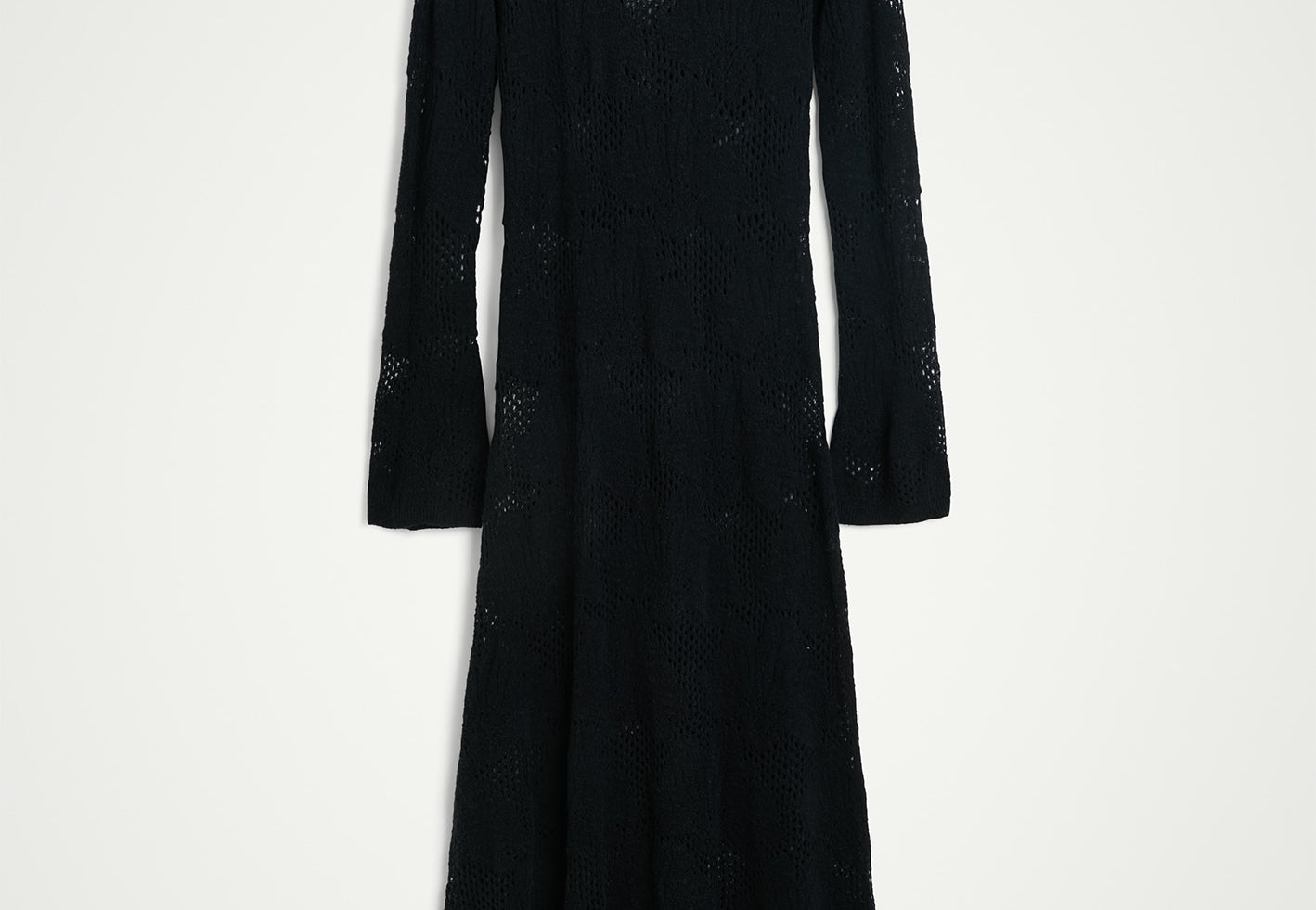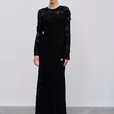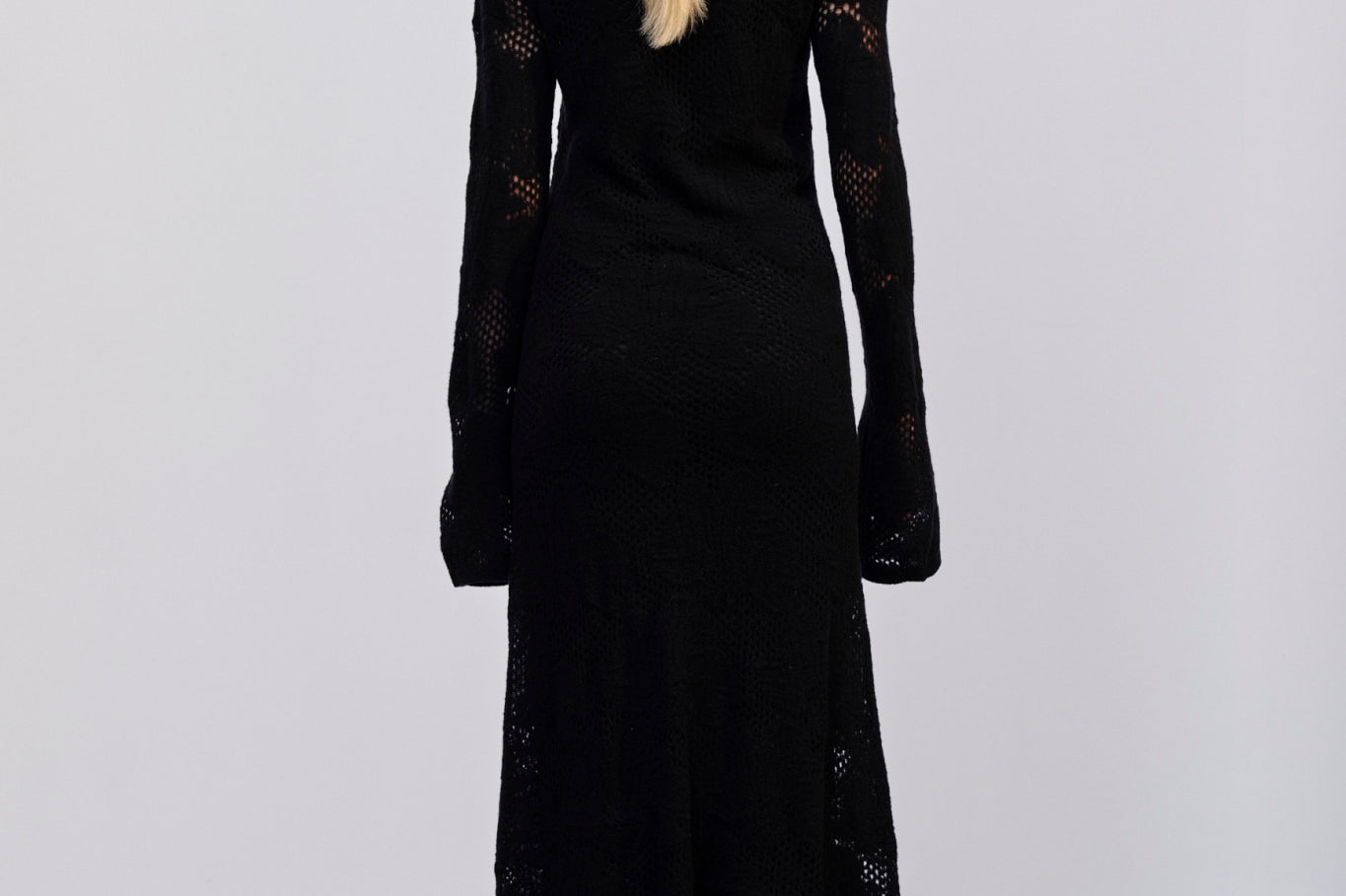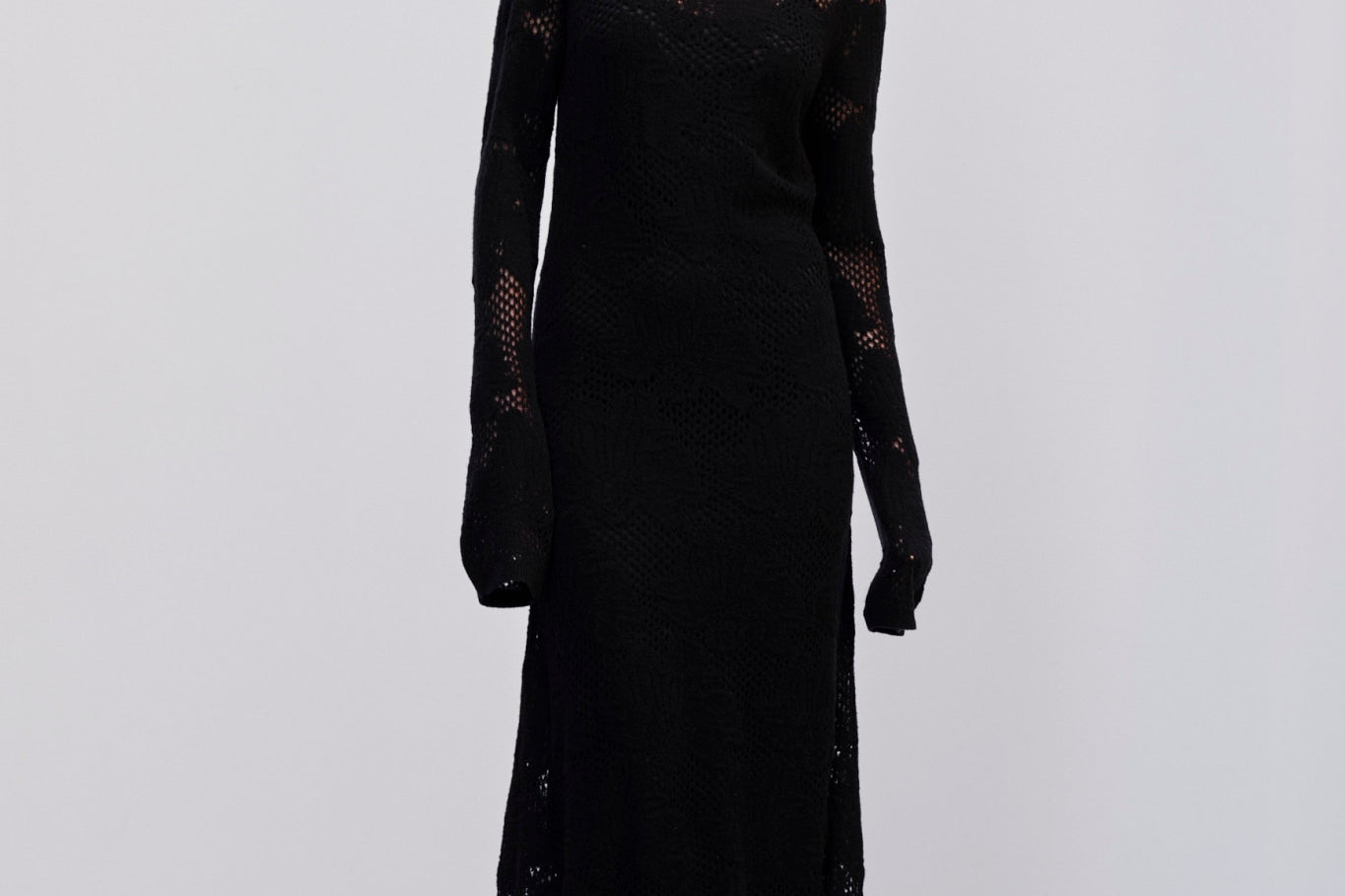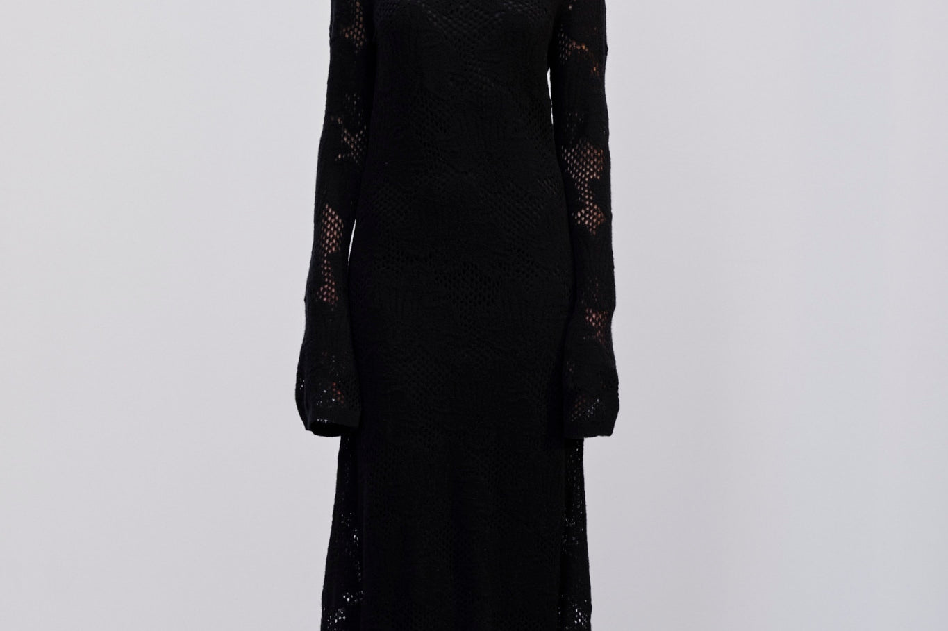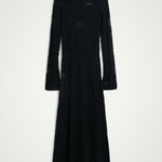 Introducing the Haely Knit Dress: A long knitted dress with a round neck, designed to fit tightly around the body and feature volume at the hem. It comes with an underdress