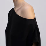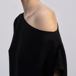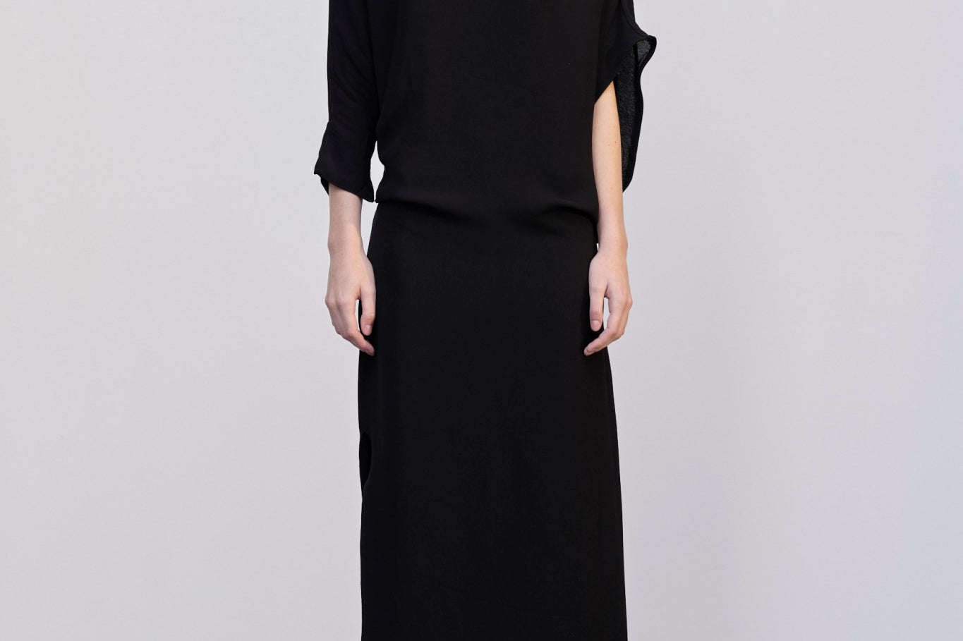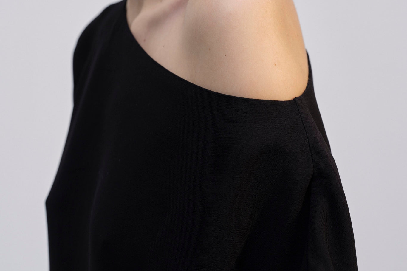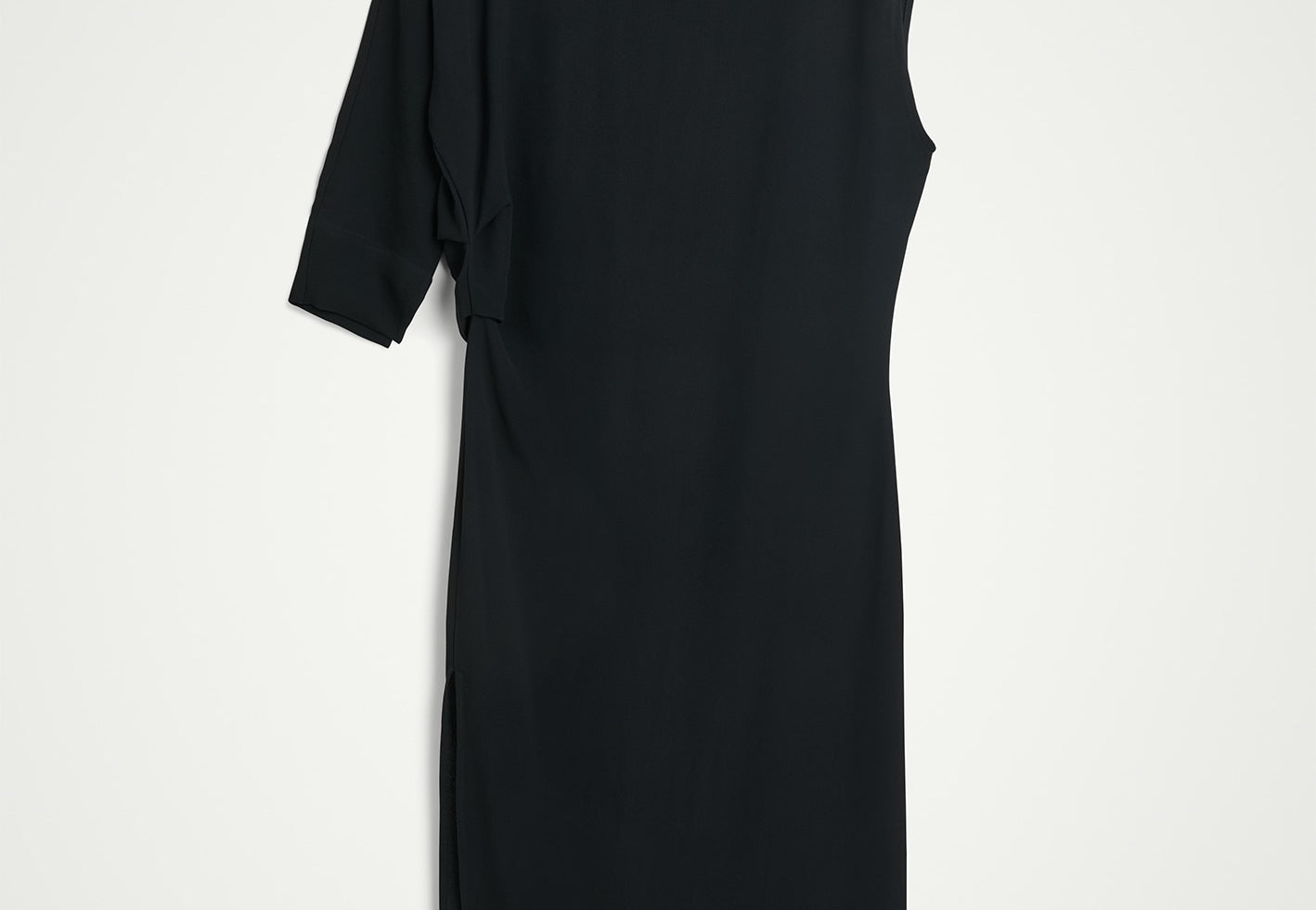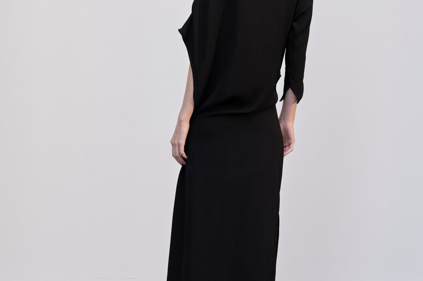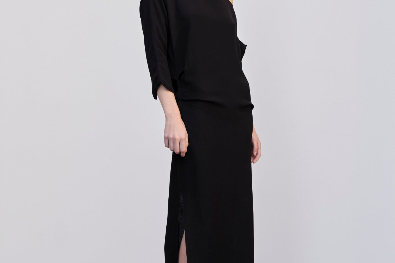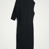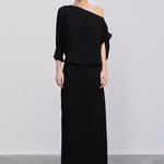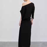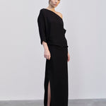 Introducing the Jazz Dress: An off-shoulder long draped dress with one sleeve extending to the elbow and a long slit at the side.
