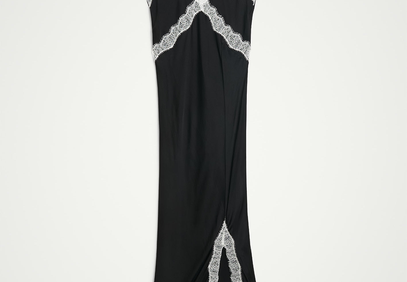 The Jonathan Dress is a slip-in midi dress with lace detail at the front and bottom. It includes a slit on the left side front.
