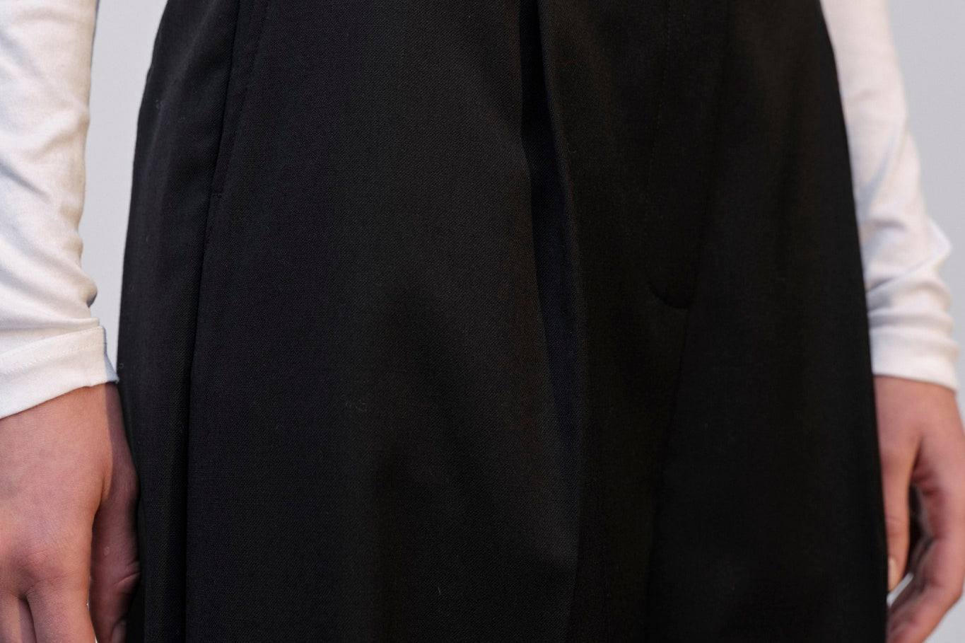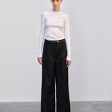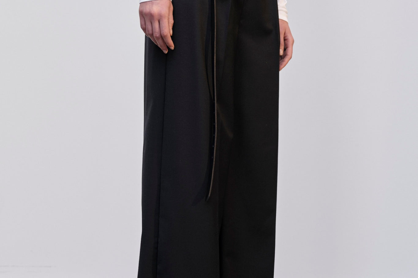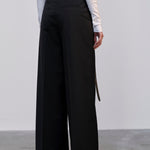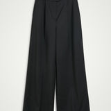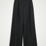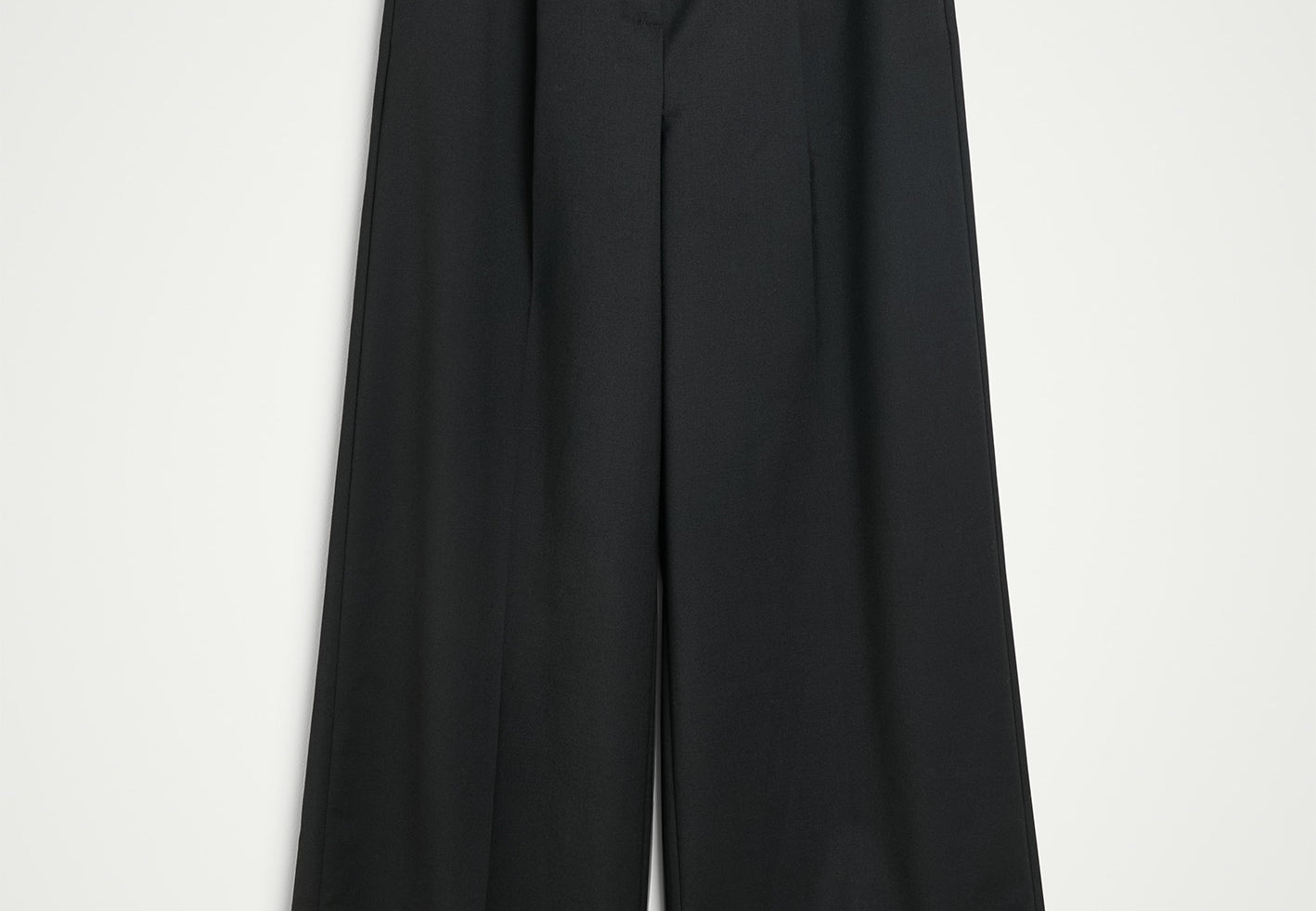 Introducing the Kelly Pants: Classic, mid-waisted long pants featuring two pleats at the front, a crease line for a tailored look, and a long cut.