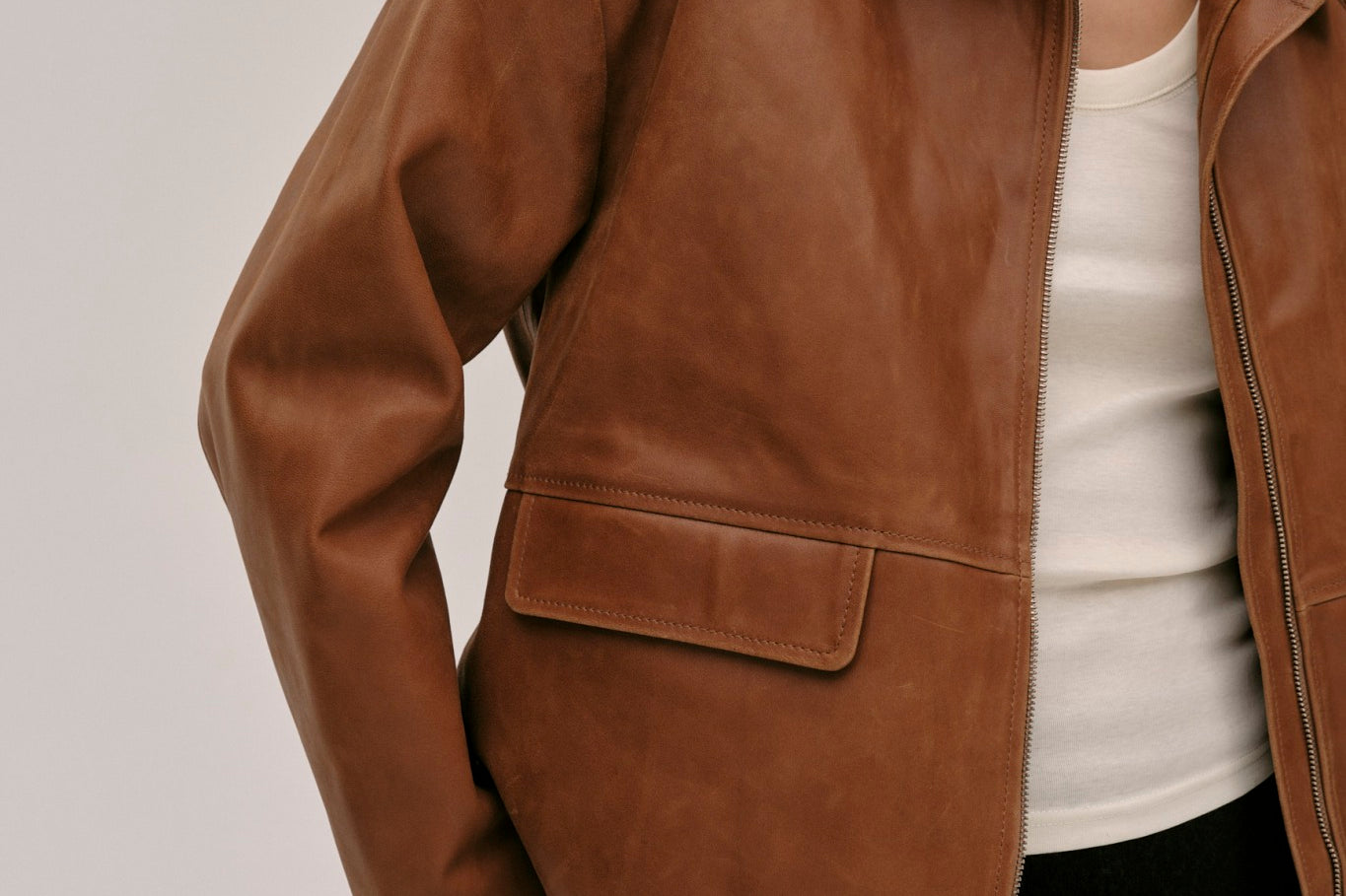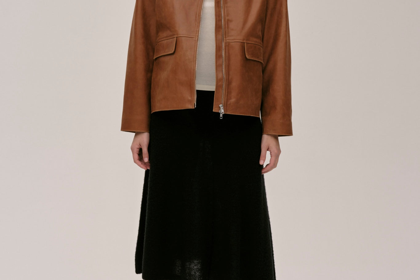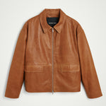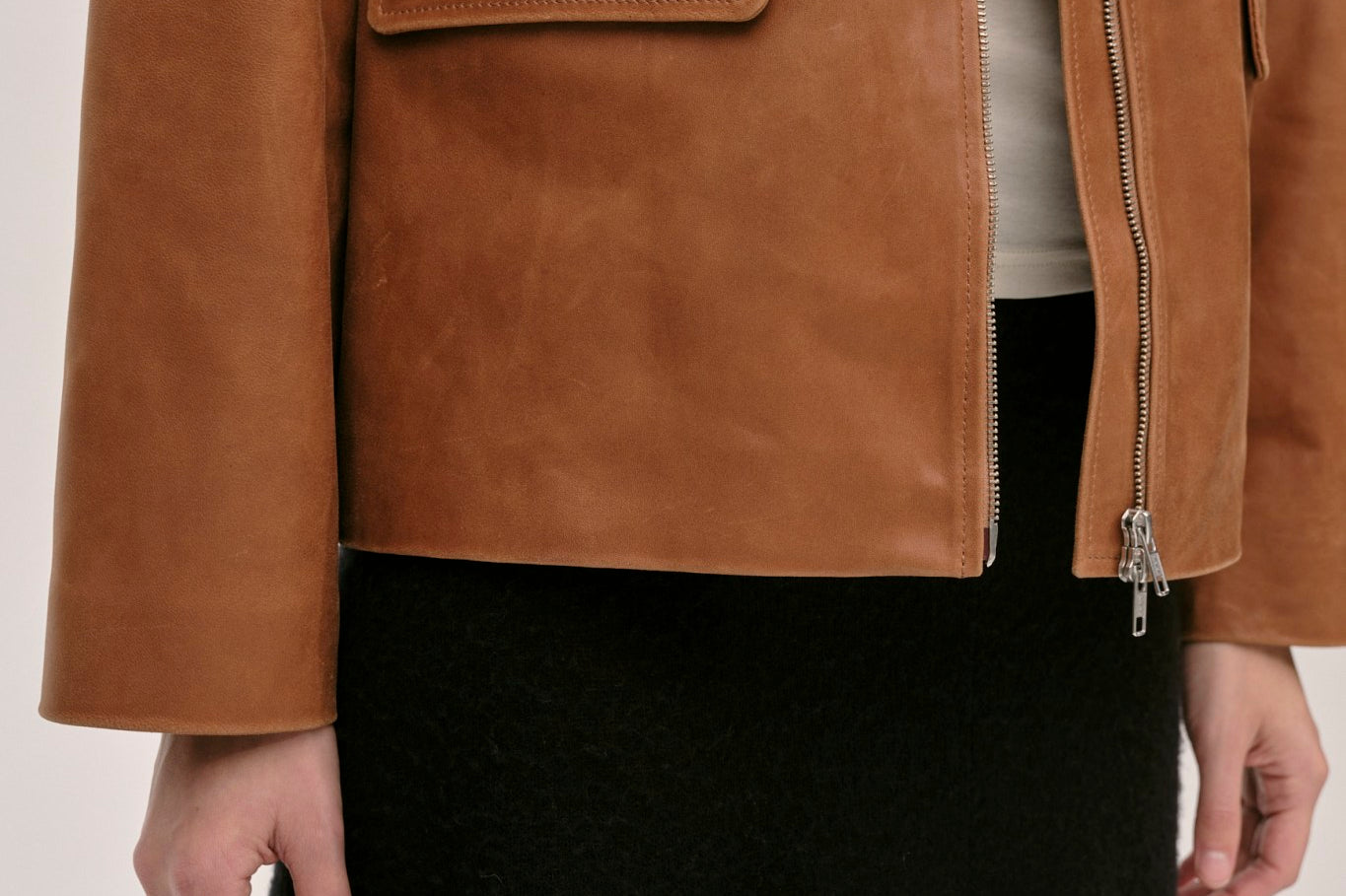 The Kurt Jacket is a leather jacket with a zipper closure, a round neck with collar, and a cutline at the front. It also includes two flap pockets at the front.