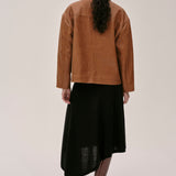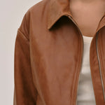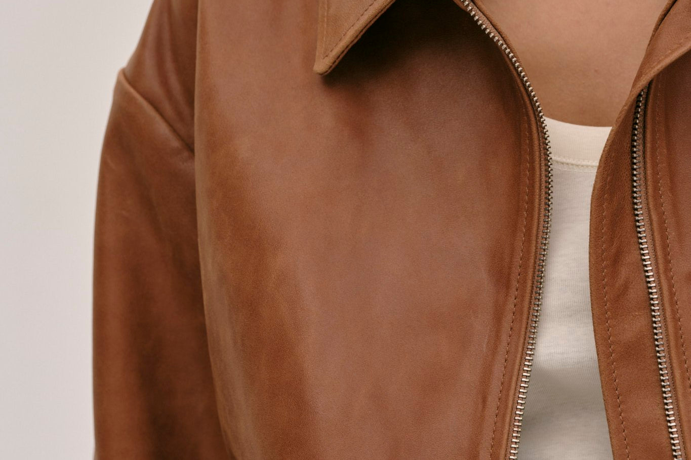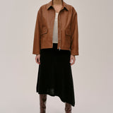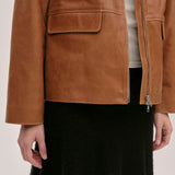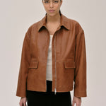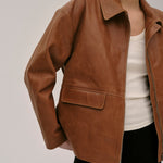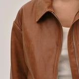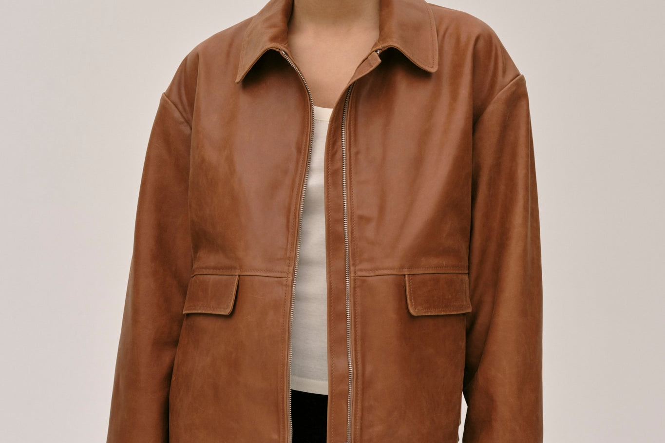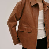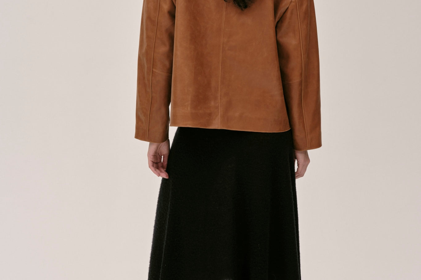 The Kurt Jacket is a leather jacket with a zipper closure, a round neck with collar, and a cutline at the front. It also includes two flap pockets at the front.