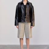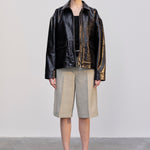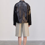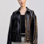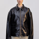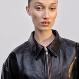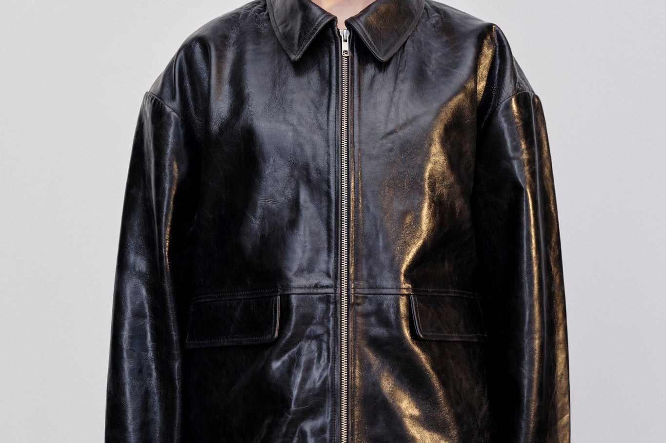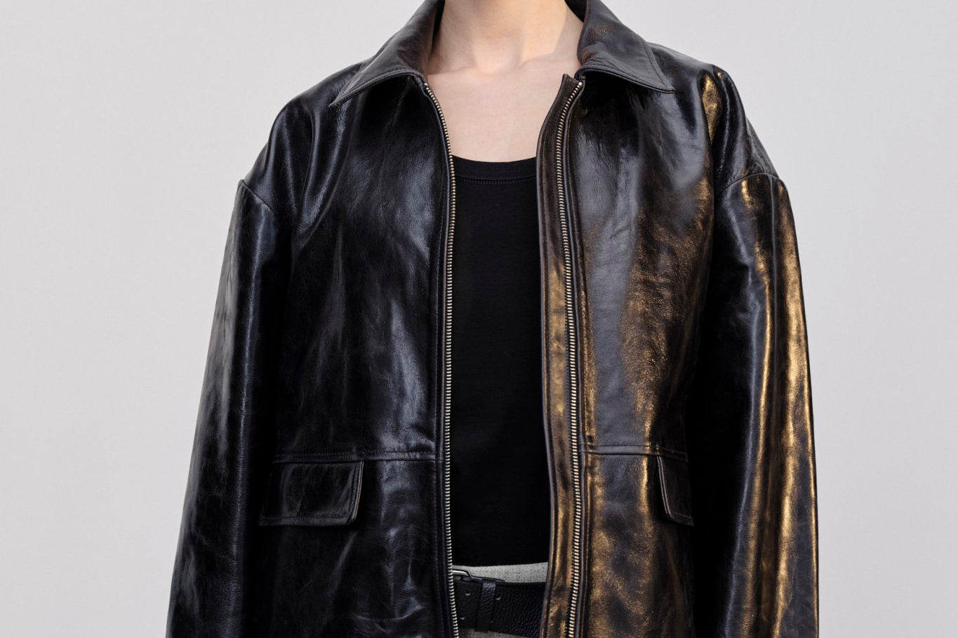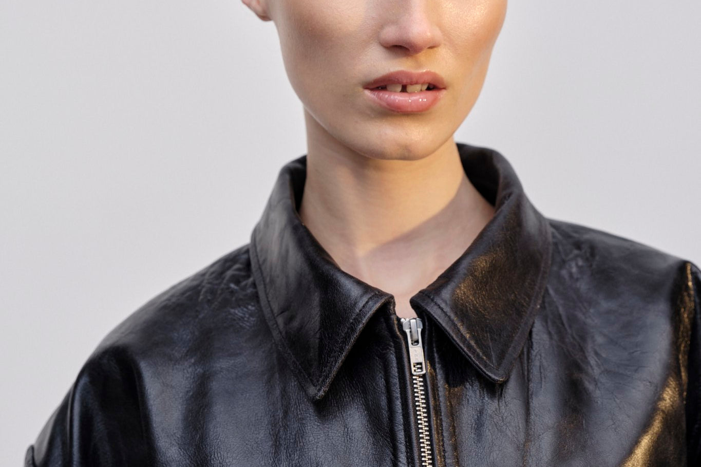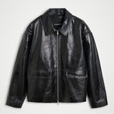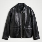 Introducing the Kurt Leather Jacket: A leather jacket with a zipper, featuring a round neck with collar, cutline at the front, and two flap pockets at the front.