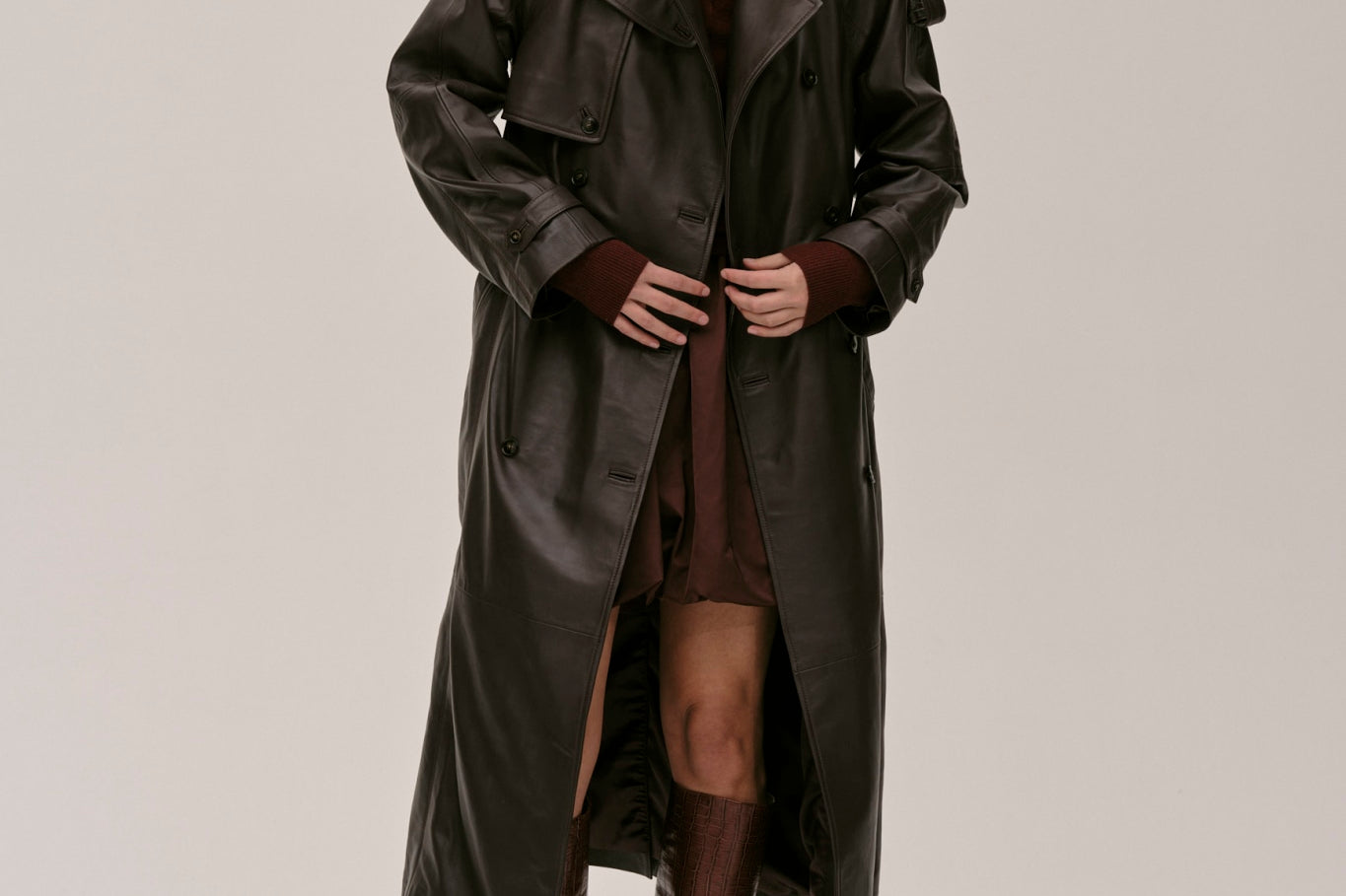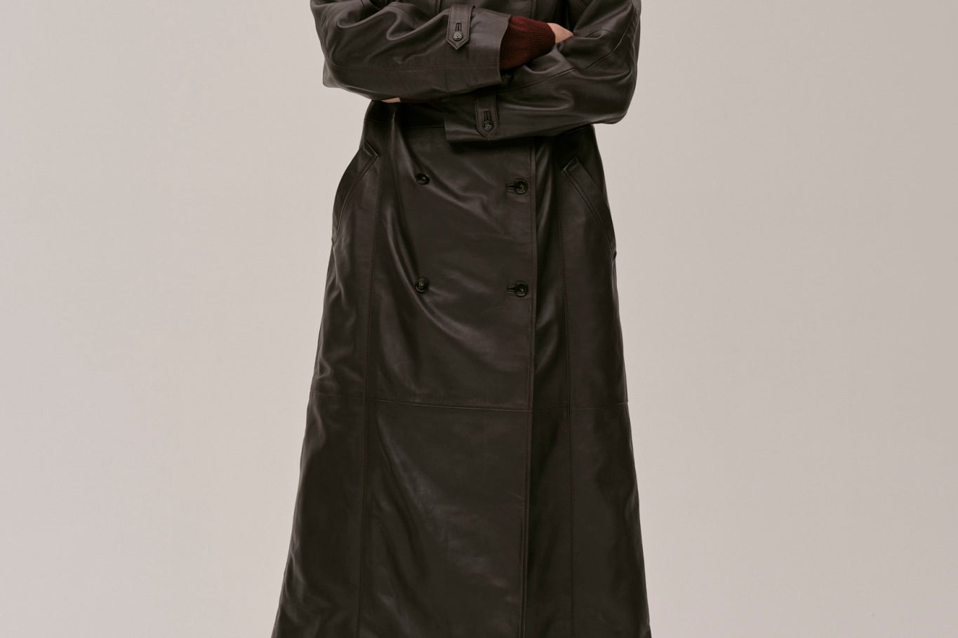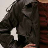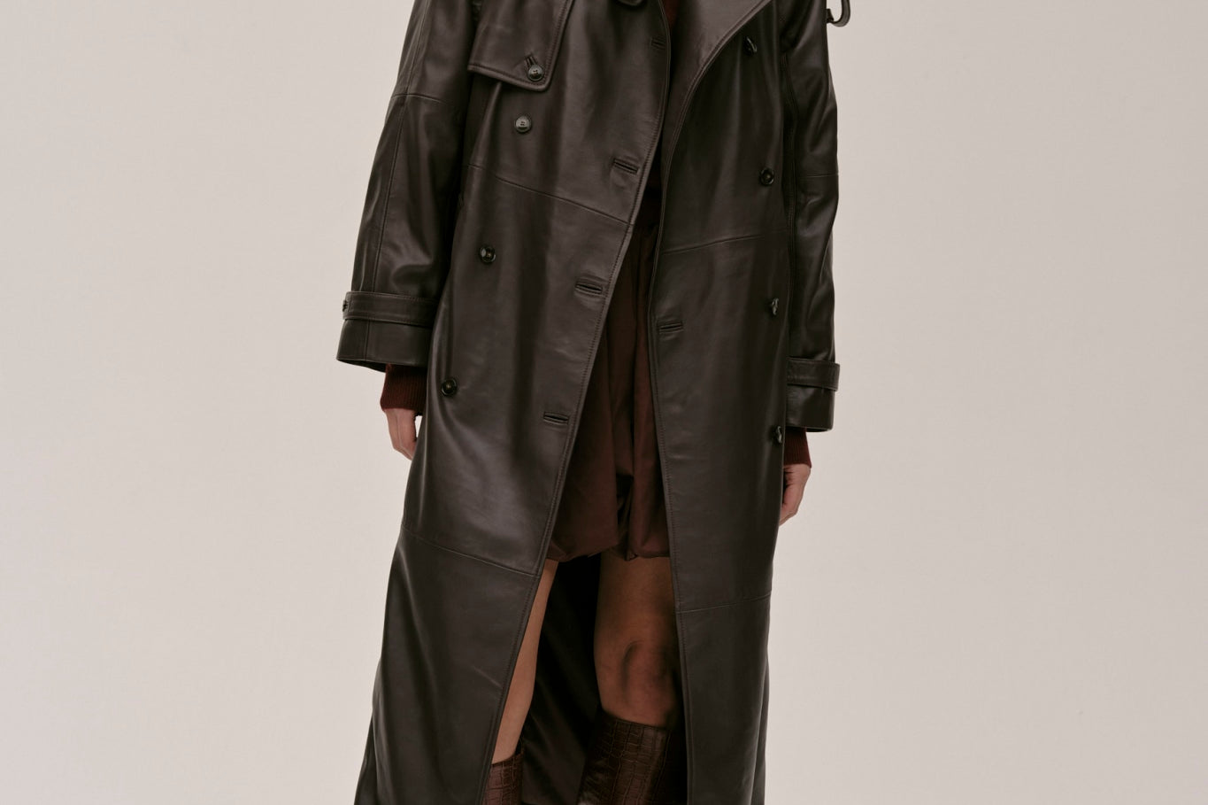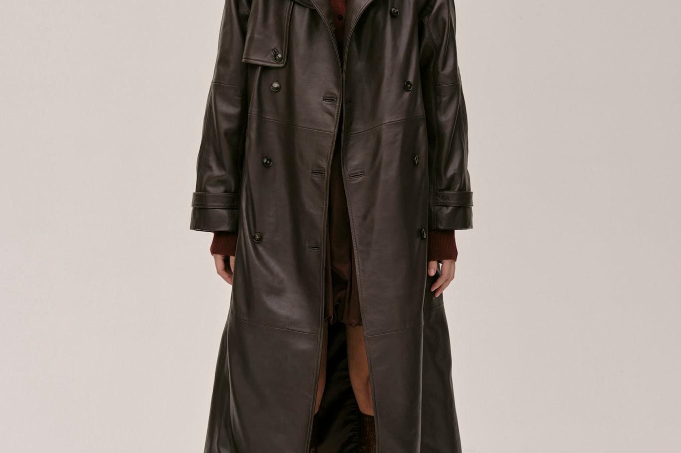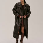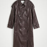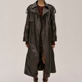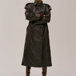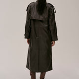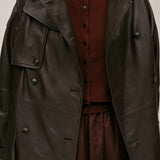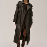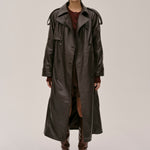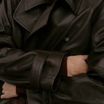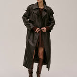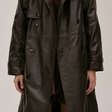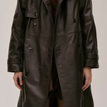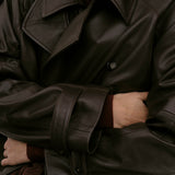 The Lima Trenchcoat is a long leather biker jacket with a double-breasted closure front, raglan shoulders, and a belt. It features a slit at the back.