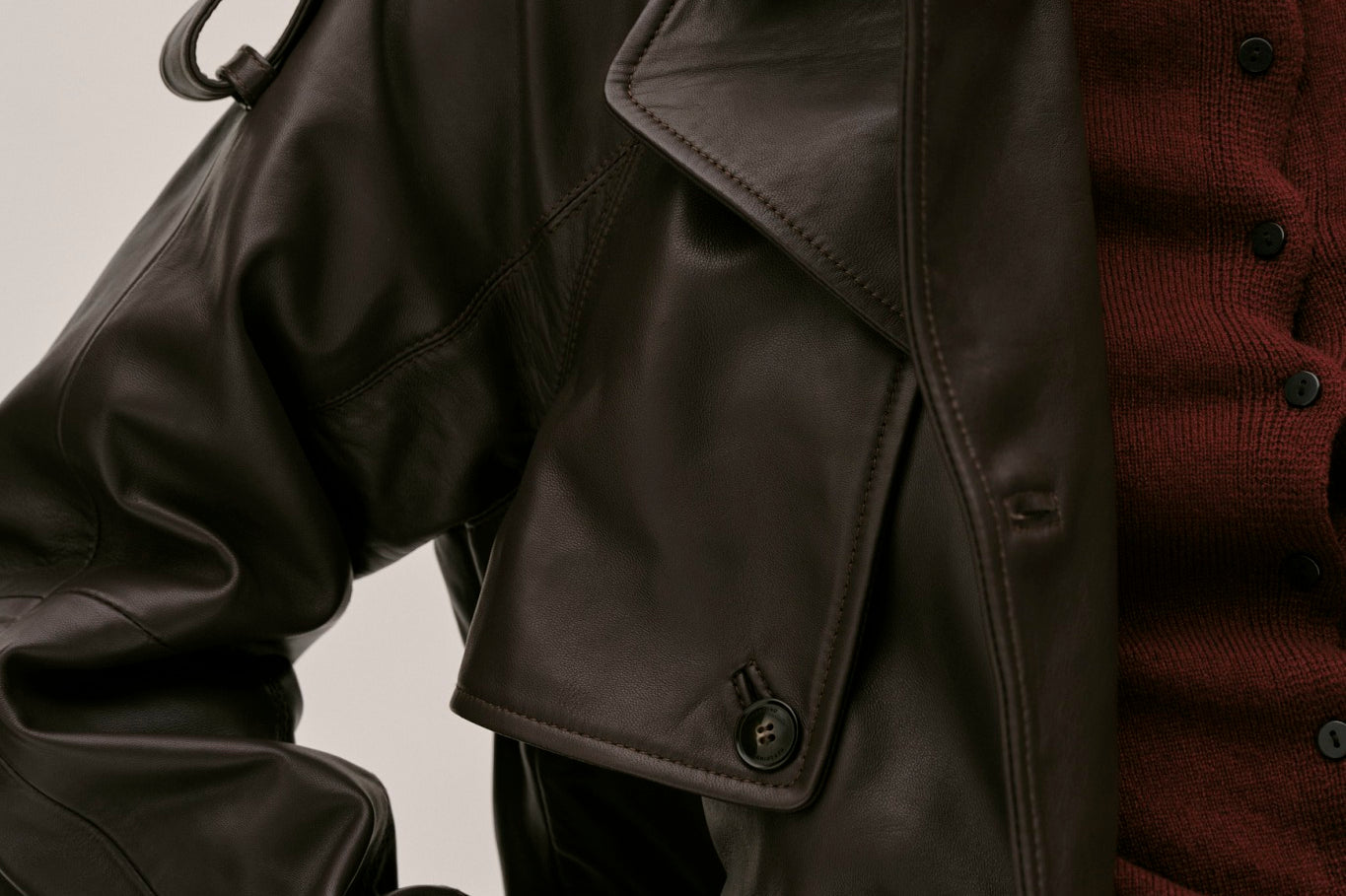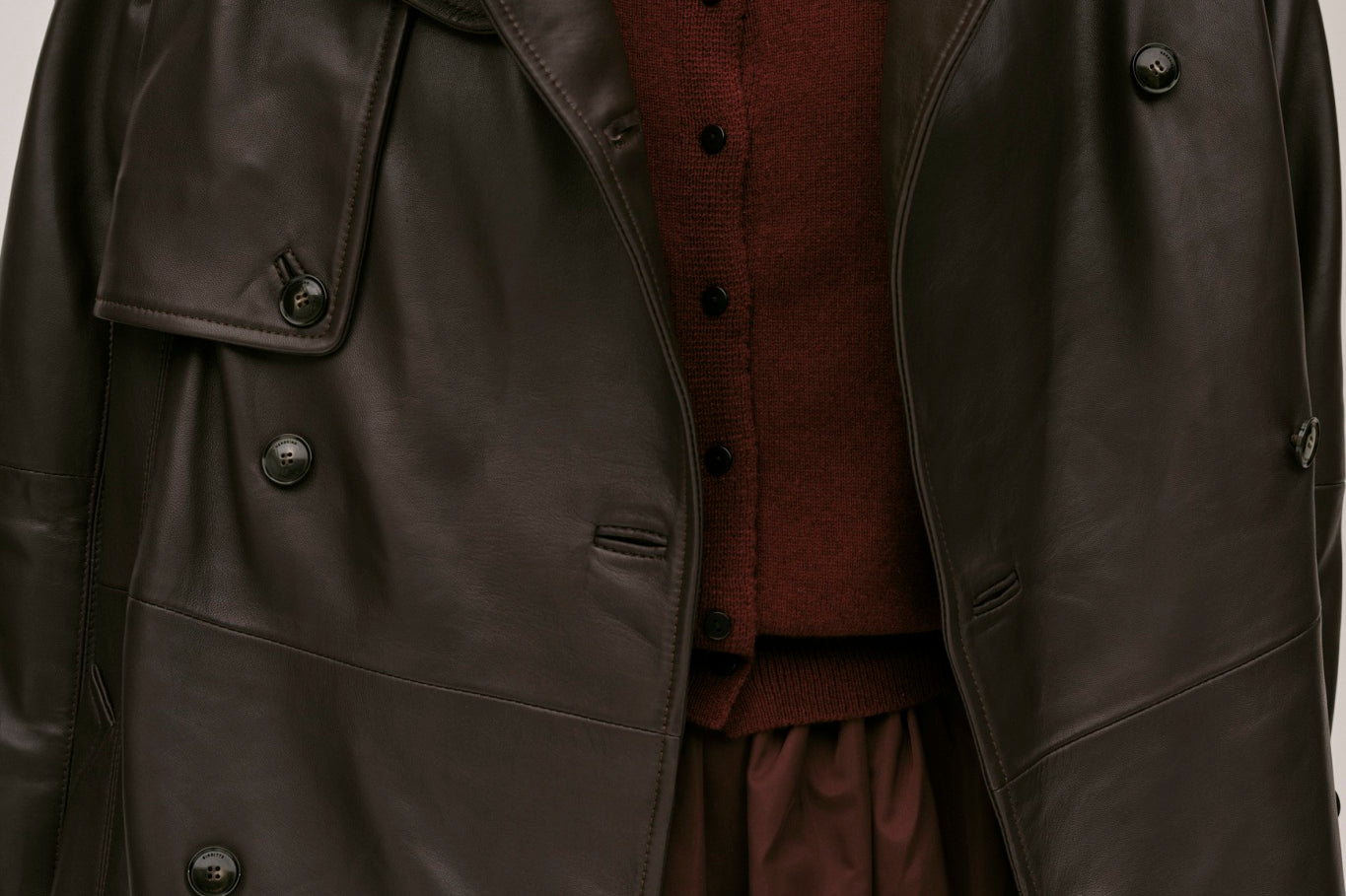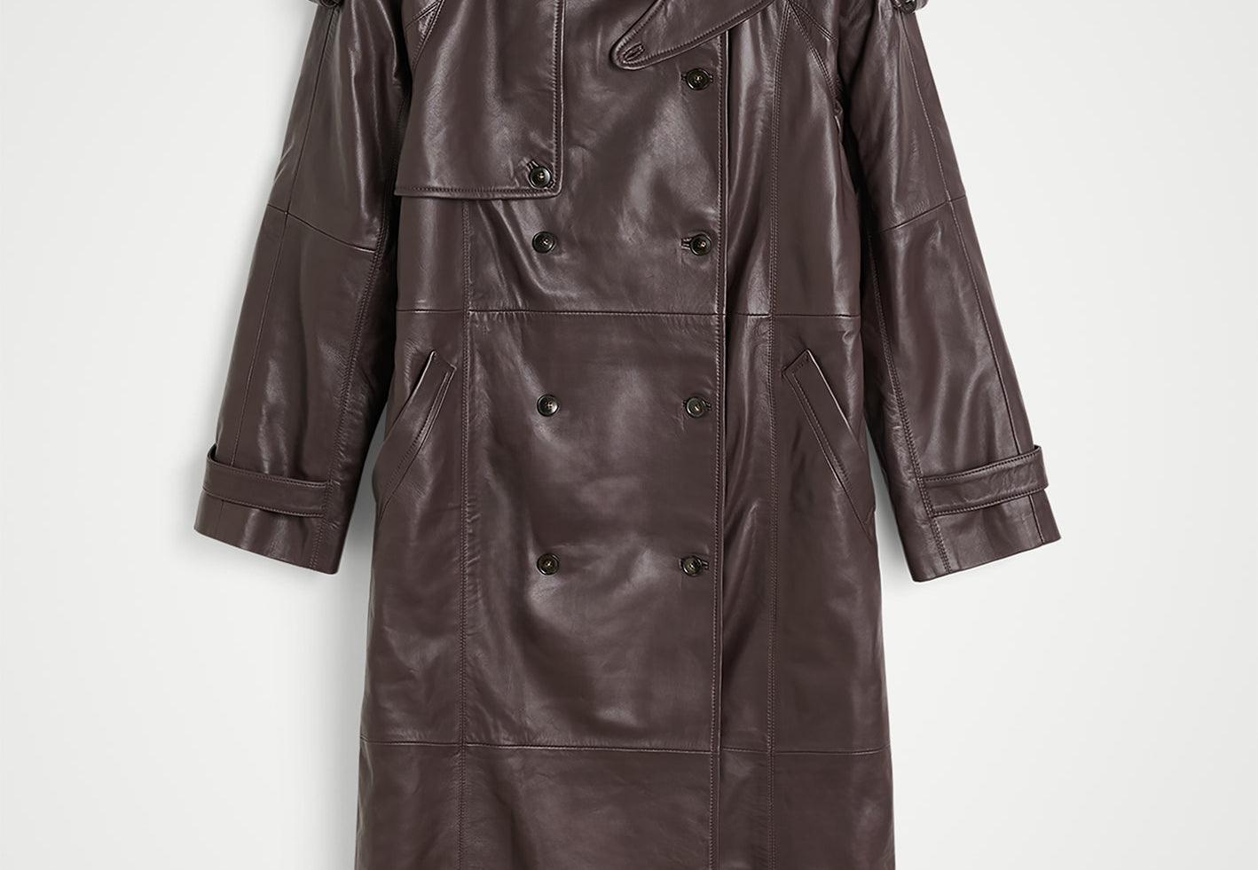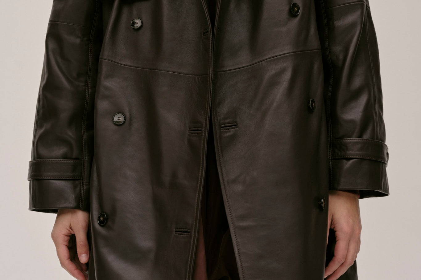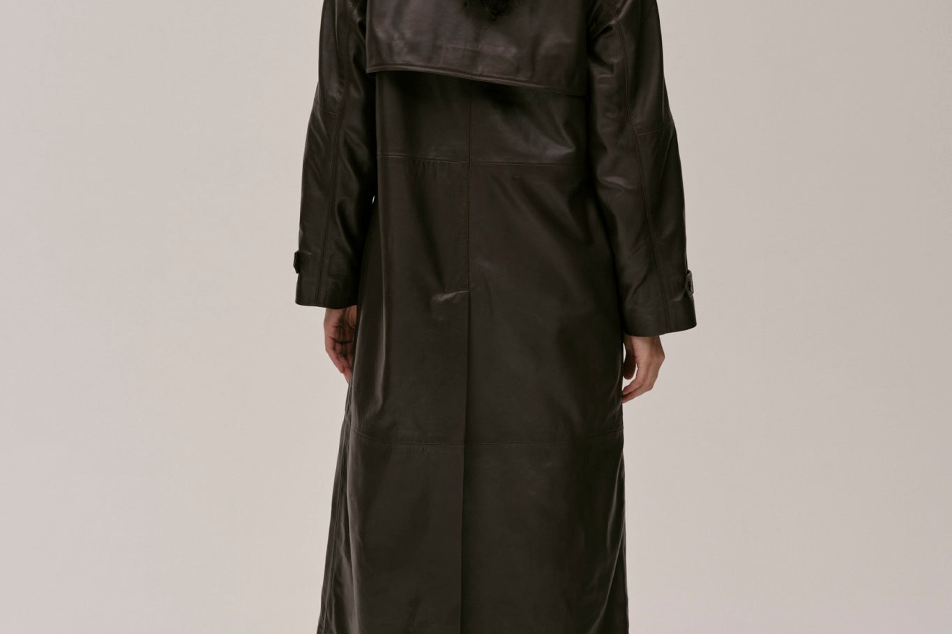 The Lima Trenchcoat is a long leather biker jacket with a double-breasted closure front, raglan shoulders, and a belt. It features a slit at the back.