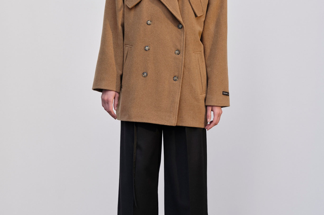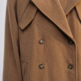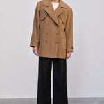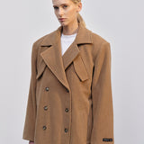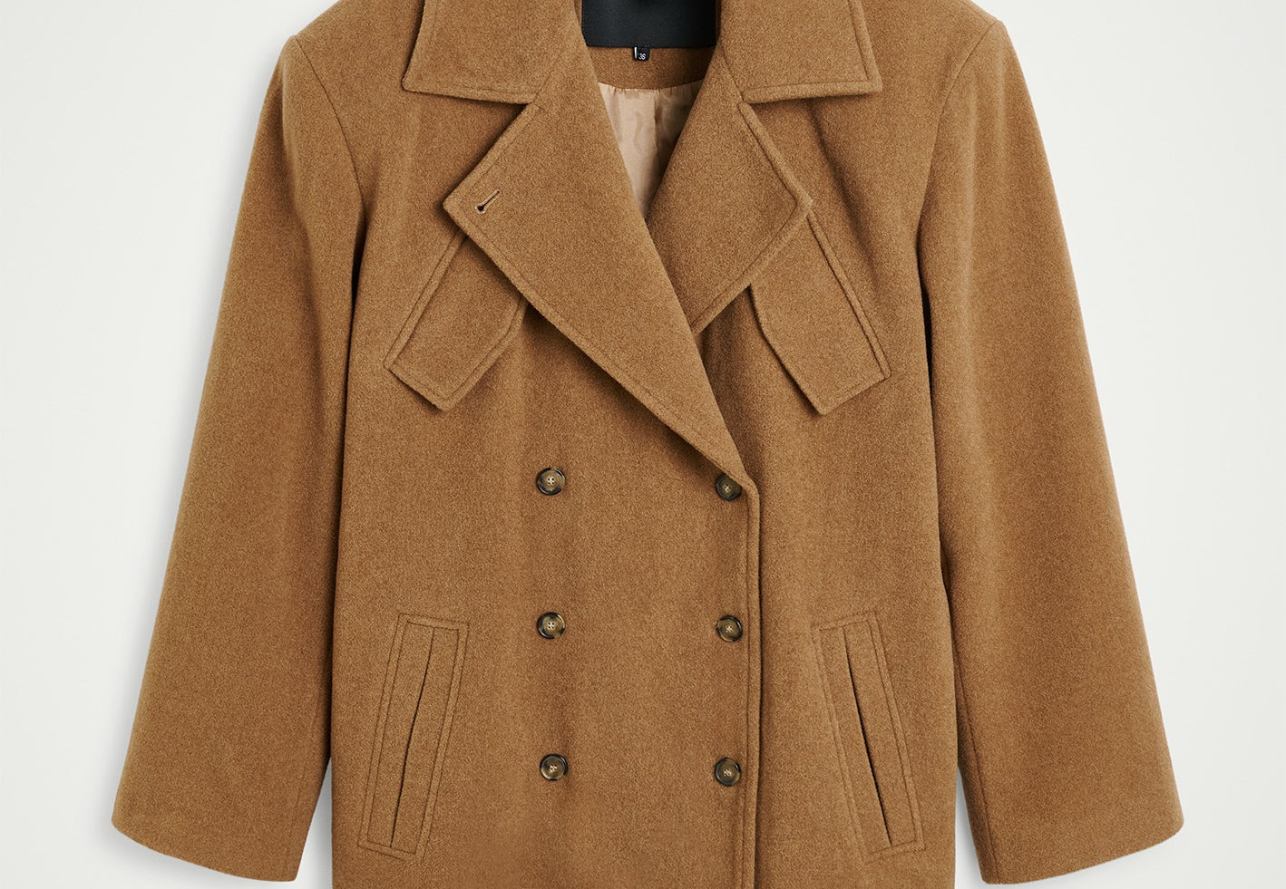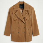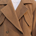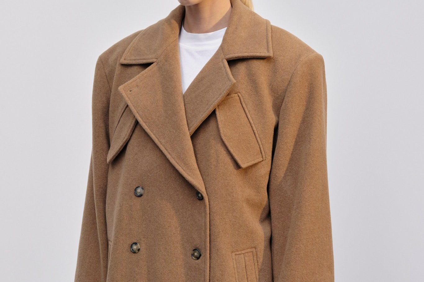Introducing the Linda Coat: An oversized jacket featuring a double-breasted design with six buttons in the front, slanted pockets, and two slanted chest pockets with flaps.