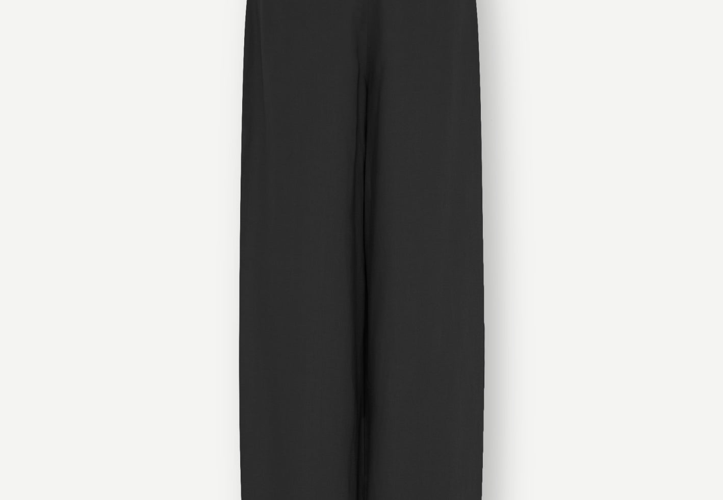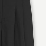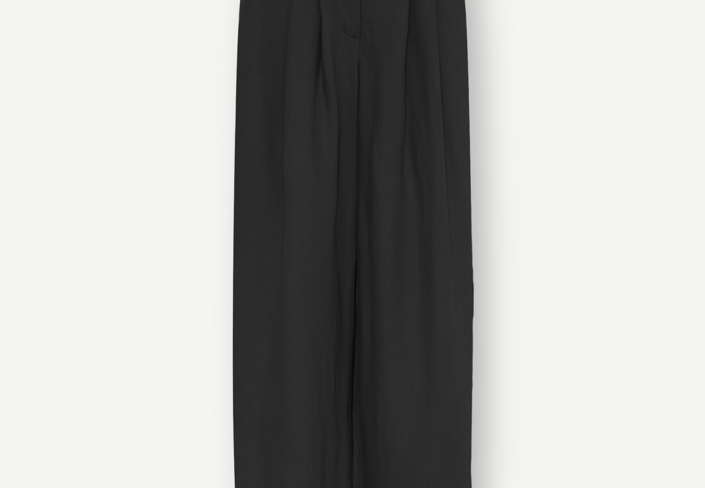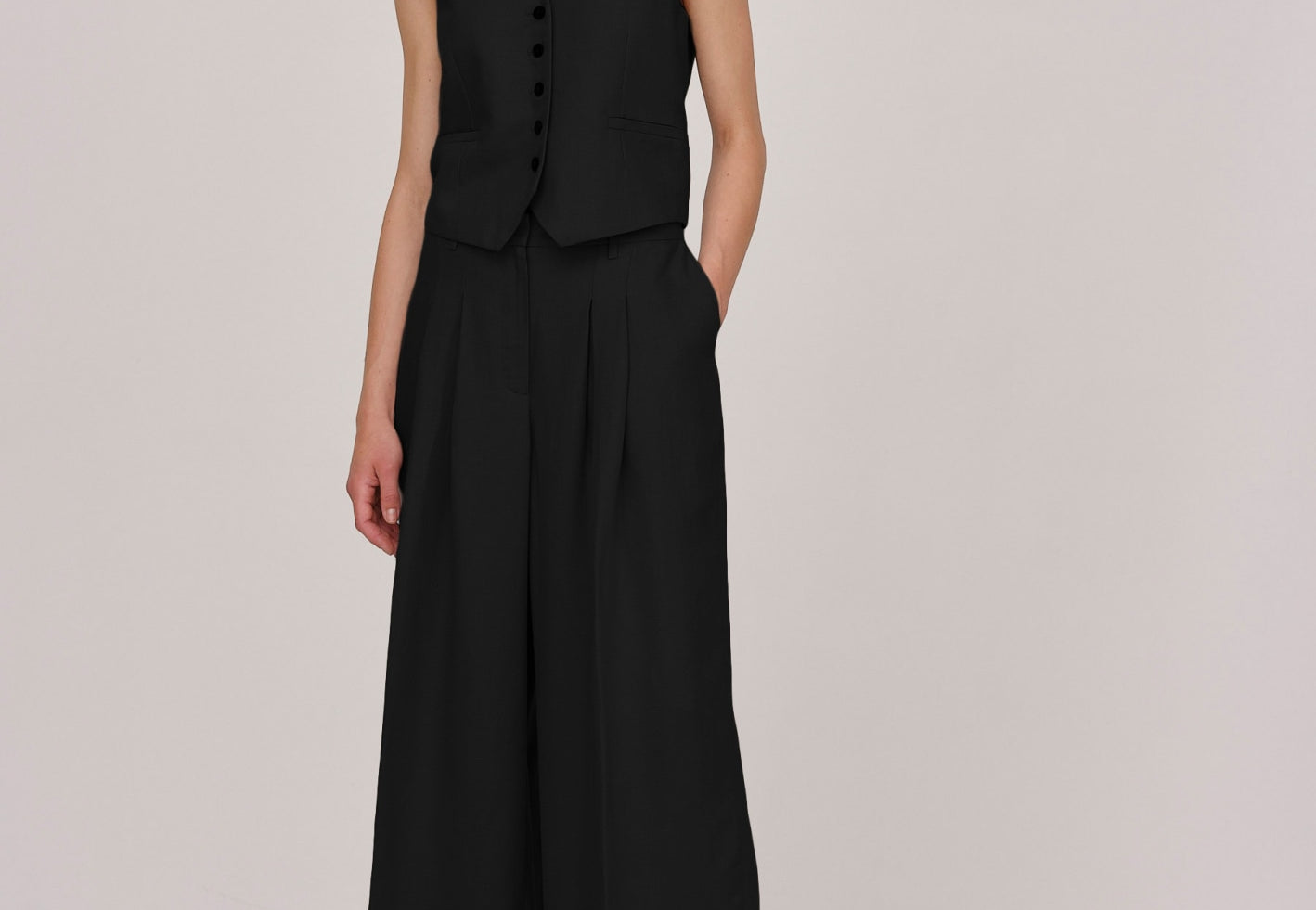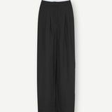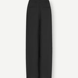 The Lotus Pants are mid-waisted relaxed-fitted pants with a deep front and back rise, straight legs, and pleats in the front.