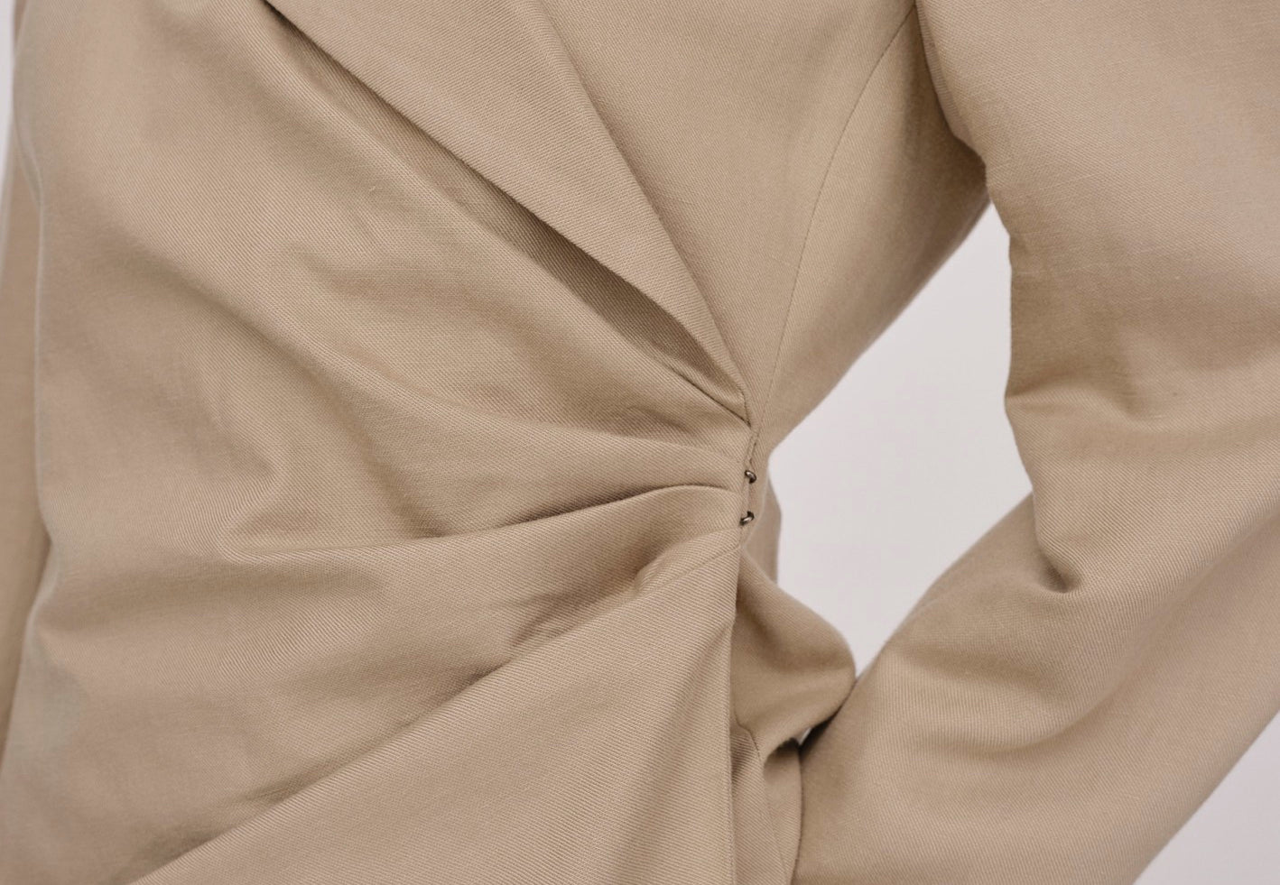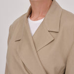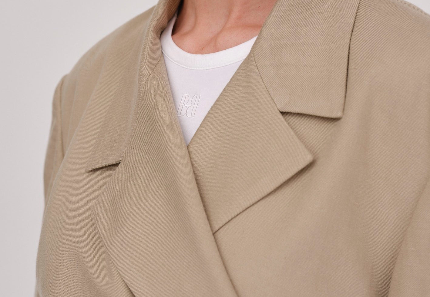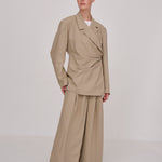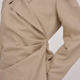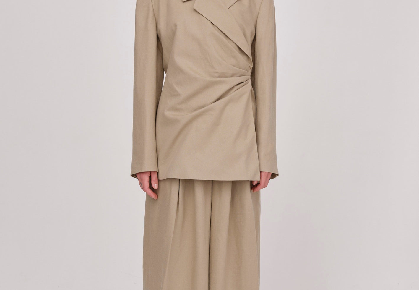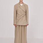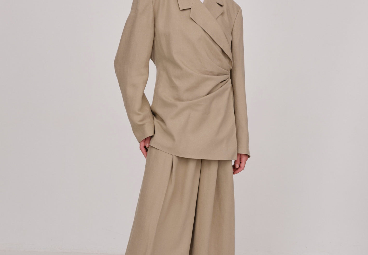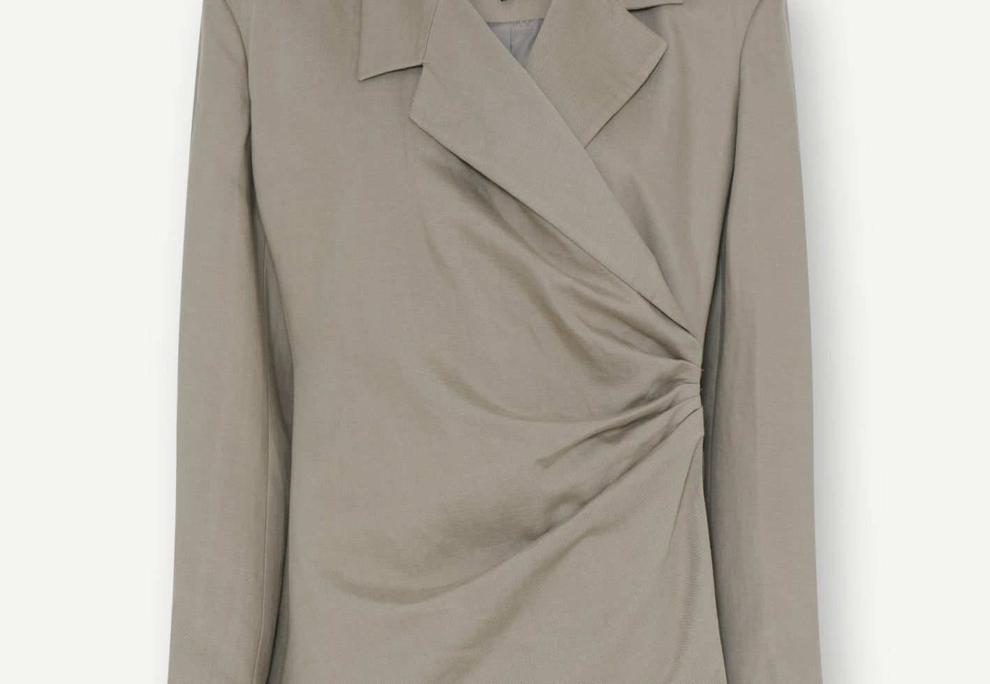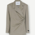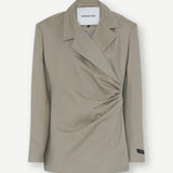 The Lucky Blazer is a wrap blazer fitted at the waist with side panels and a chest pocket.