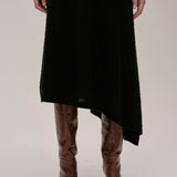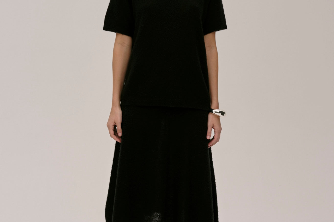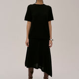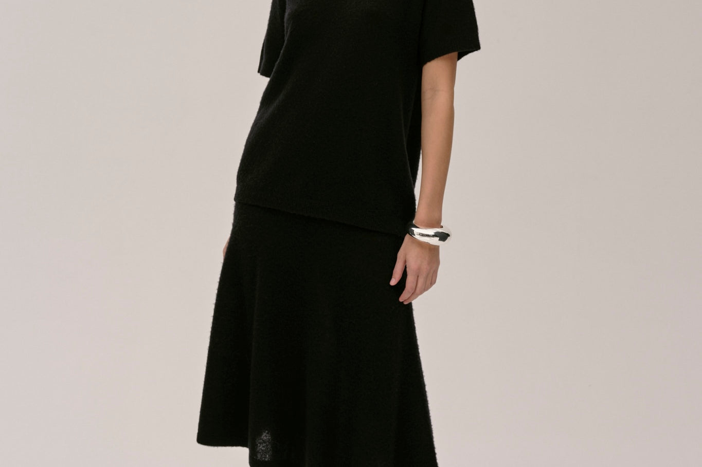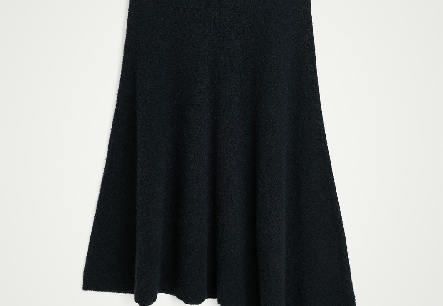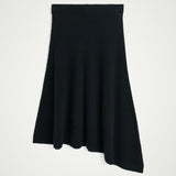 The Luigi Skirt is a mid-waisted midi knitted skirt with an elastic waistband and asymmetrical button made from a butter-soft light cashmere-wool mix.