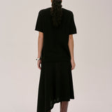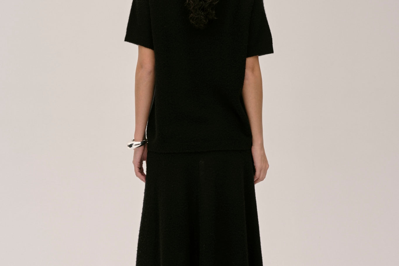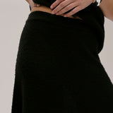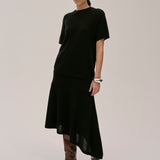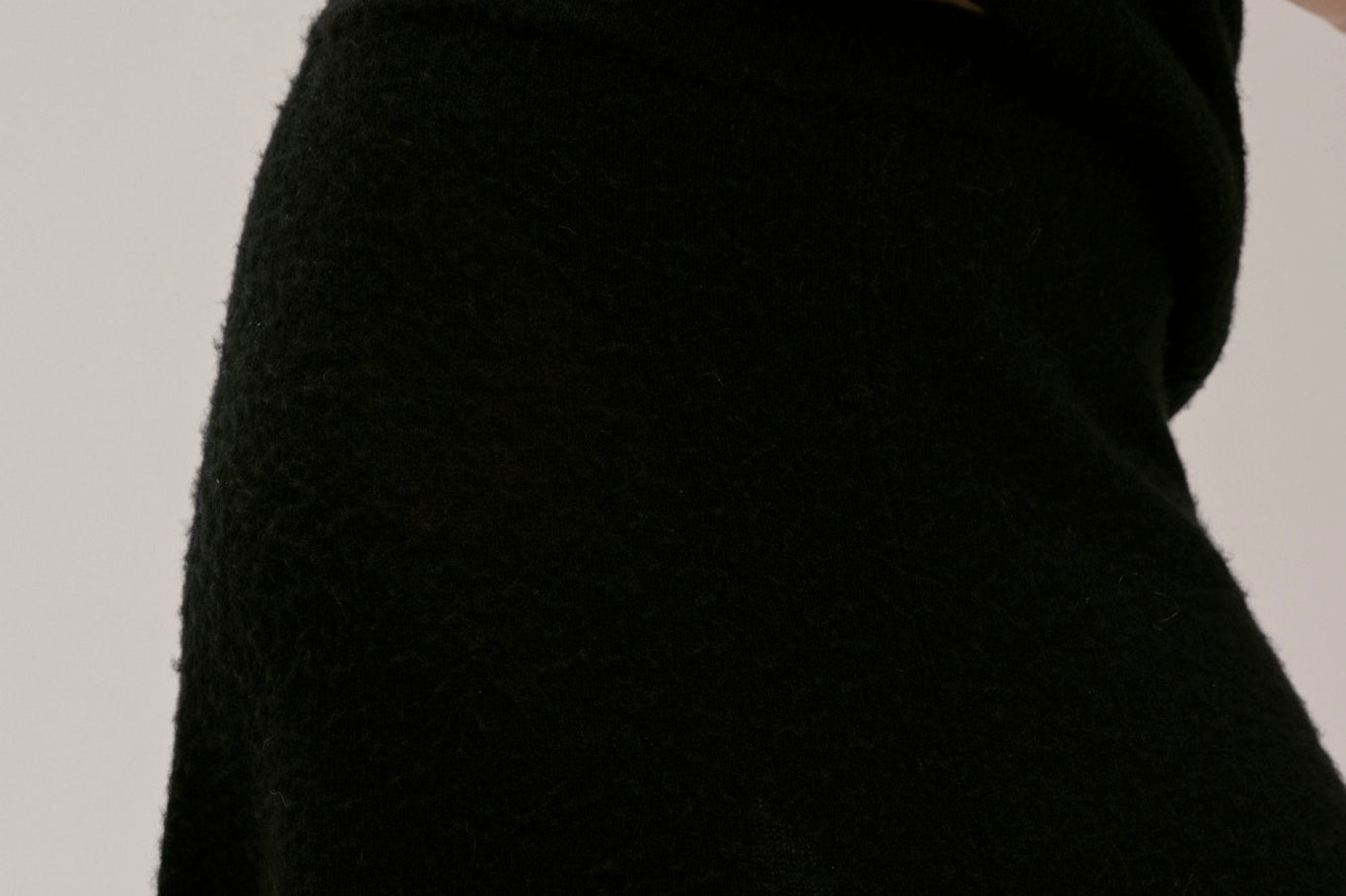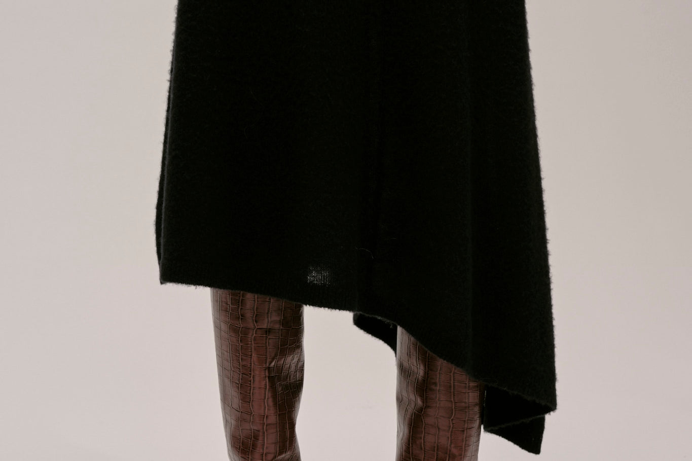 The Luigi Skirt is a mid-waisted midi knitted skirt with an elastic waistband and asymmetrical button made from a butter-soft light cashmere-wool mix.