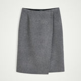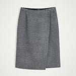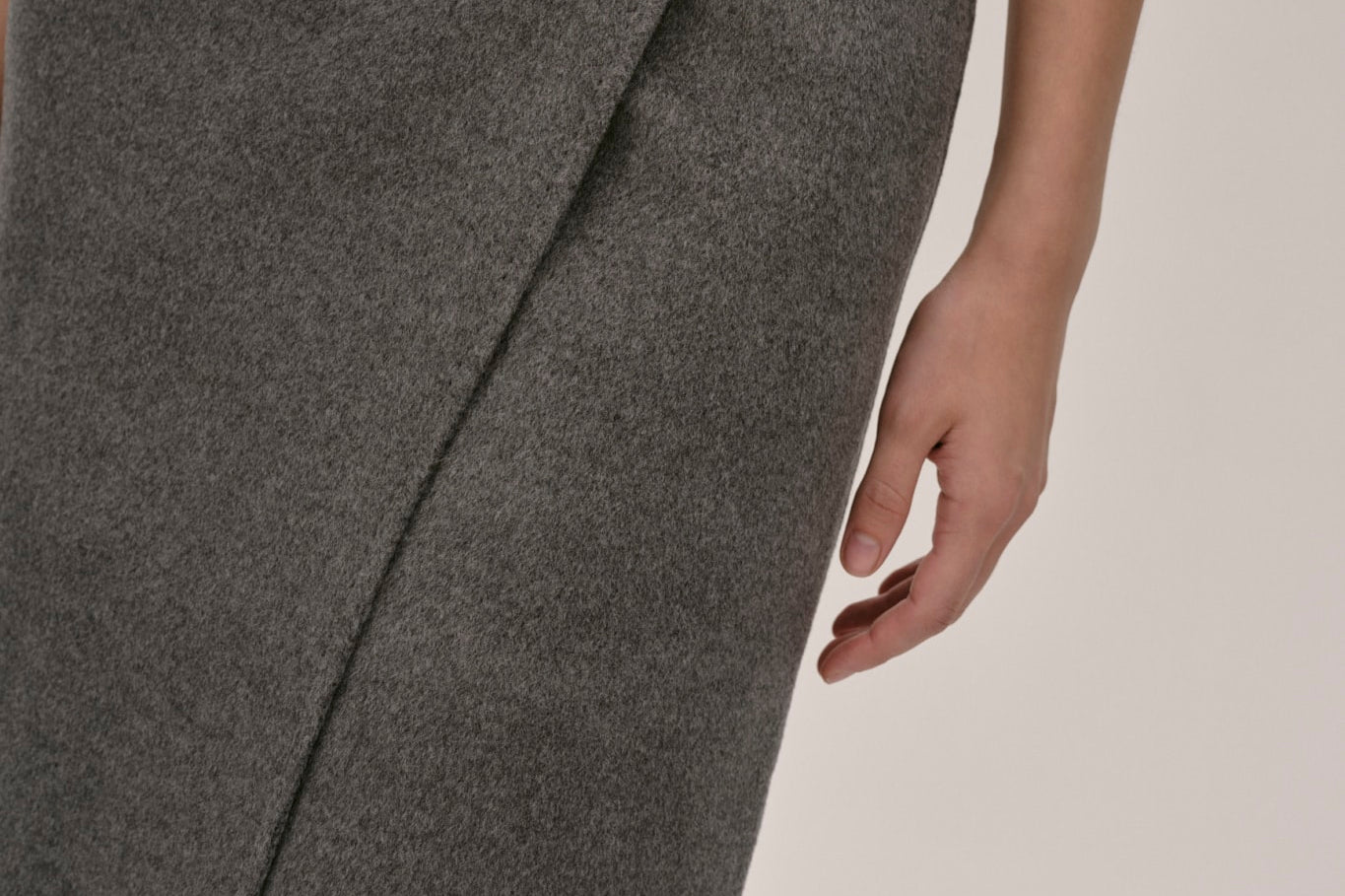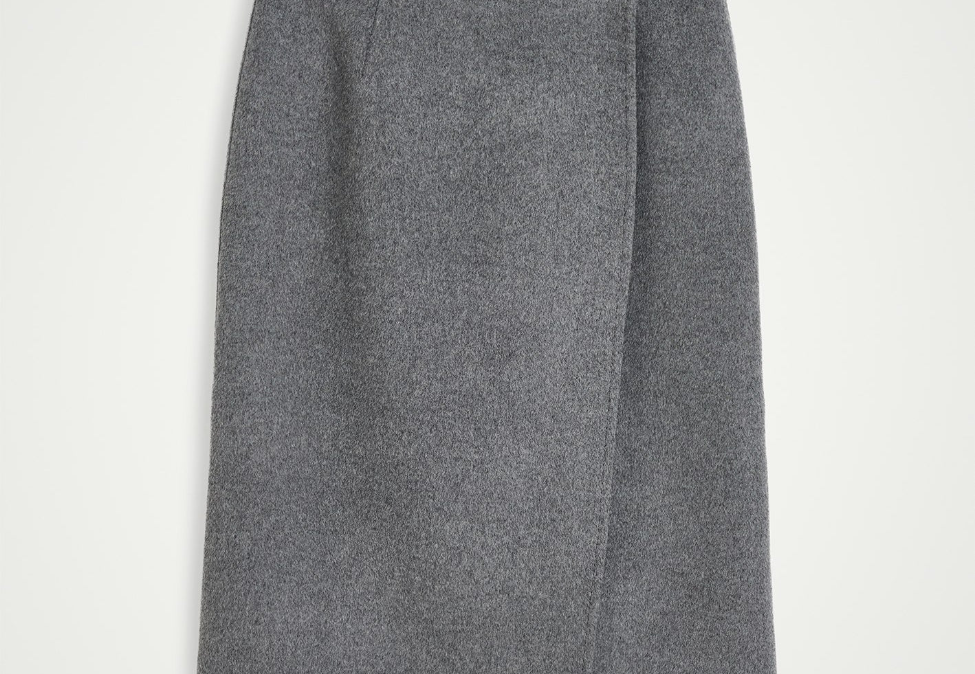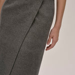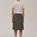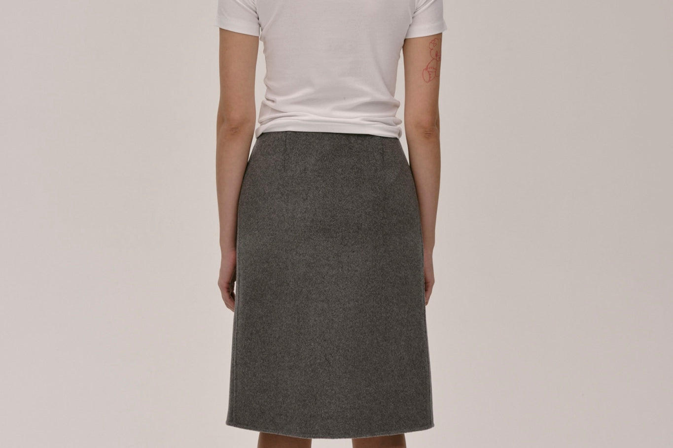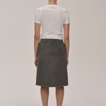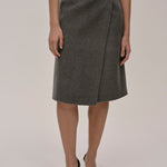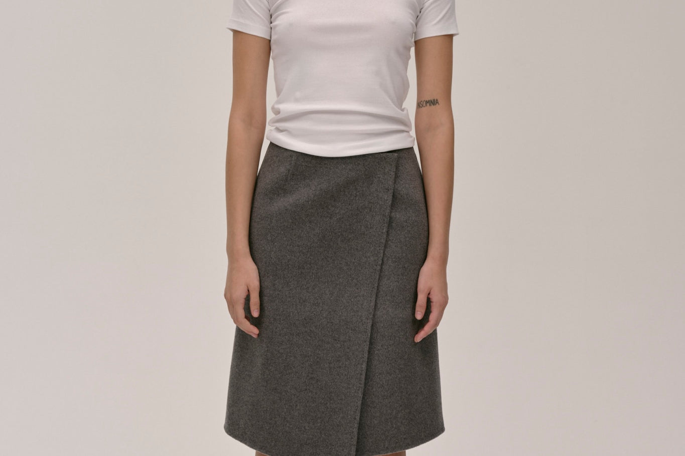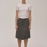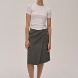 The Macha Skirt is a midi wrap skirt with a button closure in front.