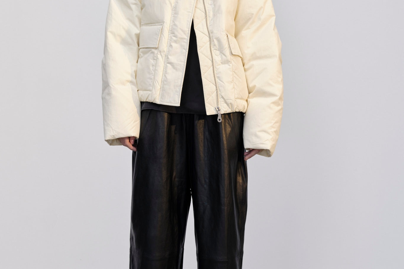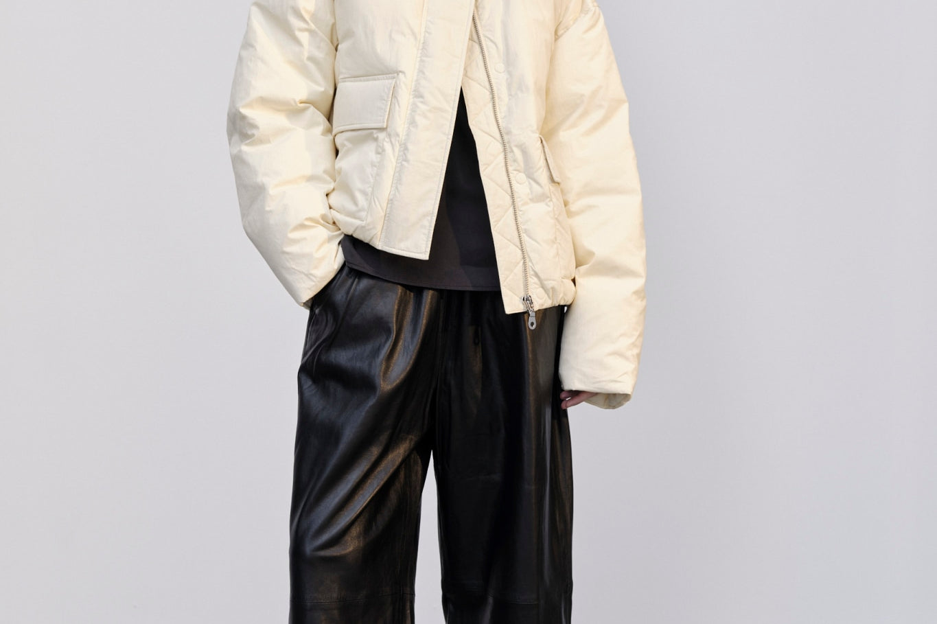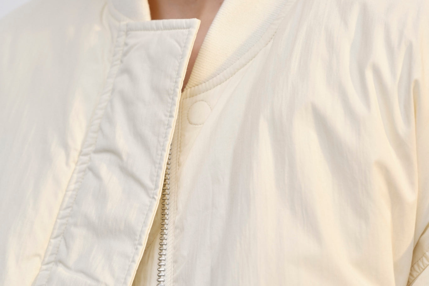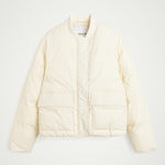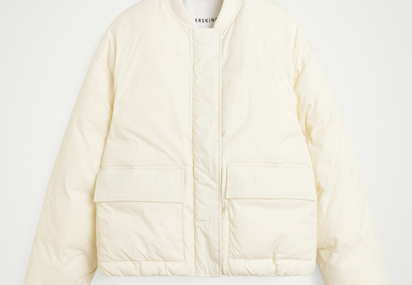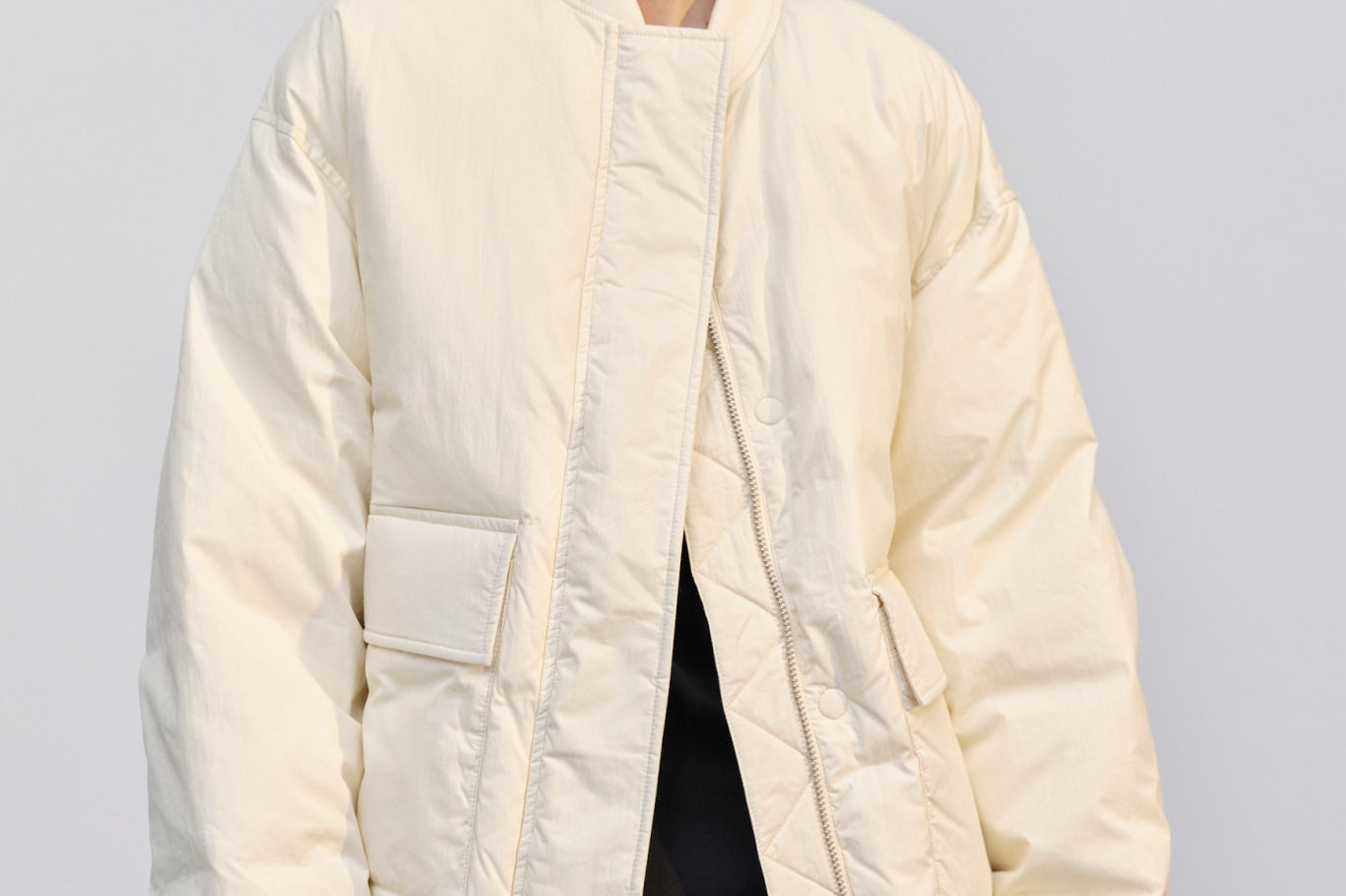 Introducing the Manu Puffer Jacket: An oversized bomber jacket with padding, featuring a round neckline with a rib collar, big placement pockets with pocket flaps at the front, and a placket with a zipper closure.