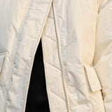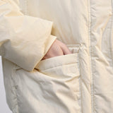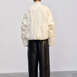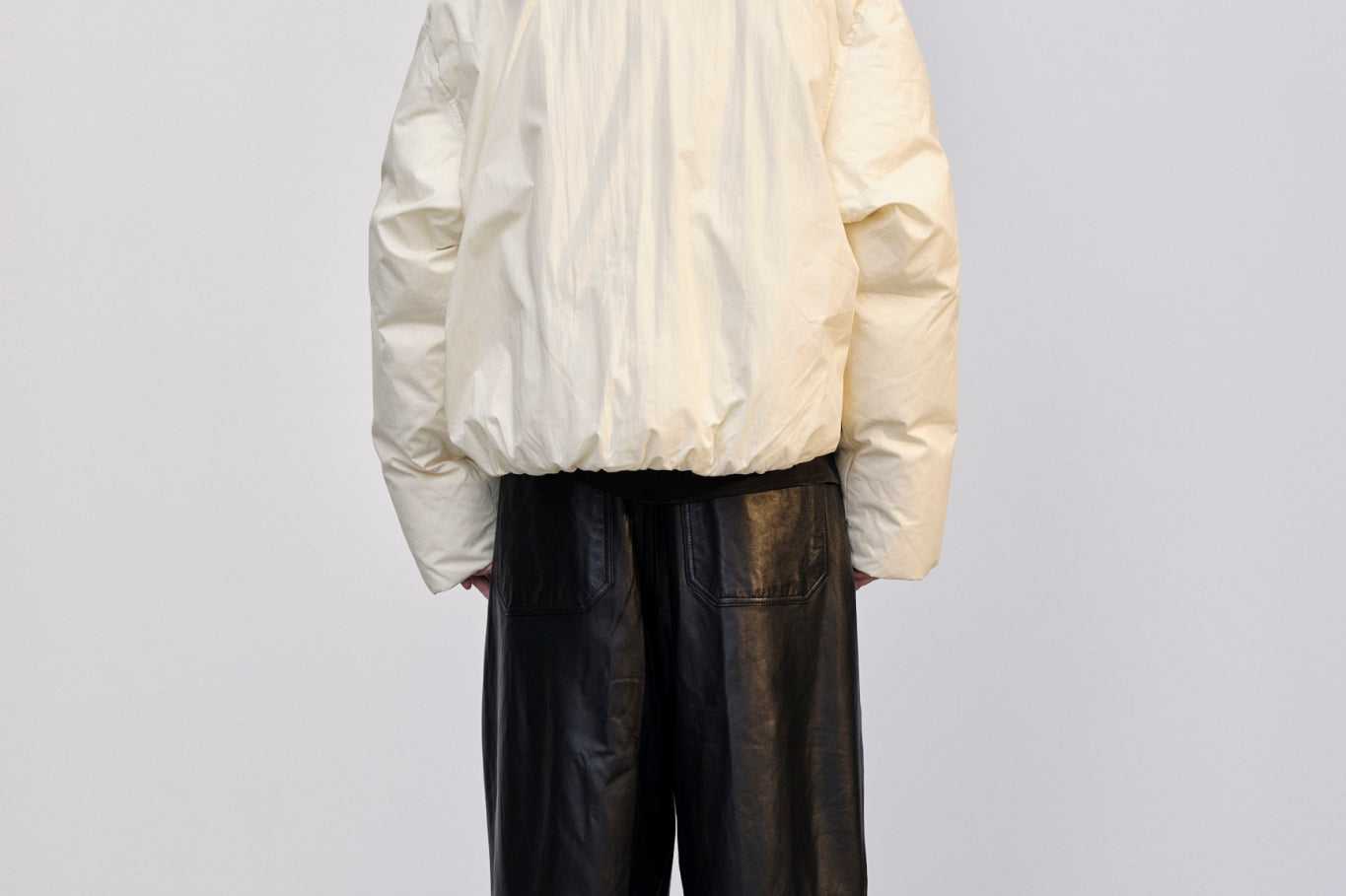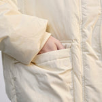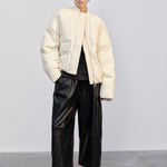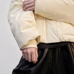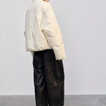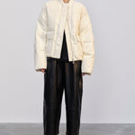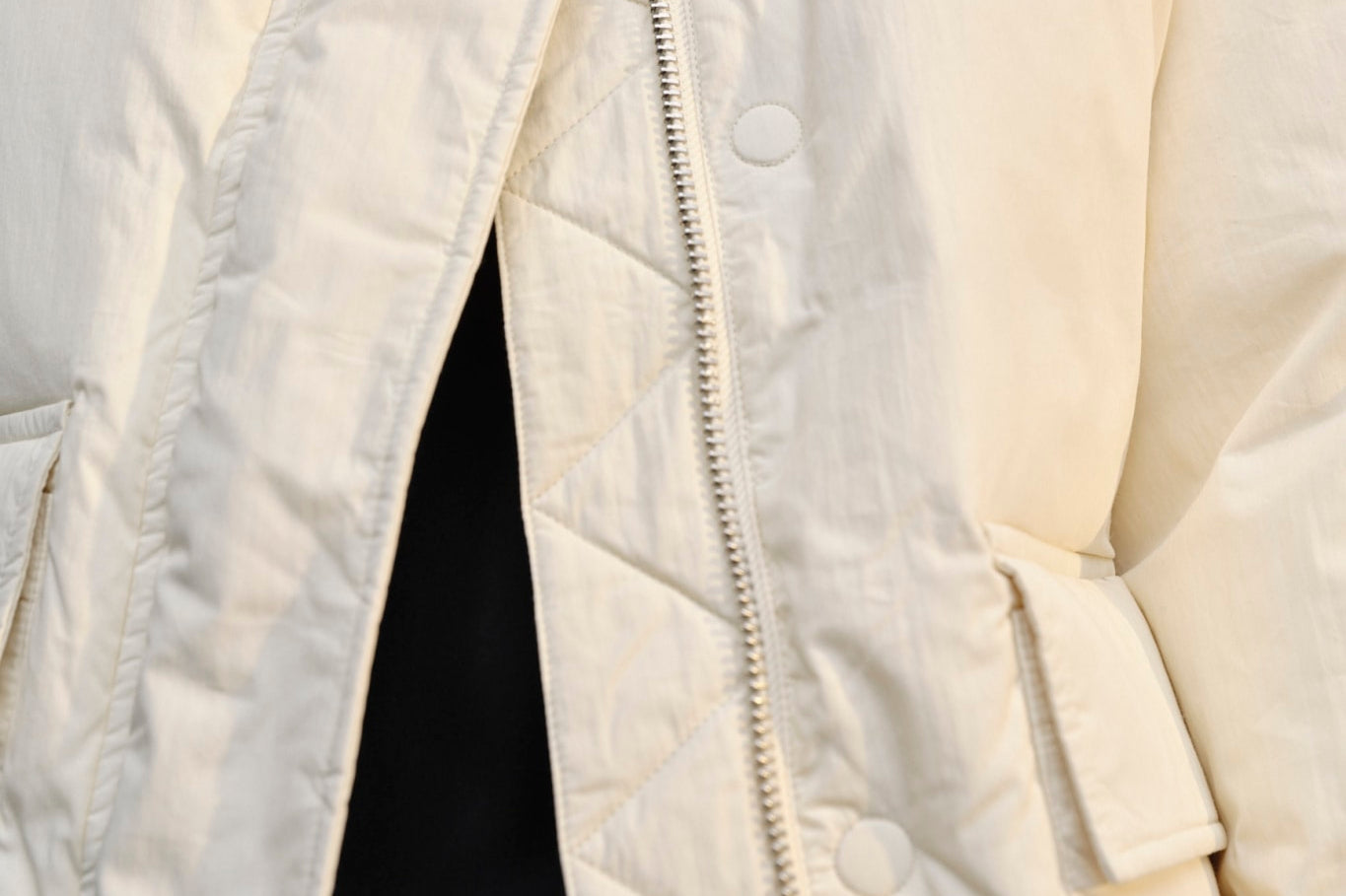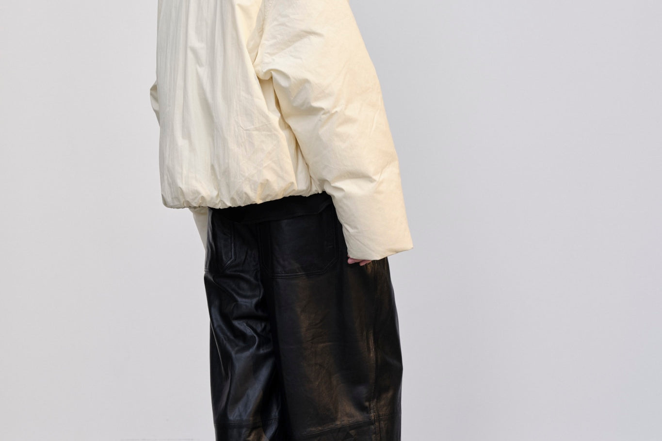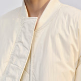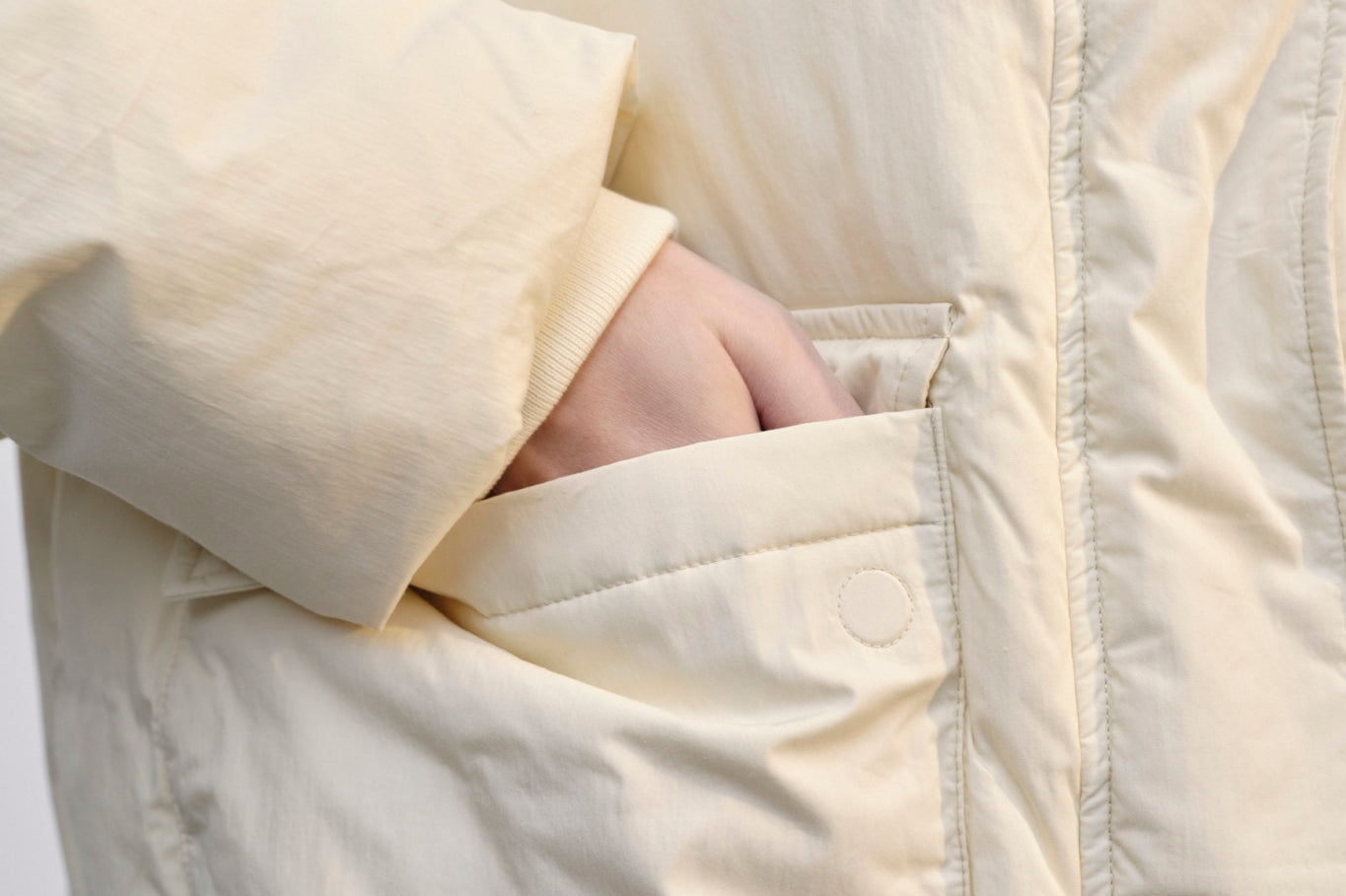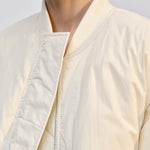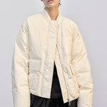 Introducing the Manu Puffer Jacket: An oversized bomber jacket with padding, featuring a round neckline with a rib collar, big placement pockets with pocket flaps at the front, and a placket with a zipper closure.