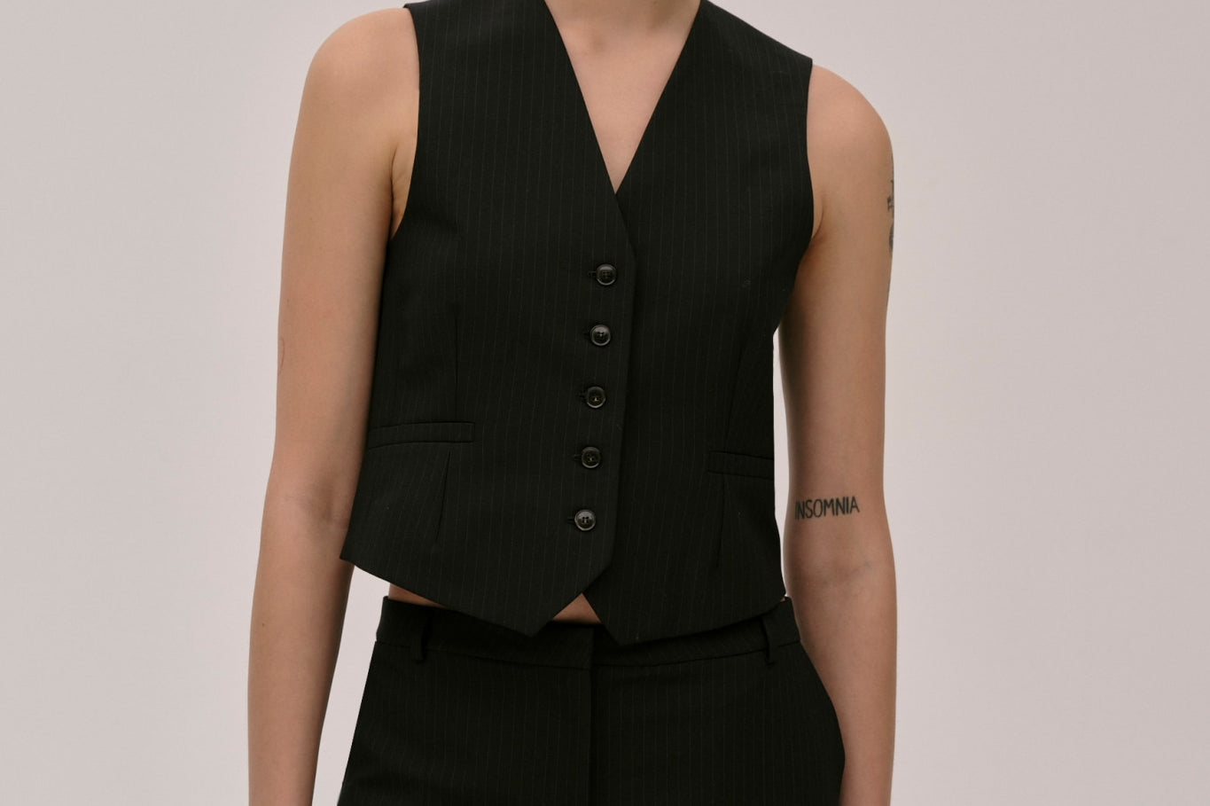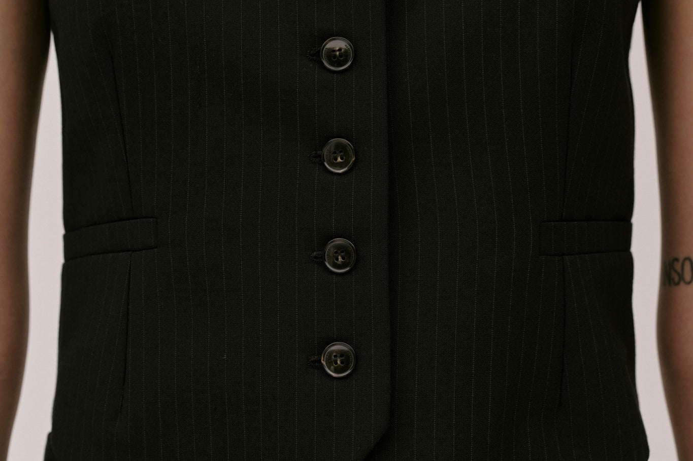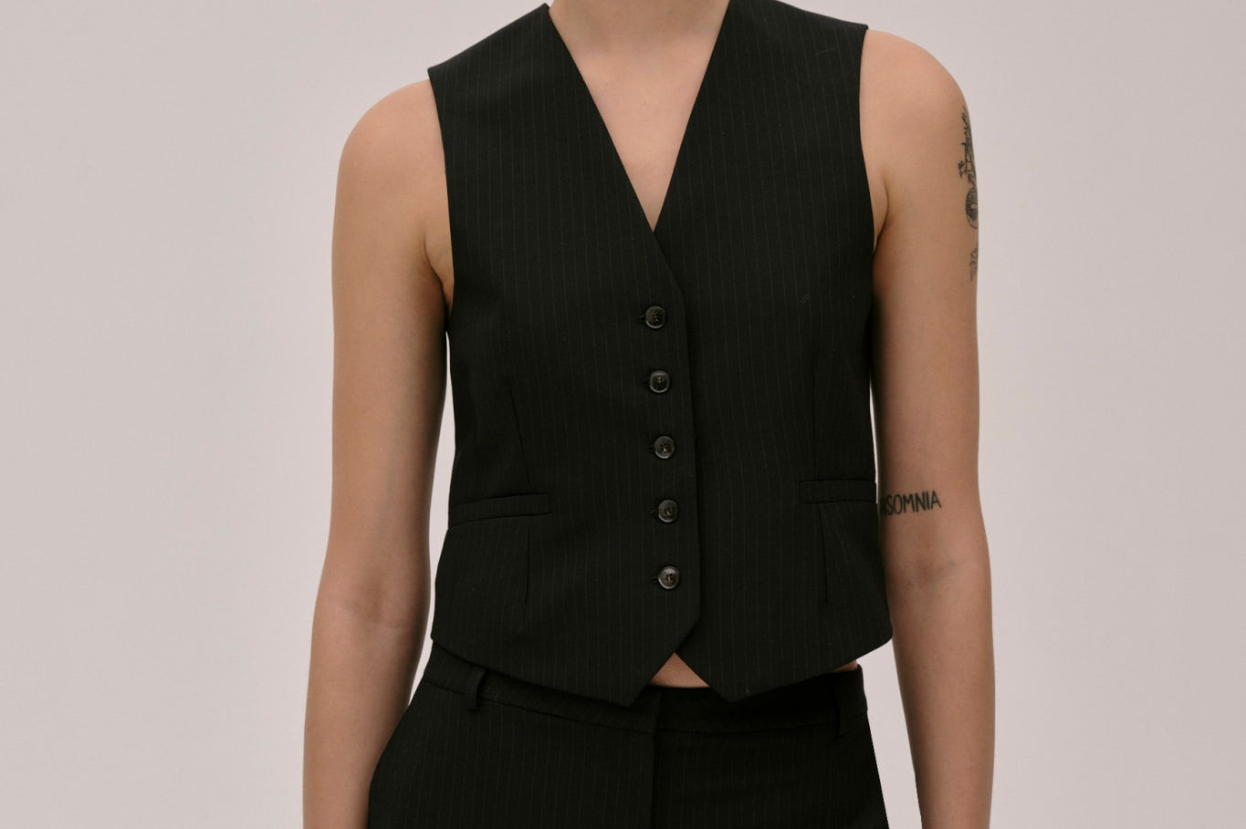 The Mister Vest is a suit vest with a slim fit and side panels. It features two paspel pockets in the front and a button closure.
