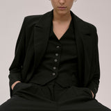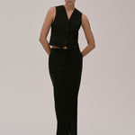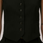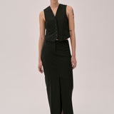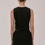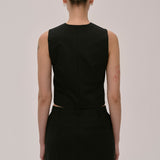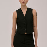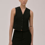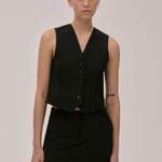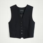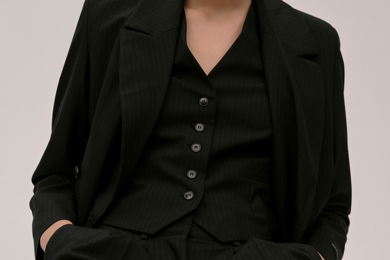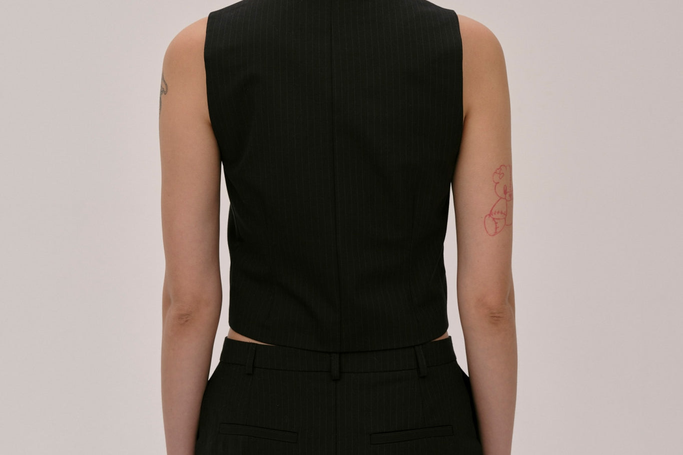 The Mister Vest is a suit vest with a slim fit and side panels. It features two paspel pockets in the front and a button closure.