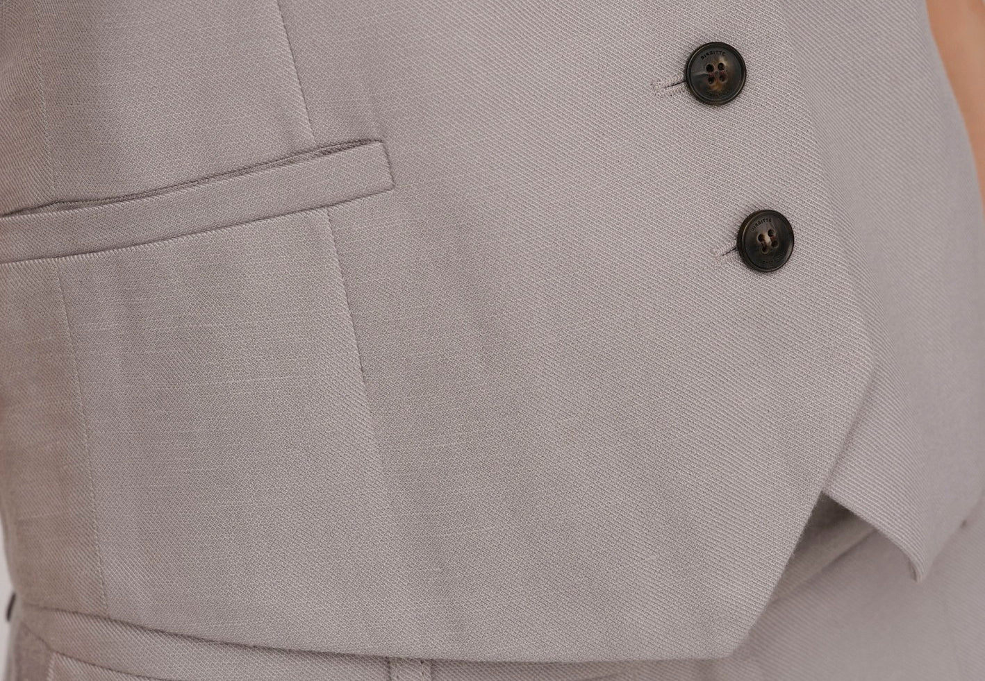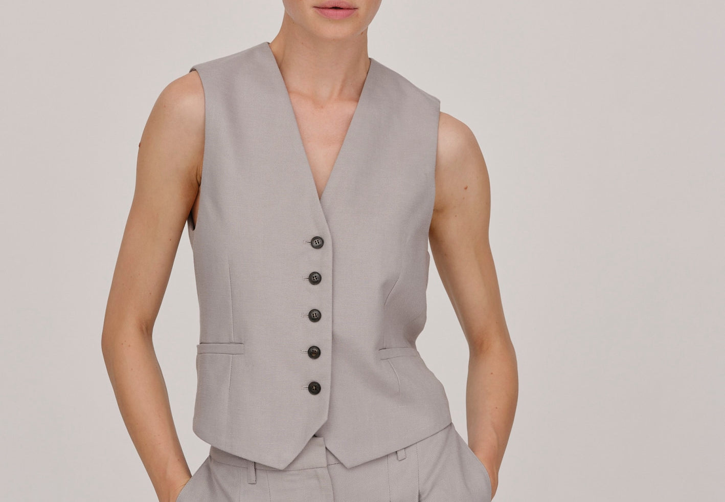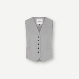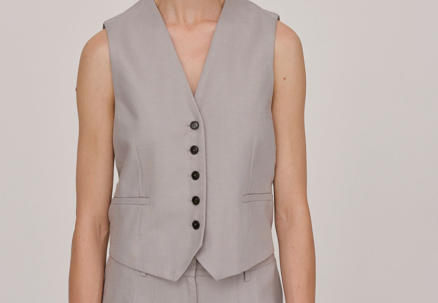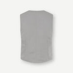The Mister Vest is a slim-fitted suit vest with side panels, featuring two paspel pockets in the front and a button closure design.