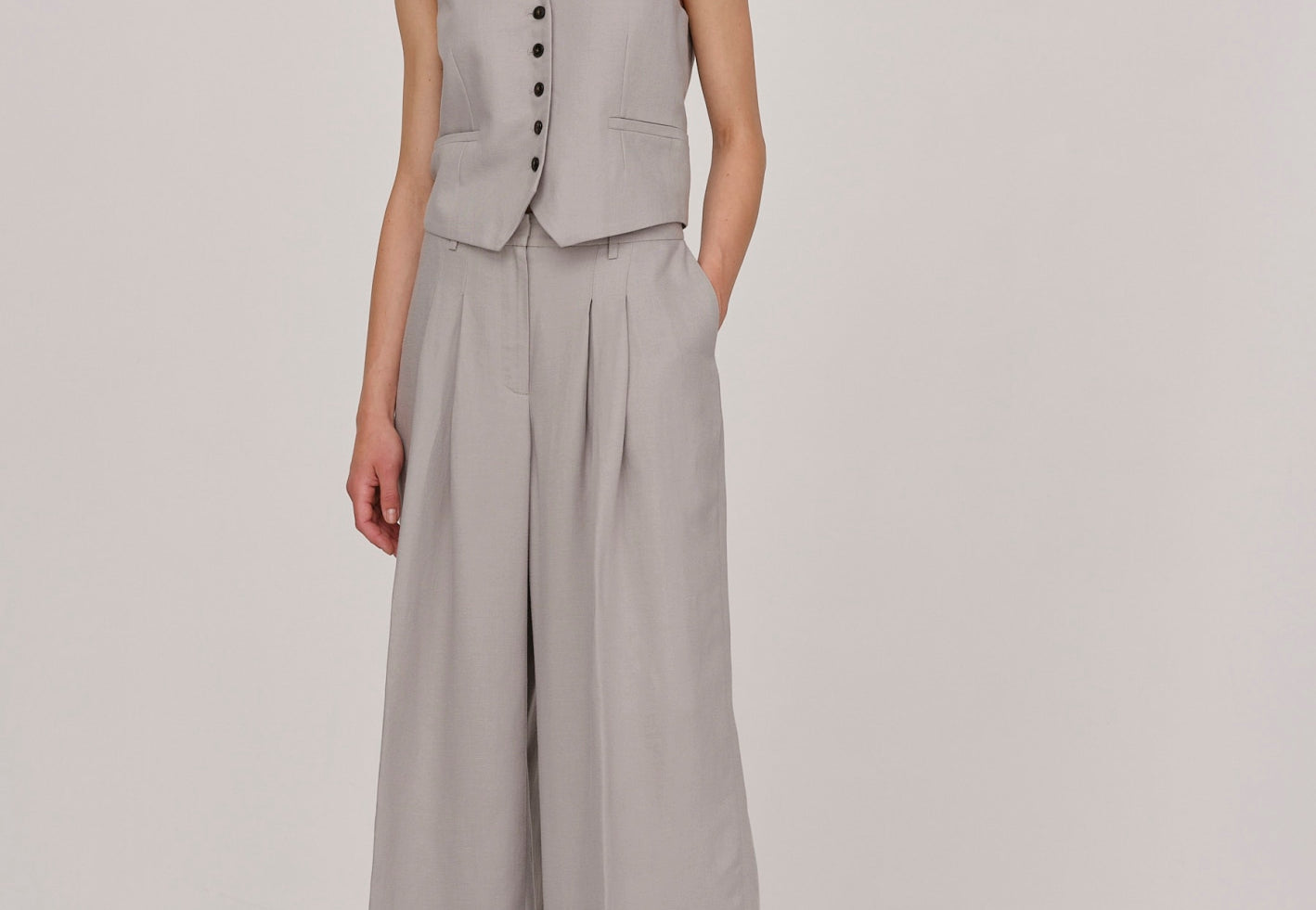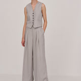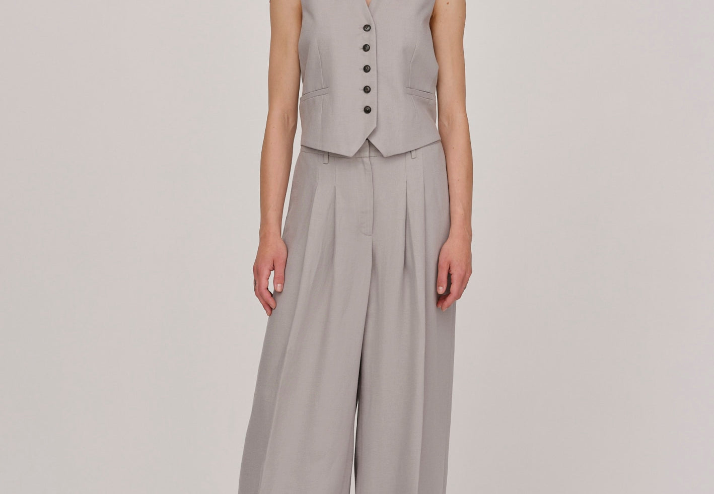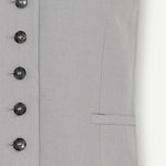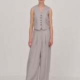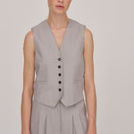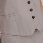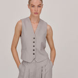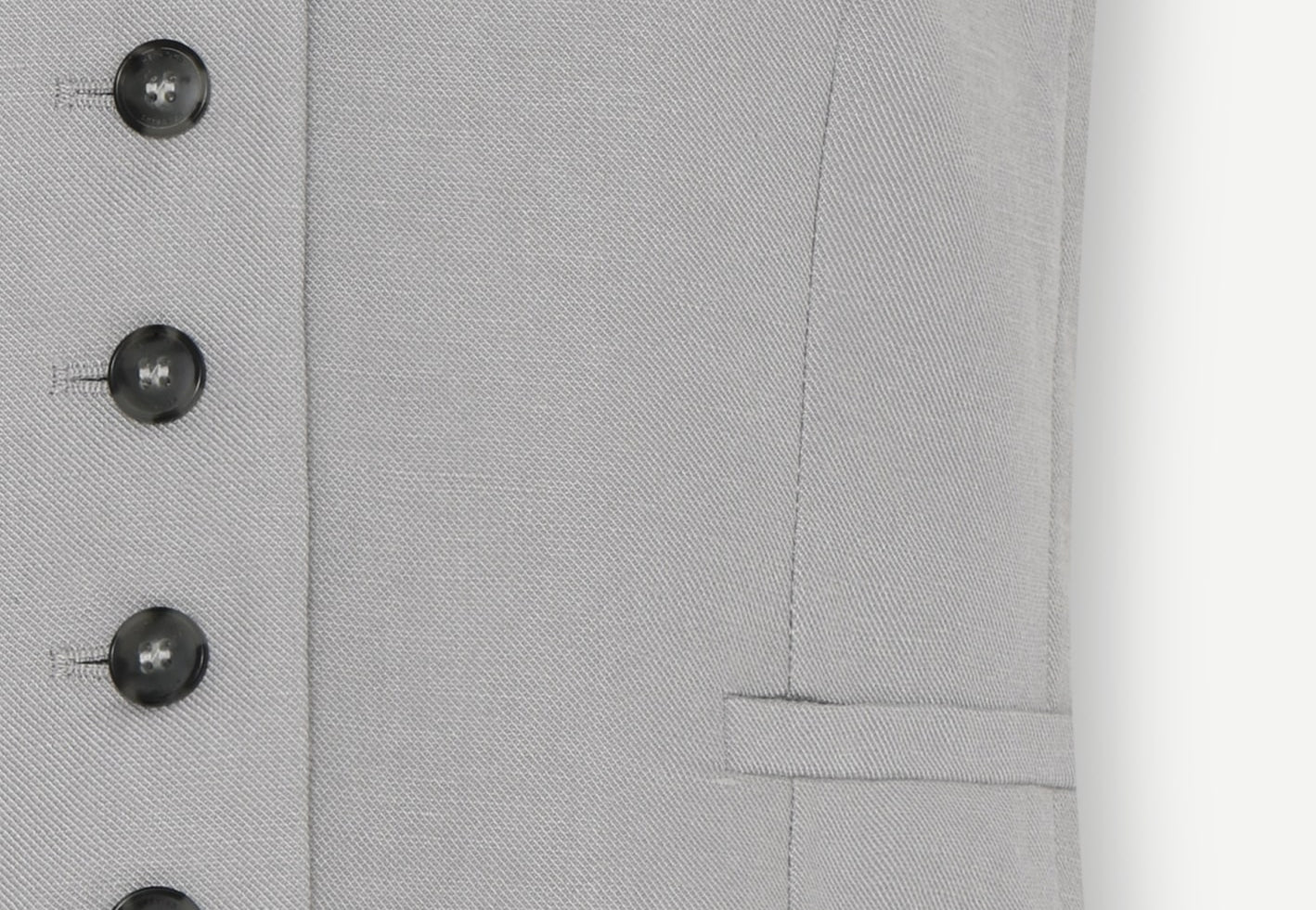 The Mister Vest is a slim-fitted suit vest with side panels, featuring two paspel pockets in the front and a button closure design.