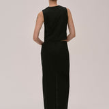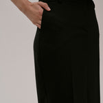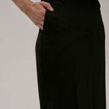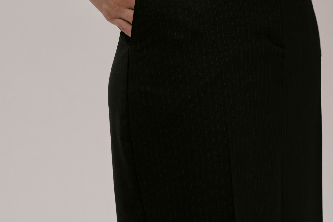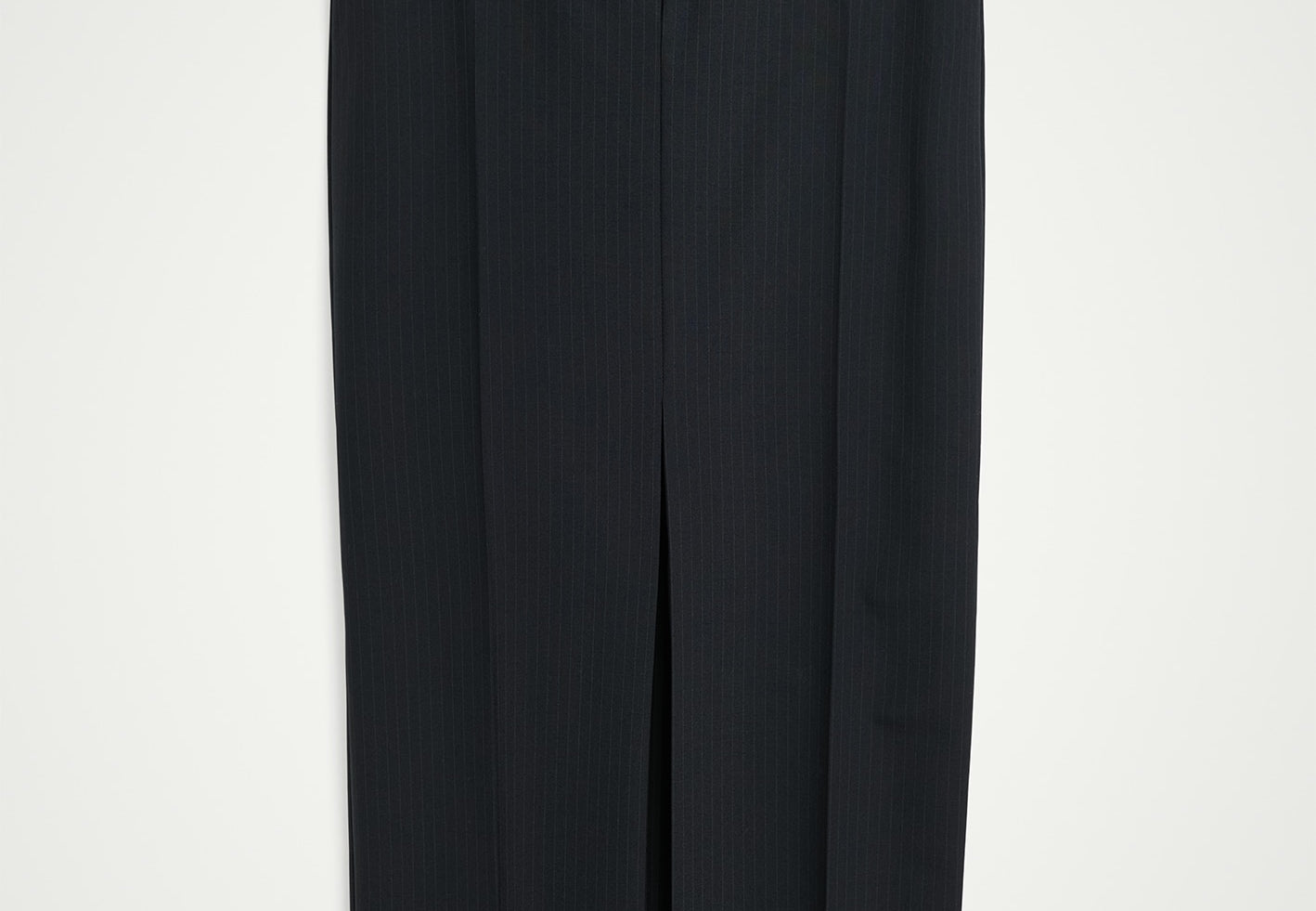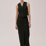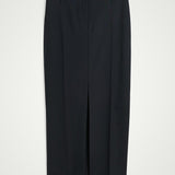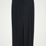 The Nina Skirt is a long tailored skirt featuring a crease at both the front and back, with a slit at the front.