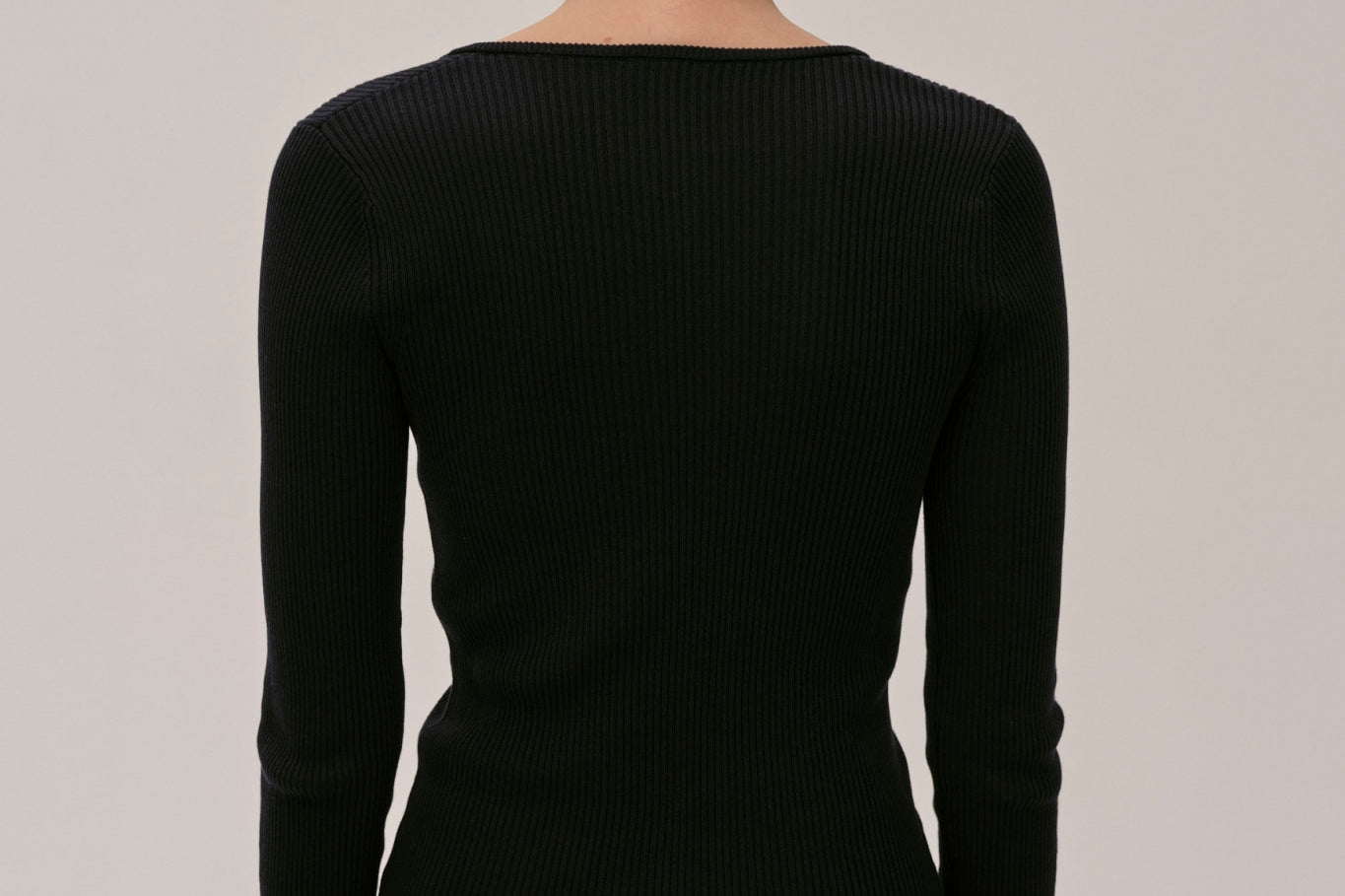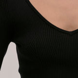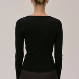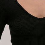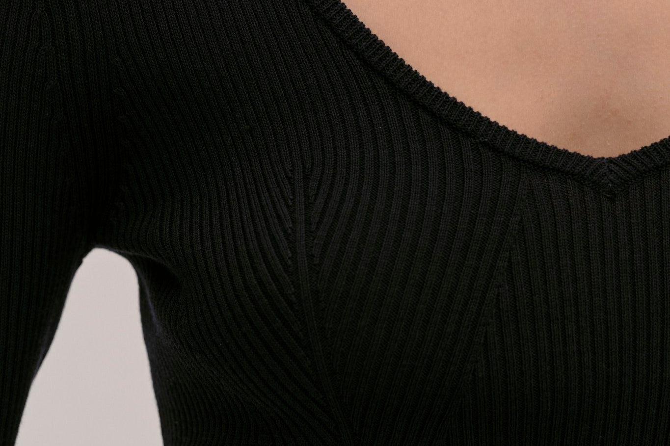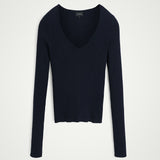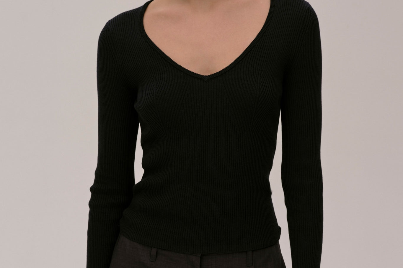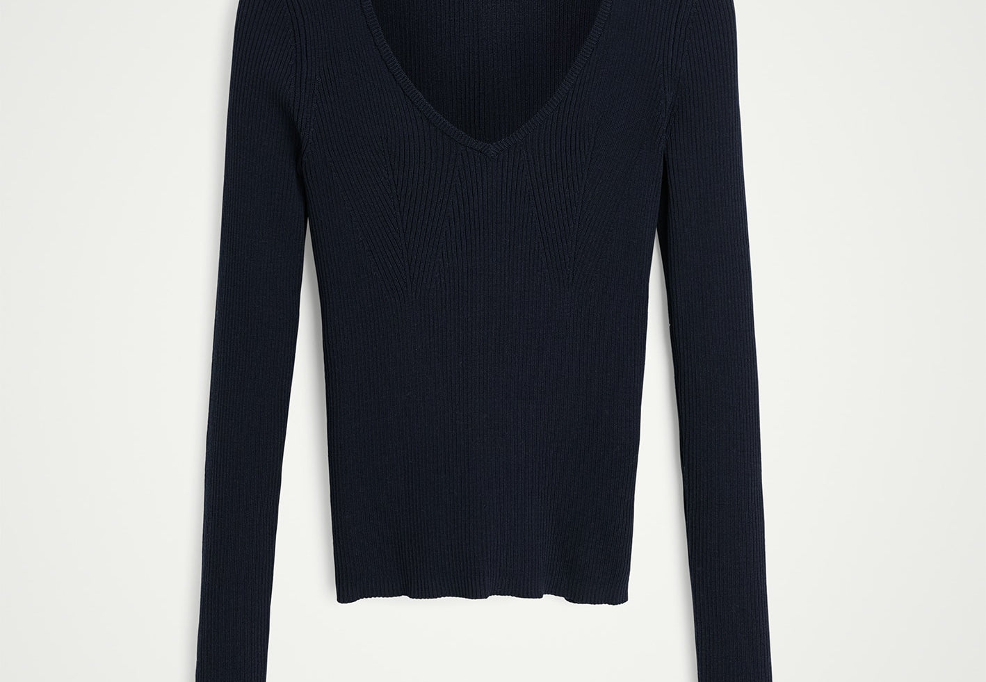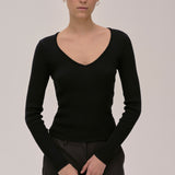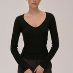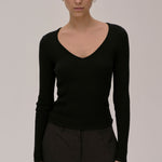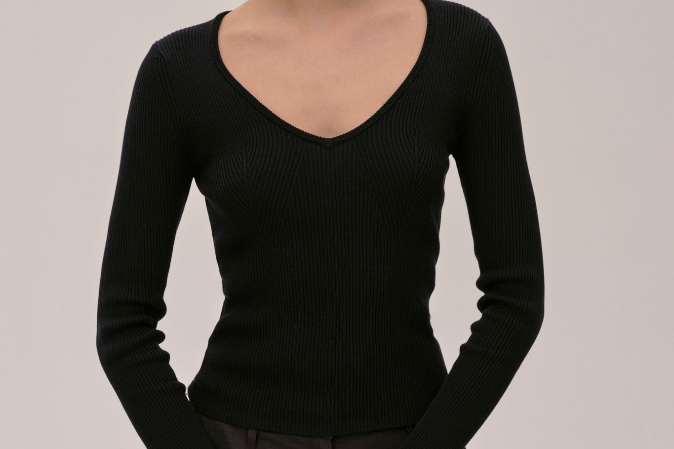 The Nova Knit Blouse is a long-sleeved knitted blouse featuring a regular fit and a deep V-neck.