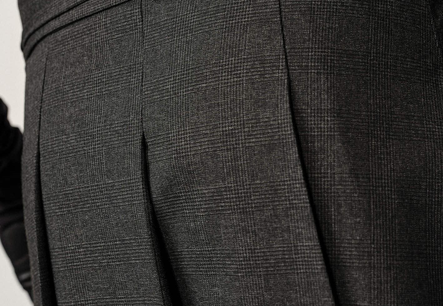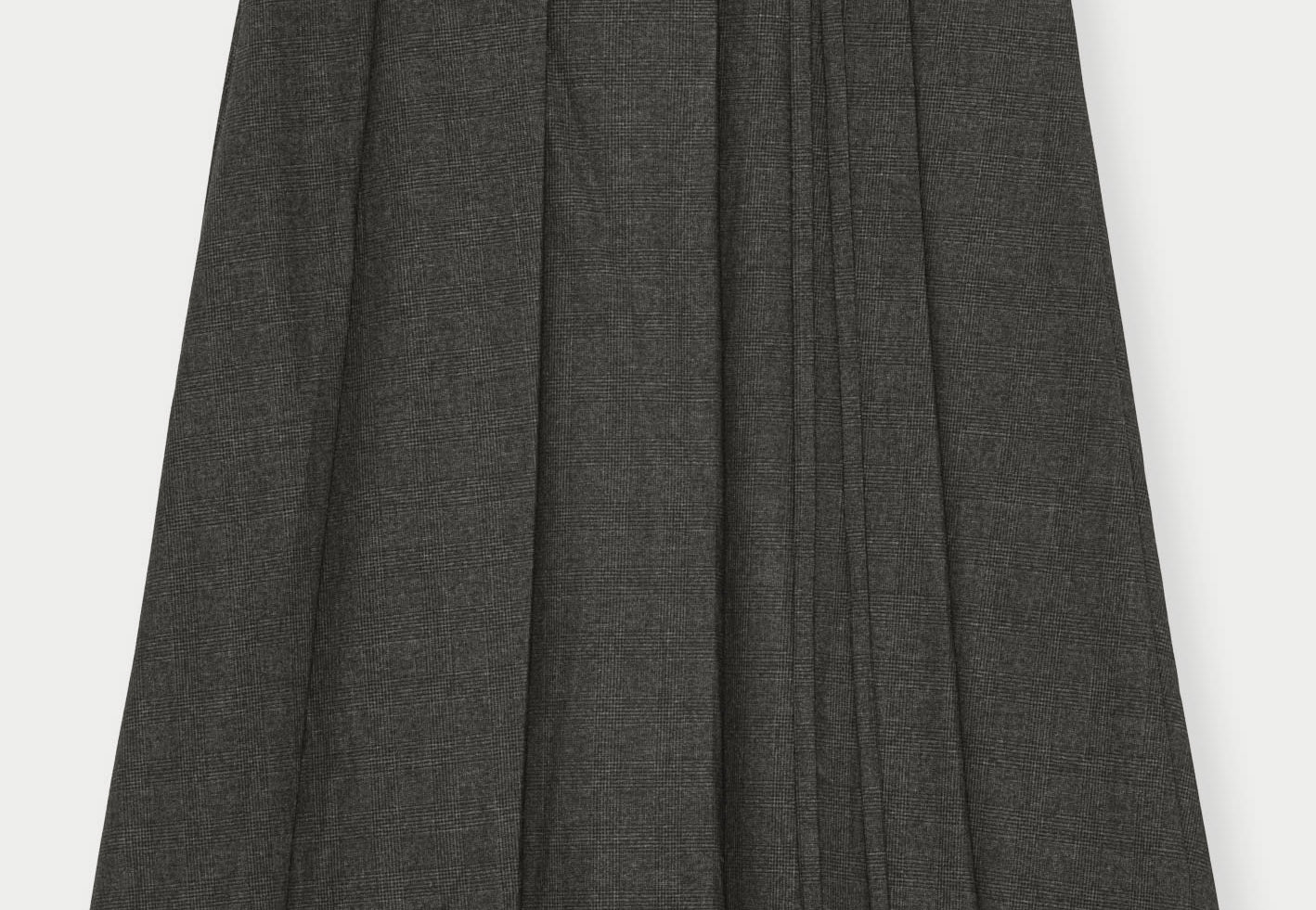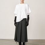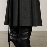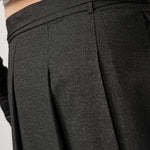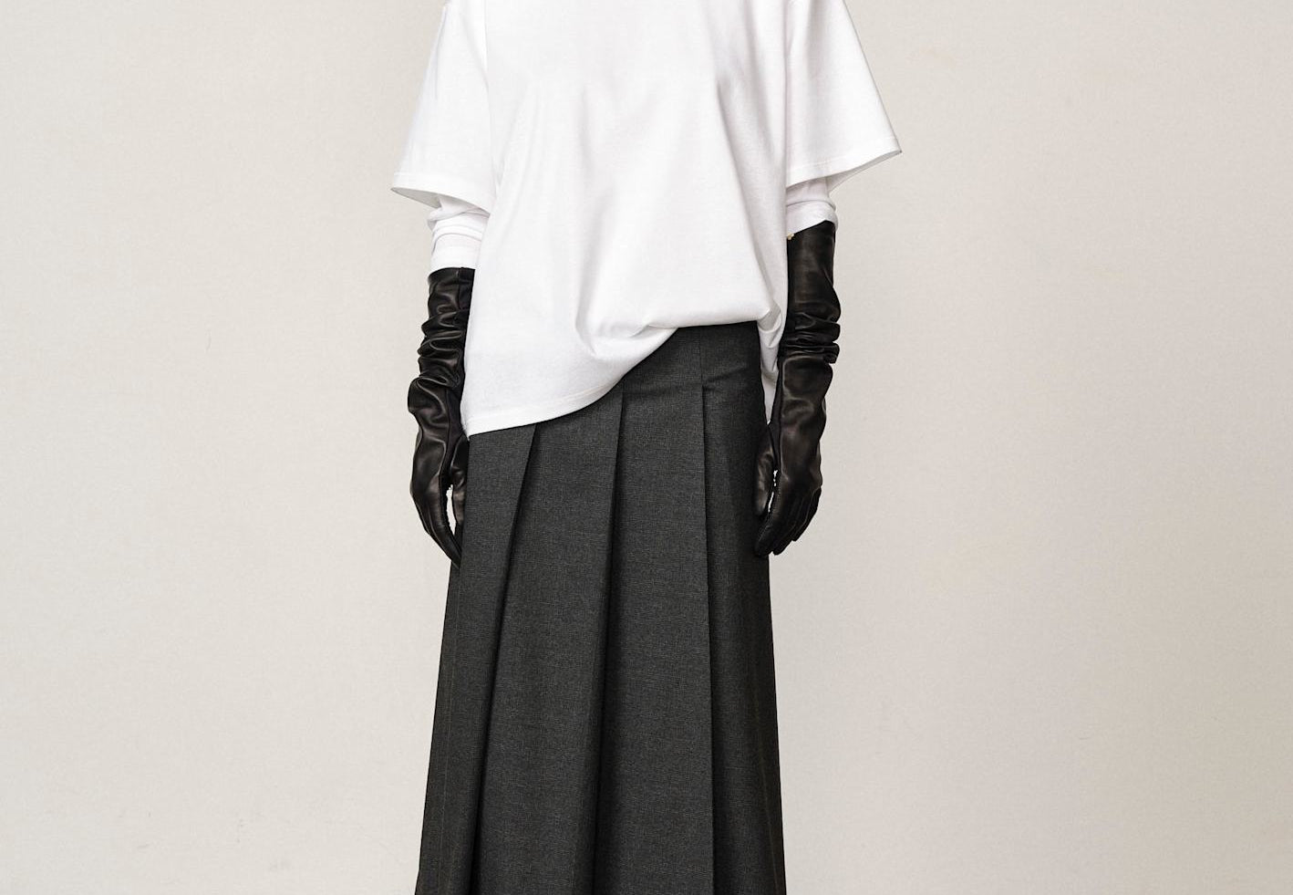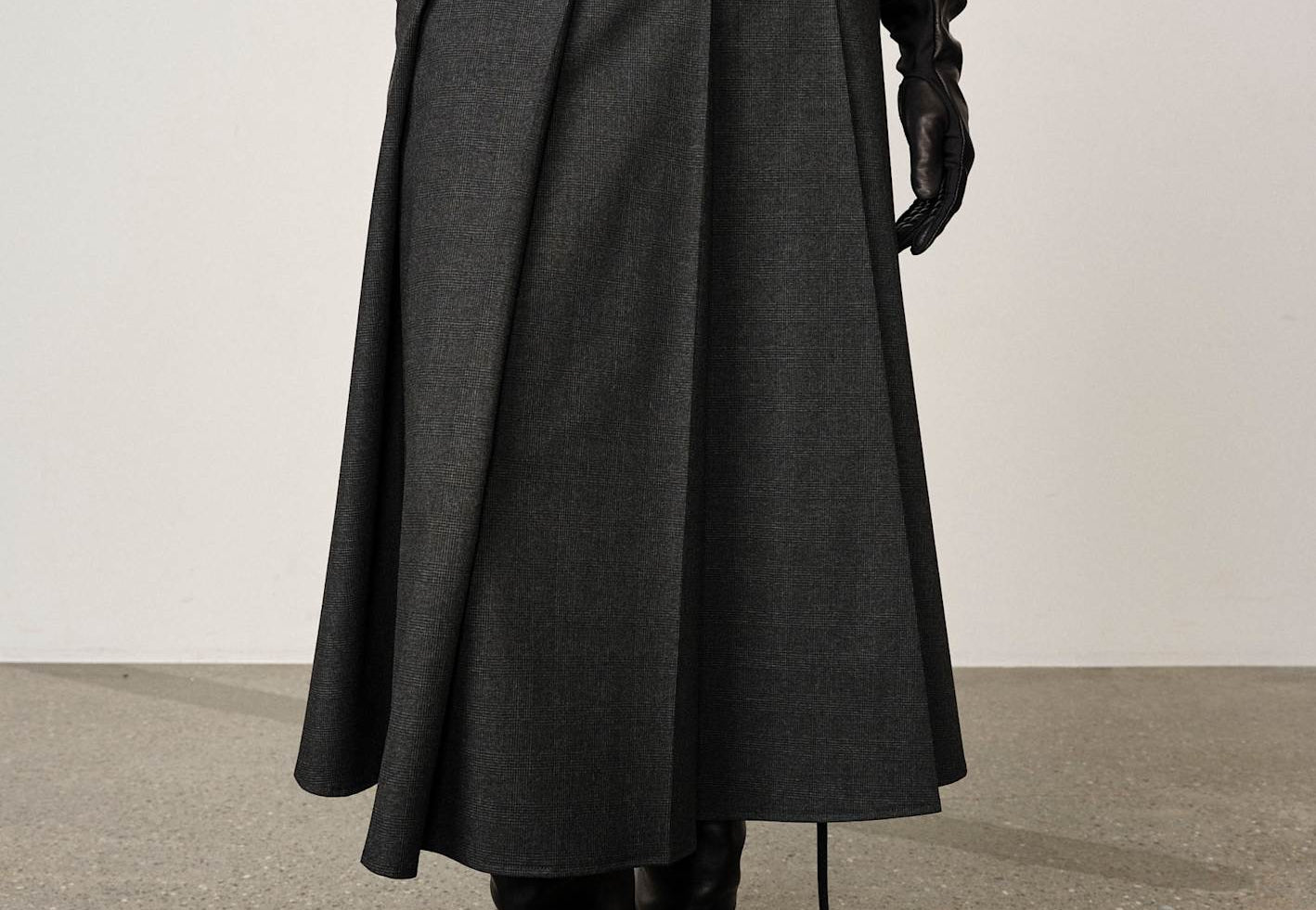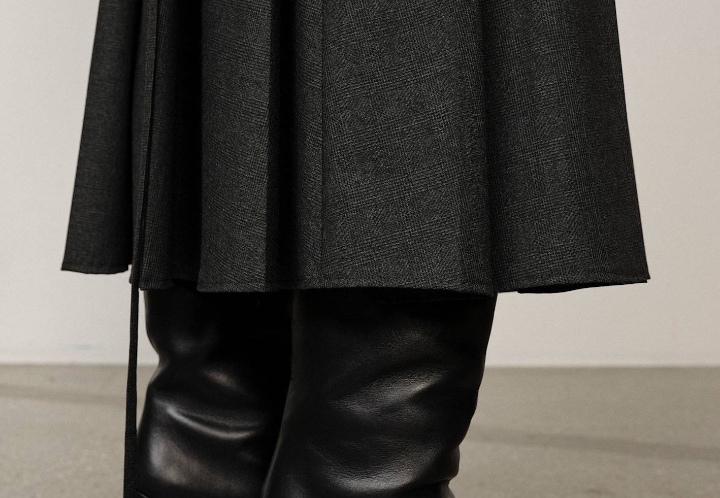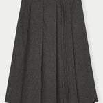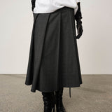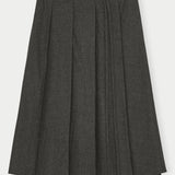 Introducing the Richard Skirt: A long pleated skirt with a mid-rise fit and string detailing at the waist.