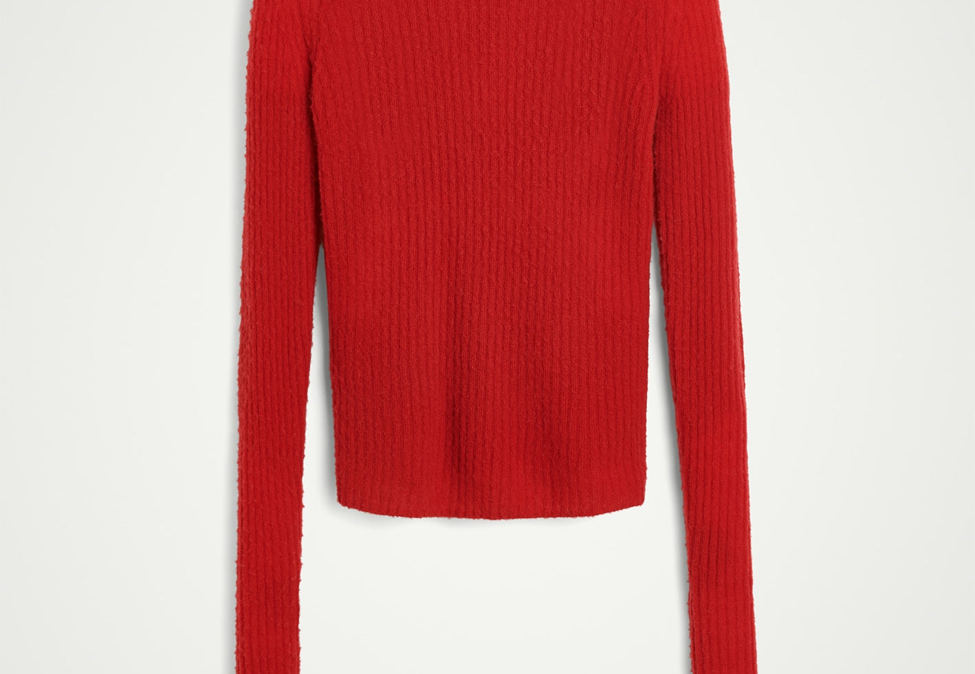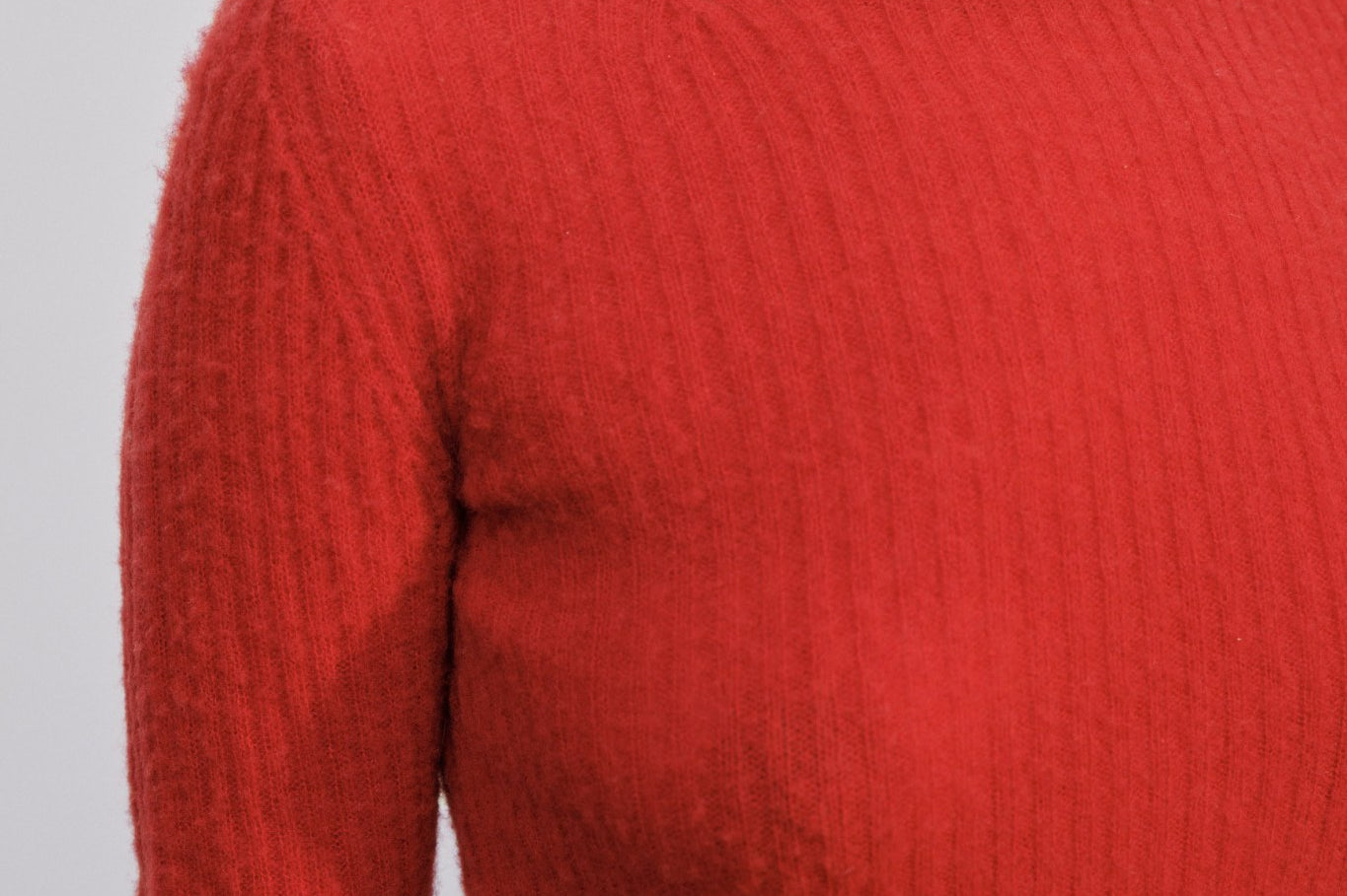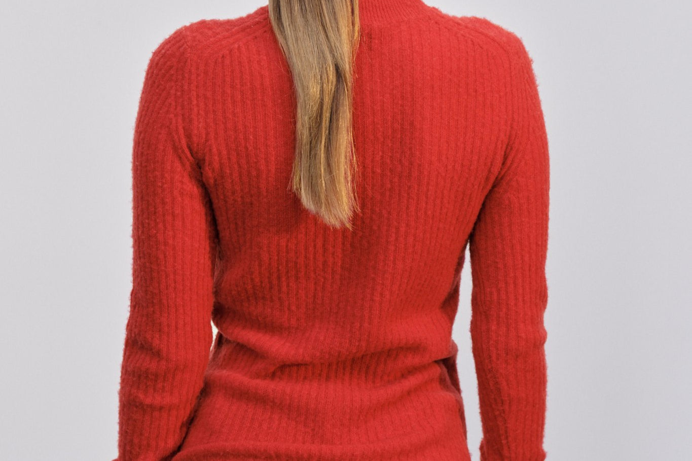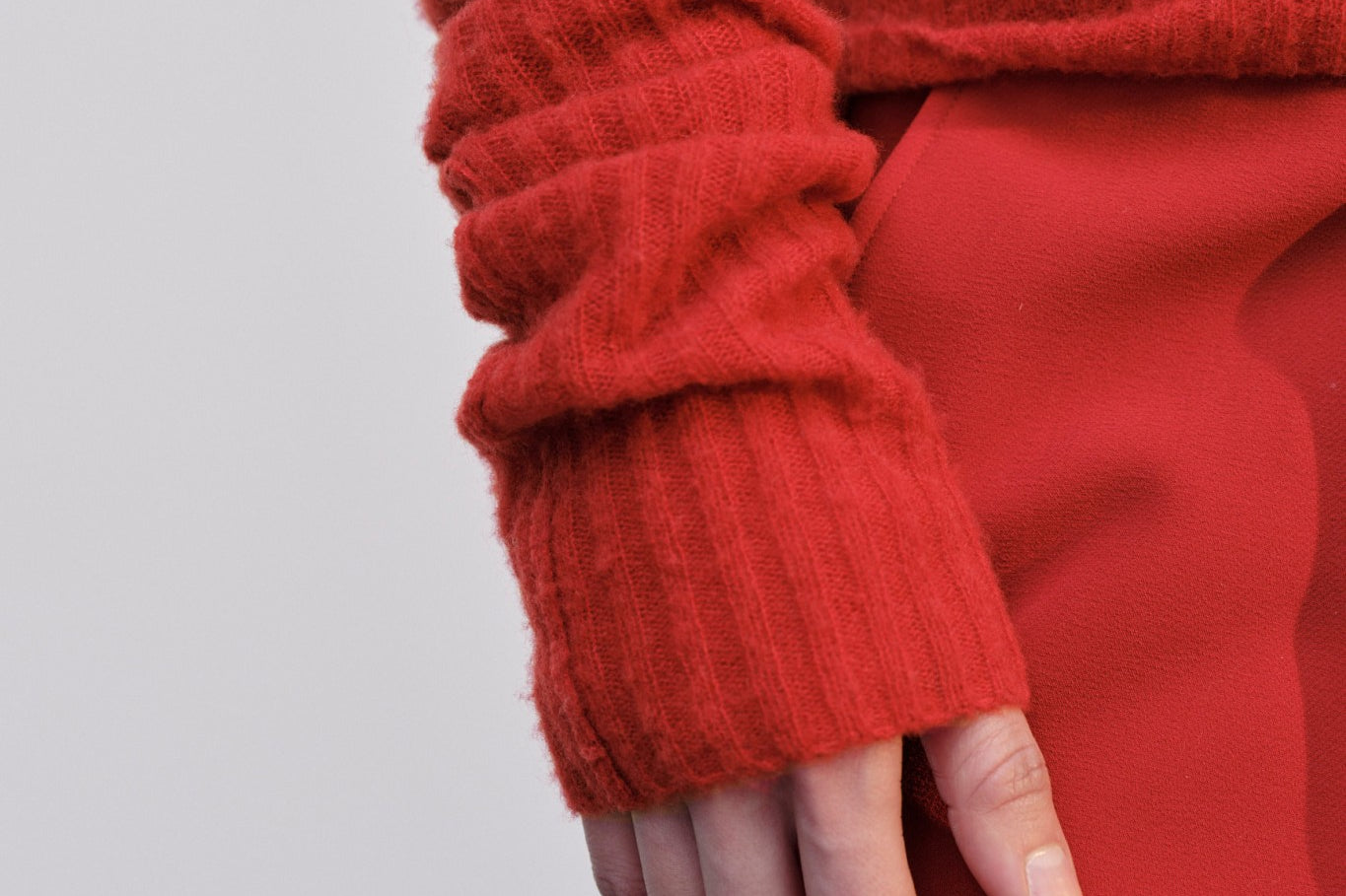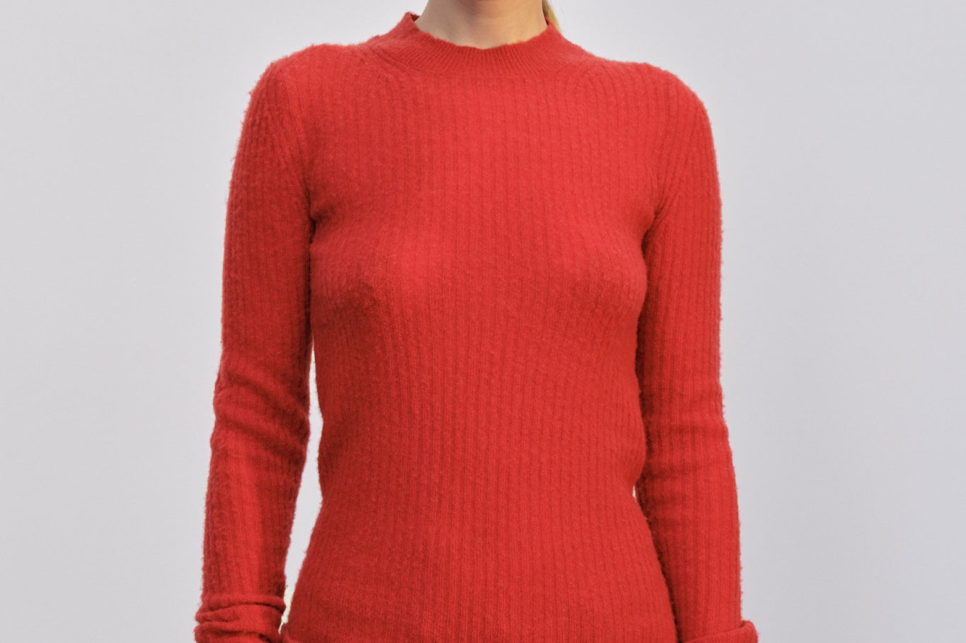Introducing the Tony Knit Blouse: A blouse with a higher round neckline, designed to fit tightly with high, turned-up cuffs.