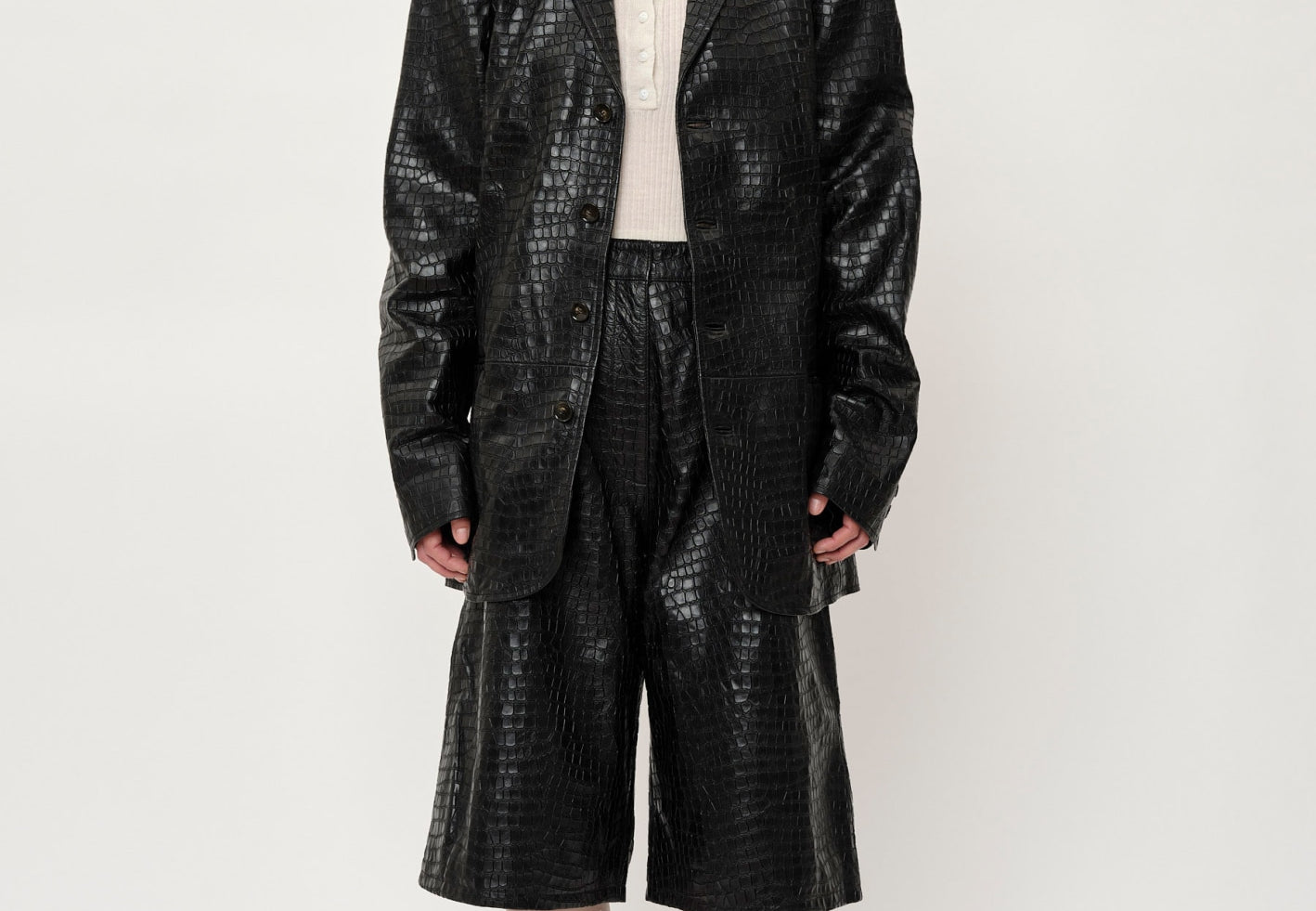 Introducing the Tristan Leather Shorts: A pair of loose, mid-waisted Bermuda shorts that hit at the knee, crafted from 100% LWG Gold certified lamb leather.