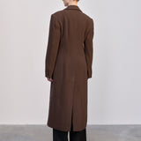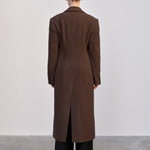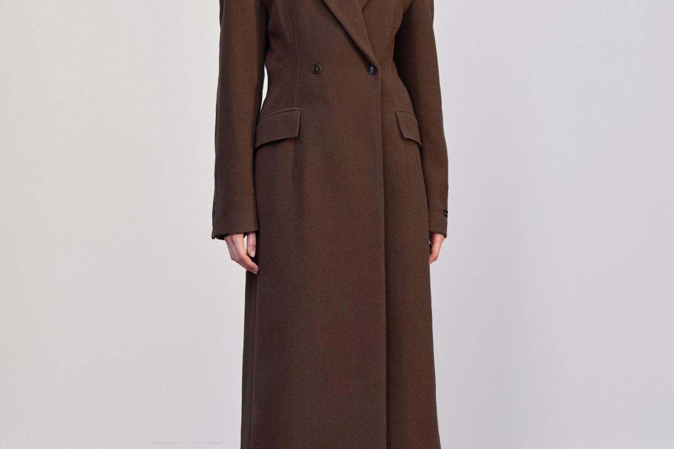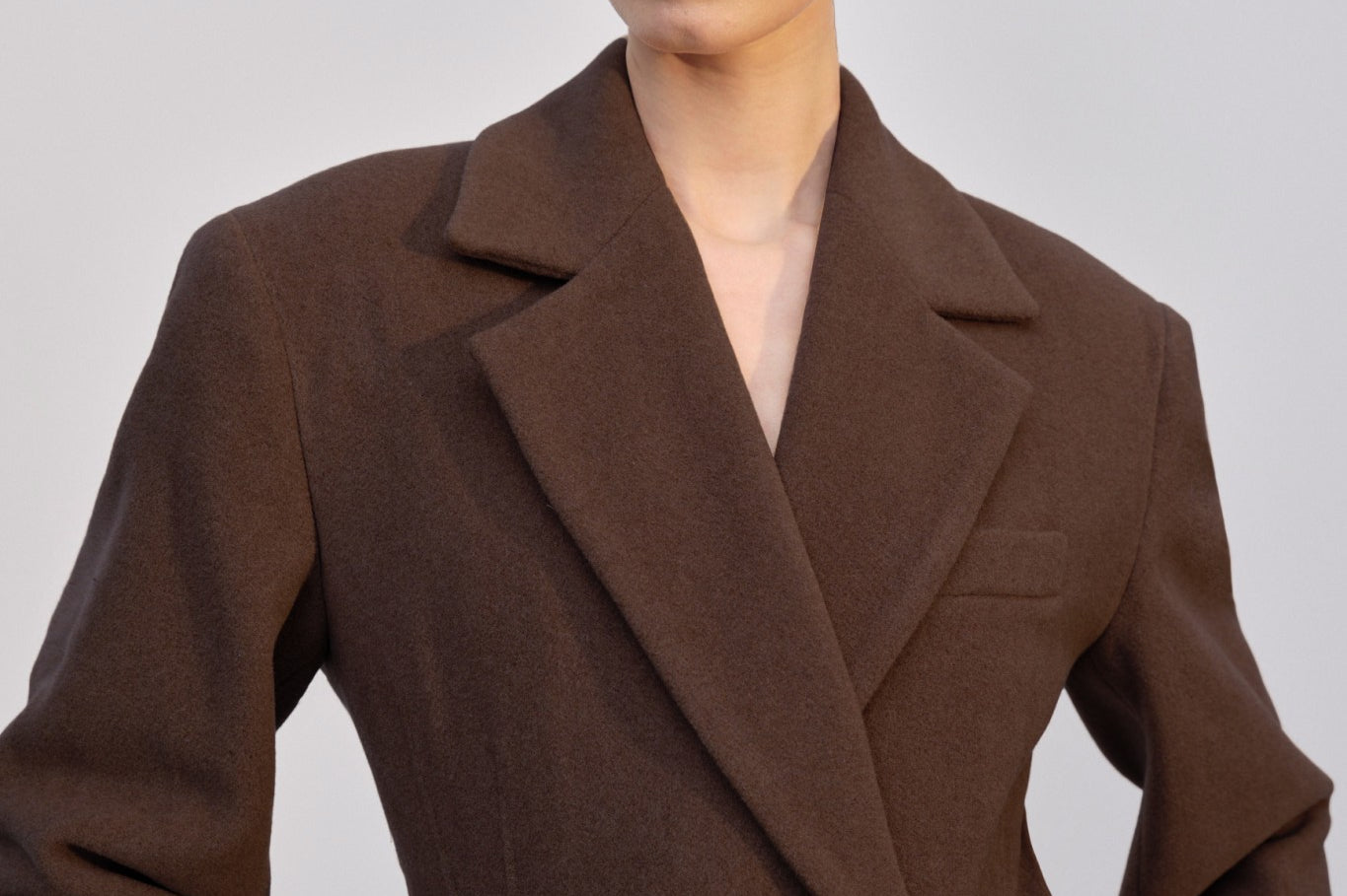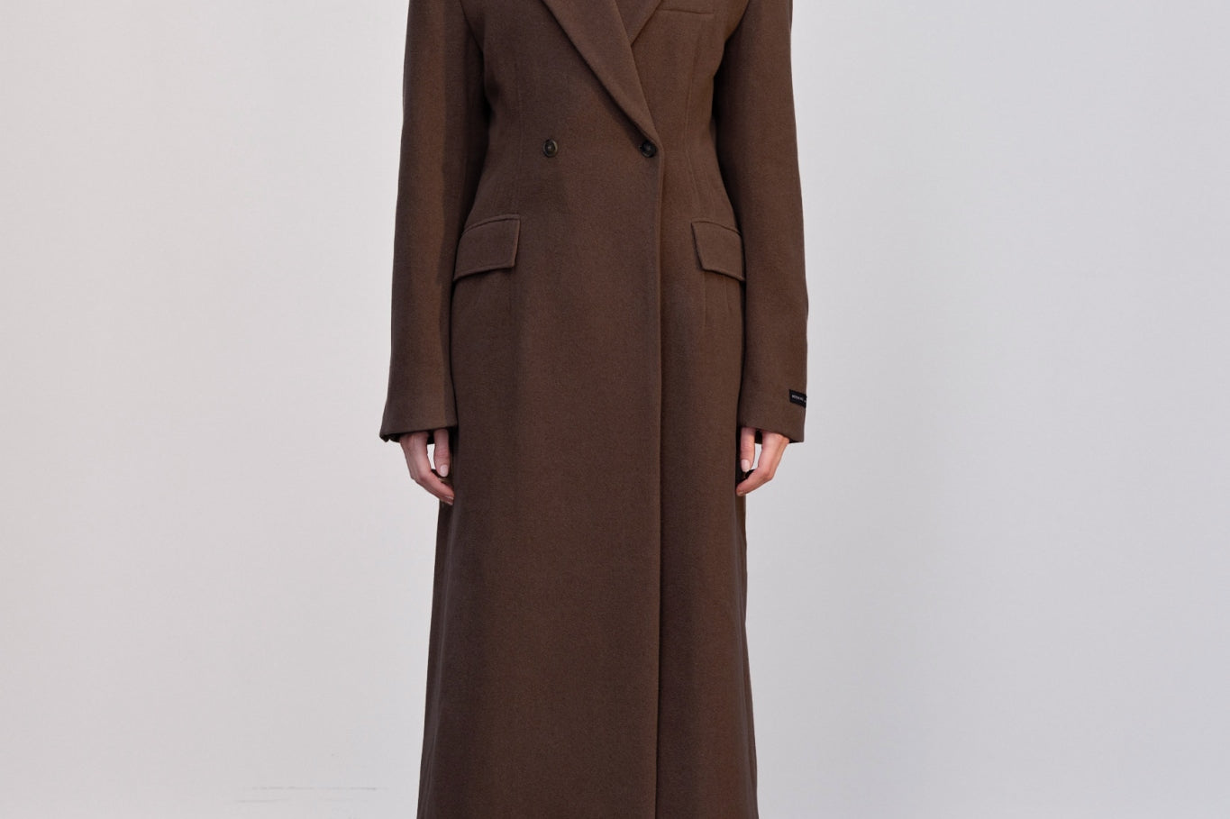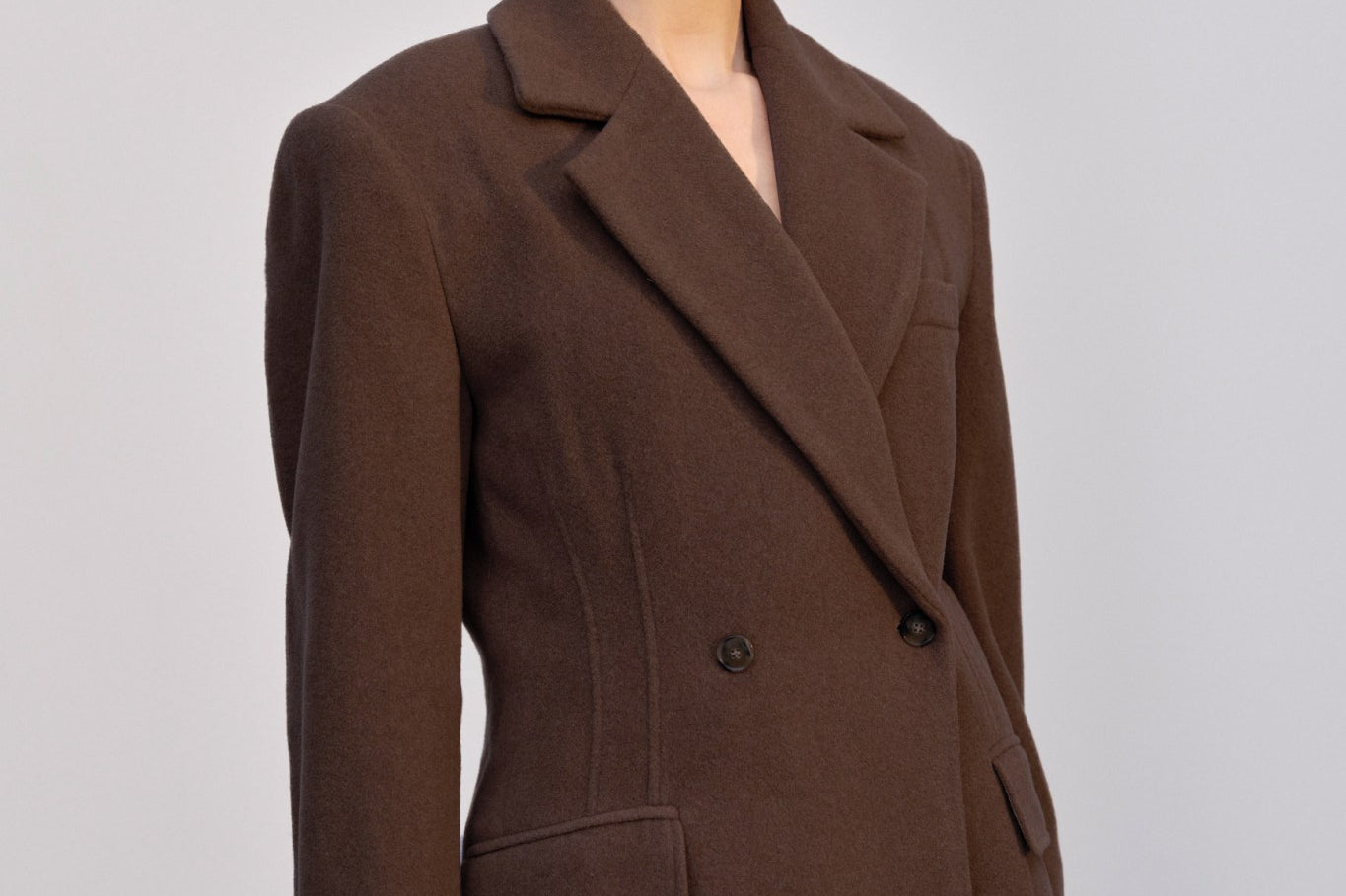 Introducing the Ultra Coat: A waisted long coat featuring big shoulders, a double-breasted front, and long darts at the waist for a tailored fit.