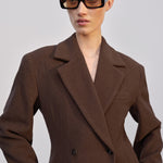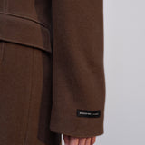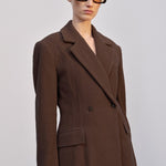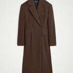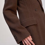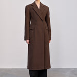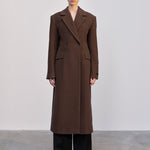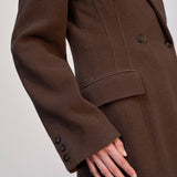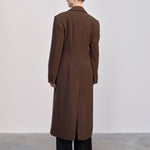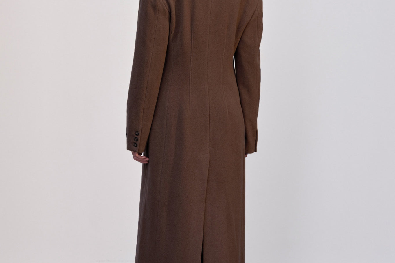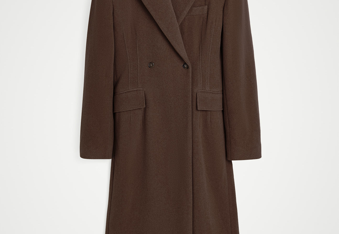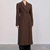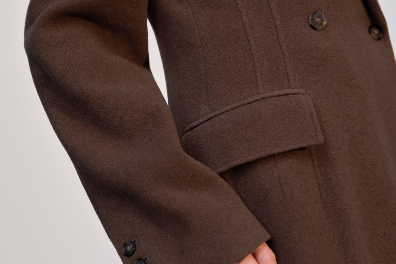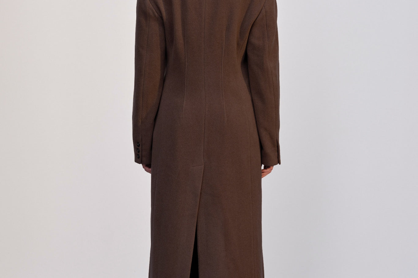 Introducing the Ultra Coat: A waisted long coat featuring big shoulders, a double-breasted front, and long darts at the waist for a tailored fit.