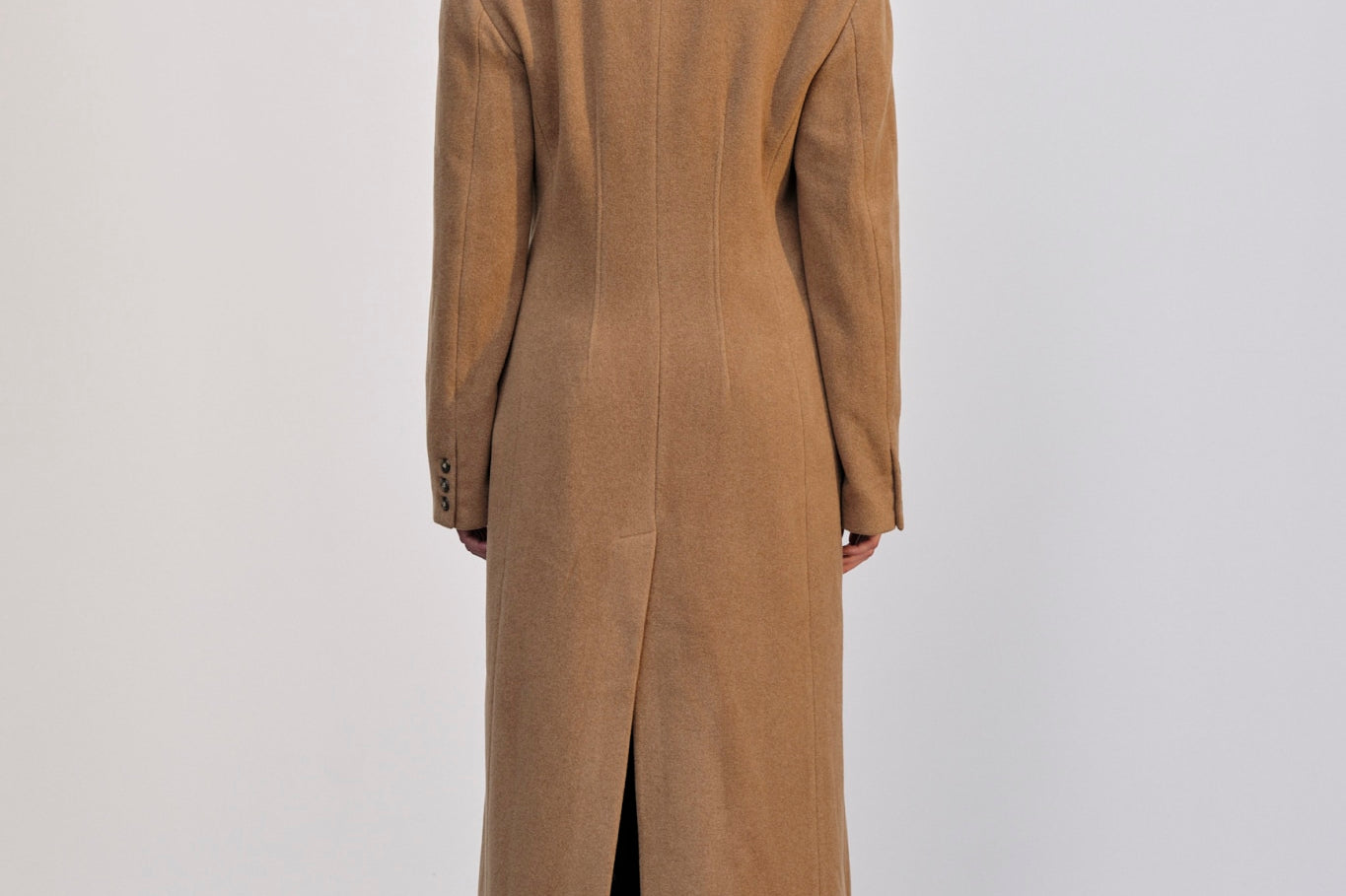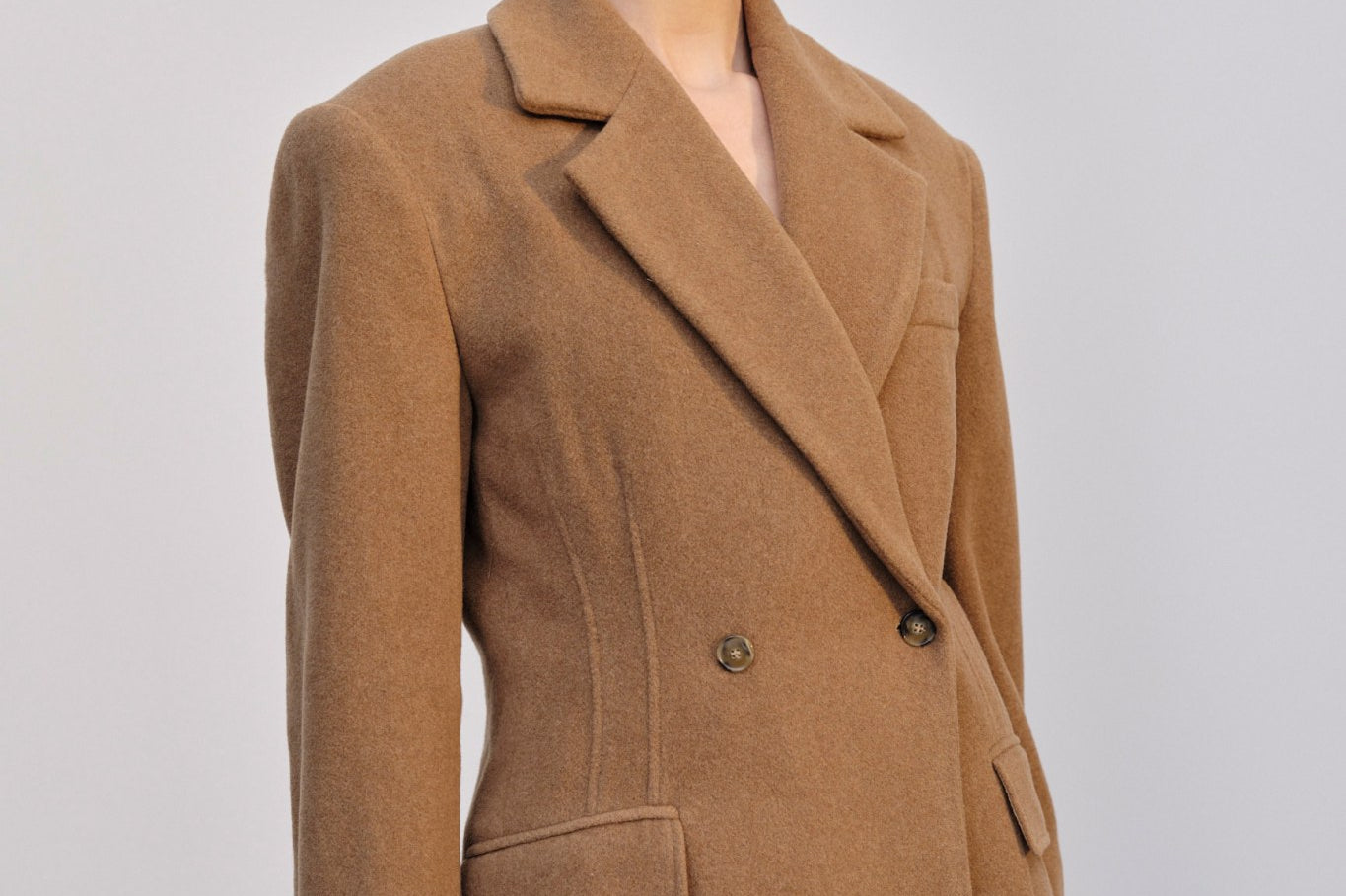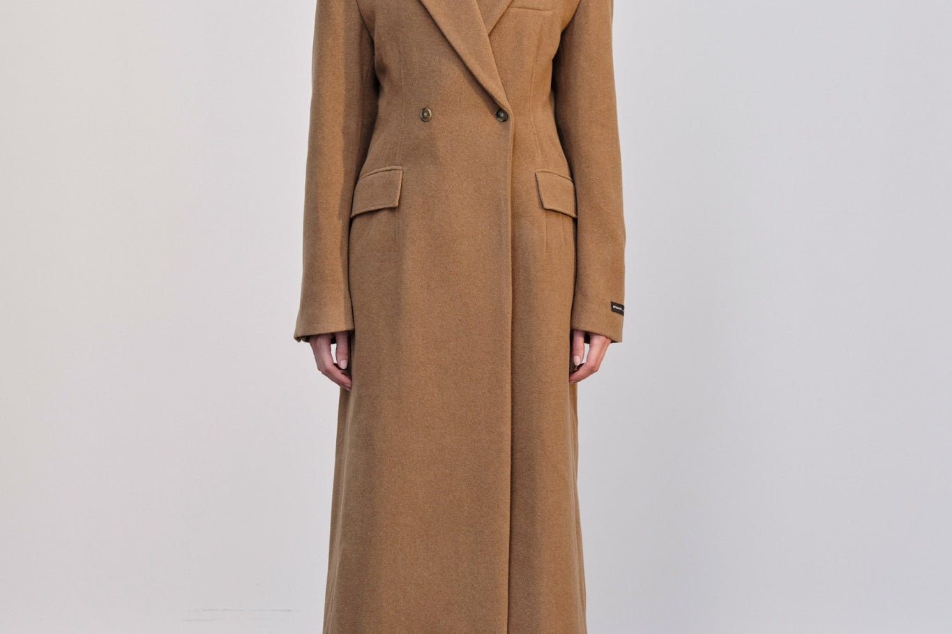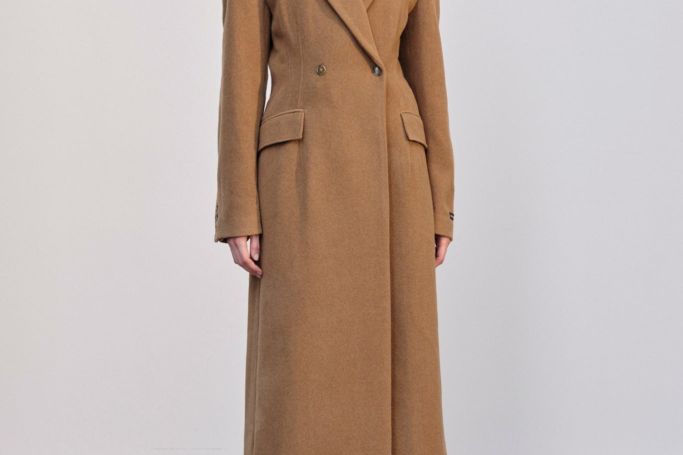 Introducing the Ultra Coat: A waisted long coat featuring big shoulders, a double-breasted front, and long darts at the waist for a tailored fit.