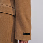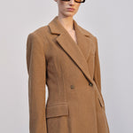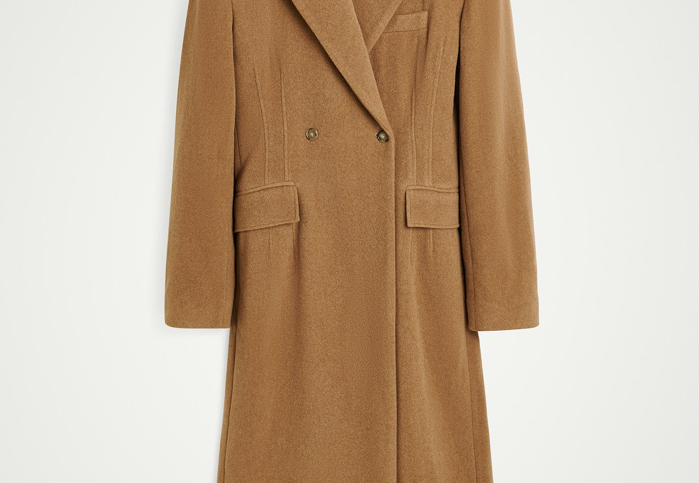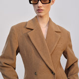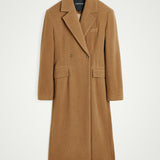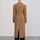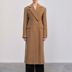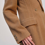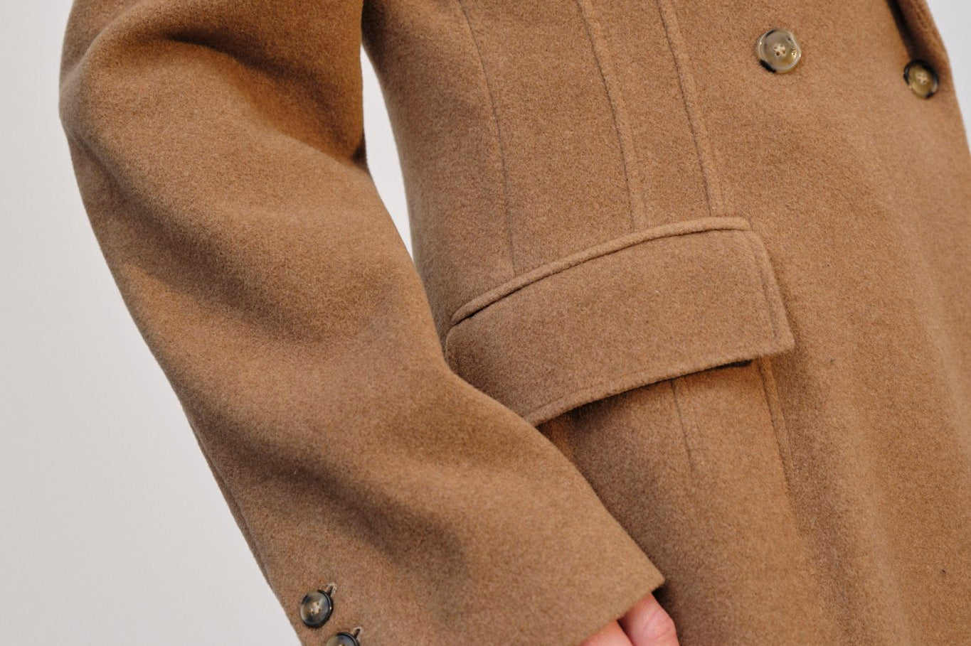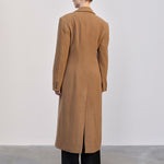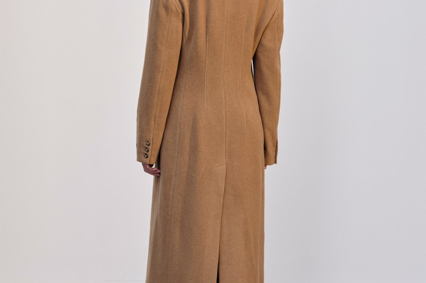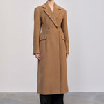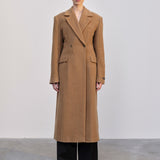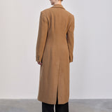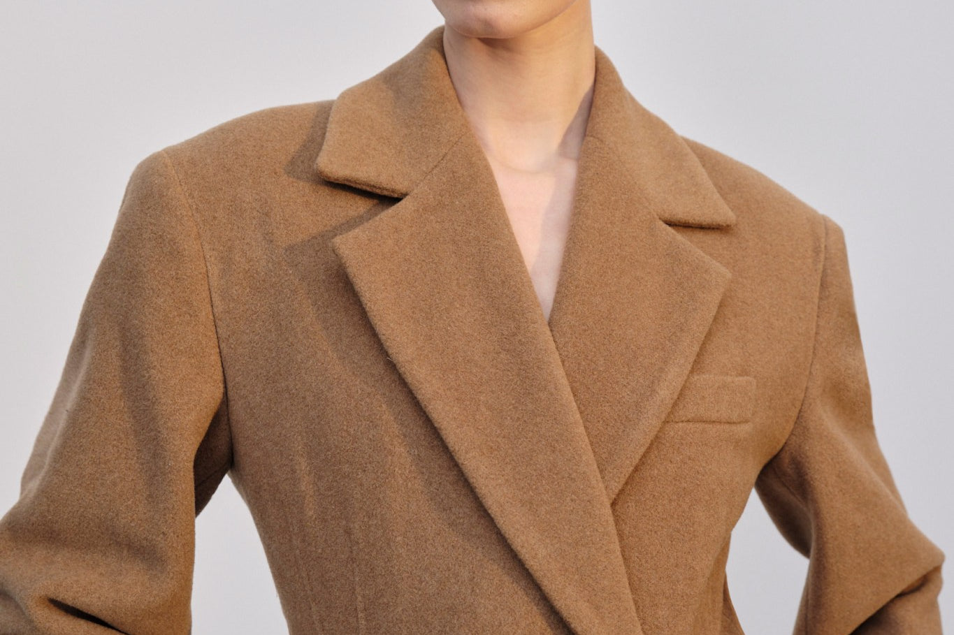 Introducing the Ultra Coat: A waisted long coat featuring big shoulders, a double-breasted front, and long darts at the waist for a tailored fit.