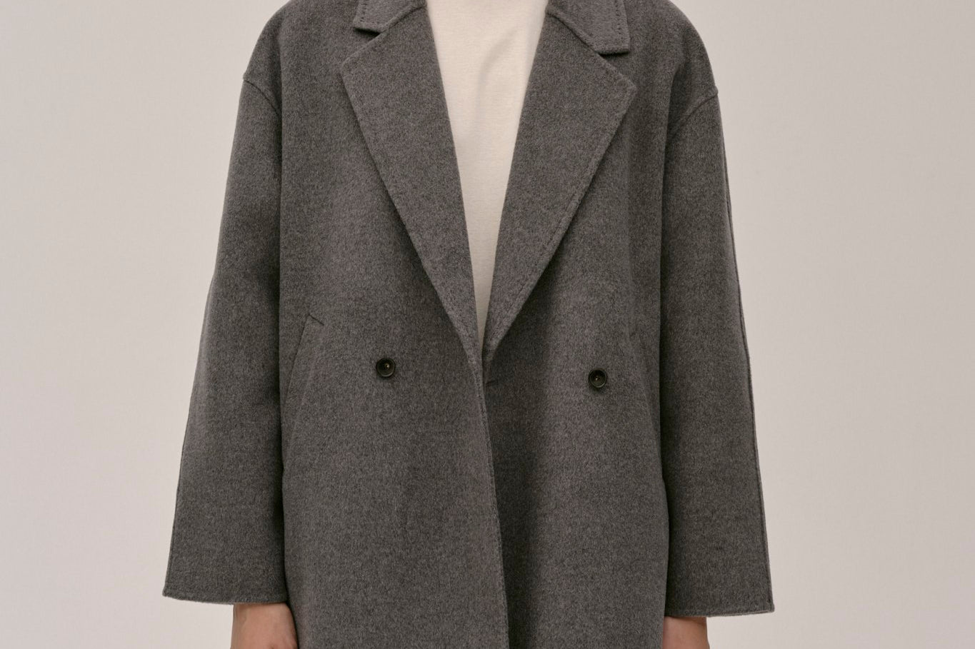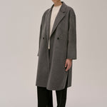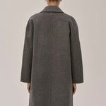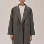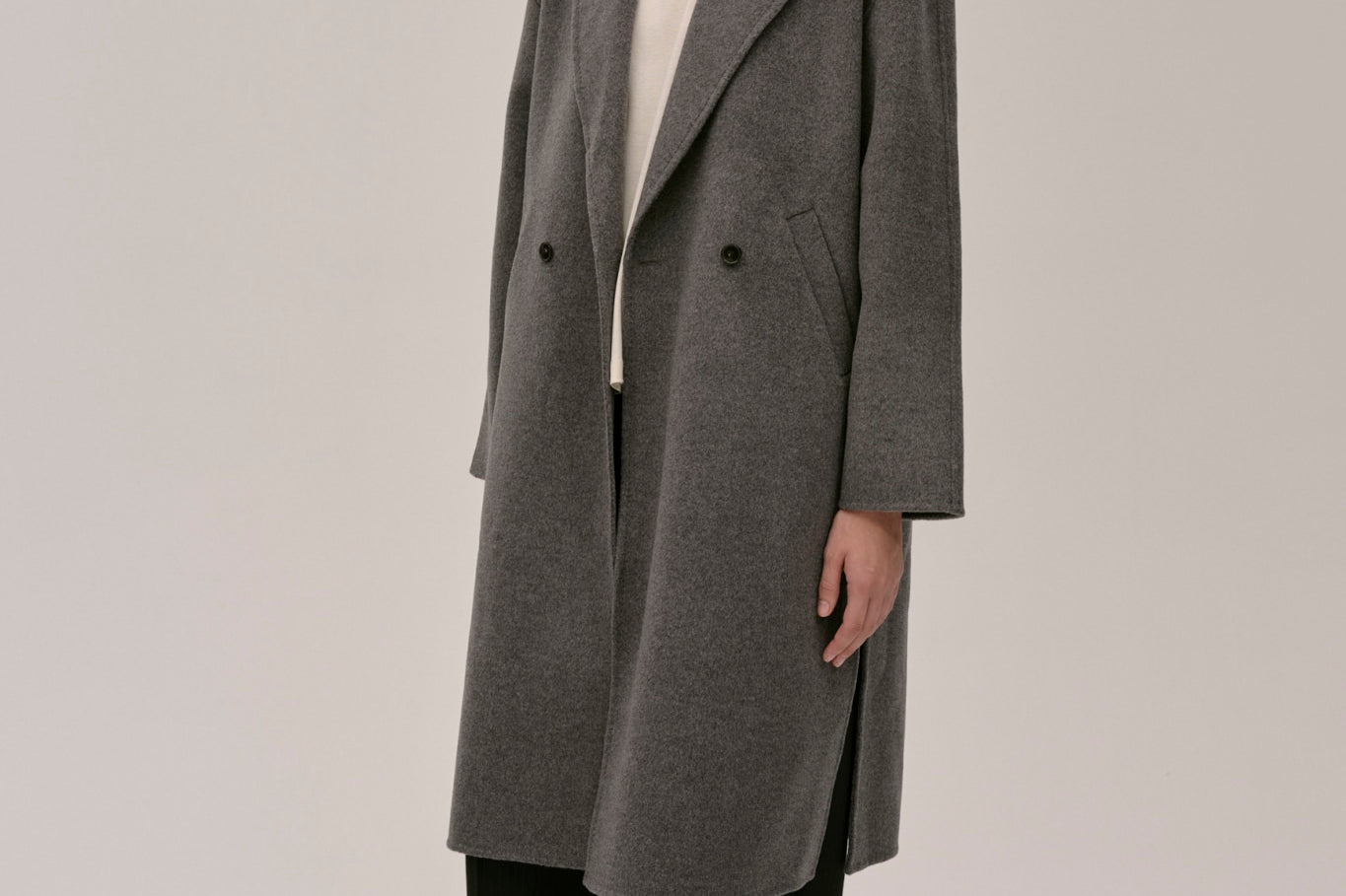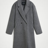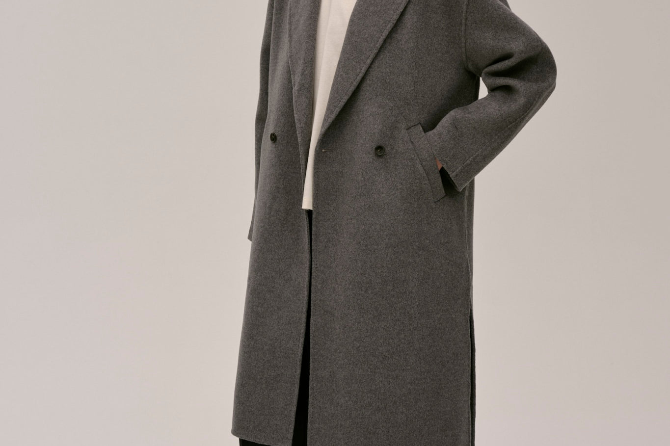 The Zion Lux Coat is an oversized coat that reaches to the calf. It features dropped shoulders, double-breasted buttoning, two paspel pockets, and a slit at the back.