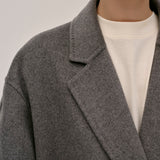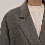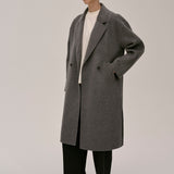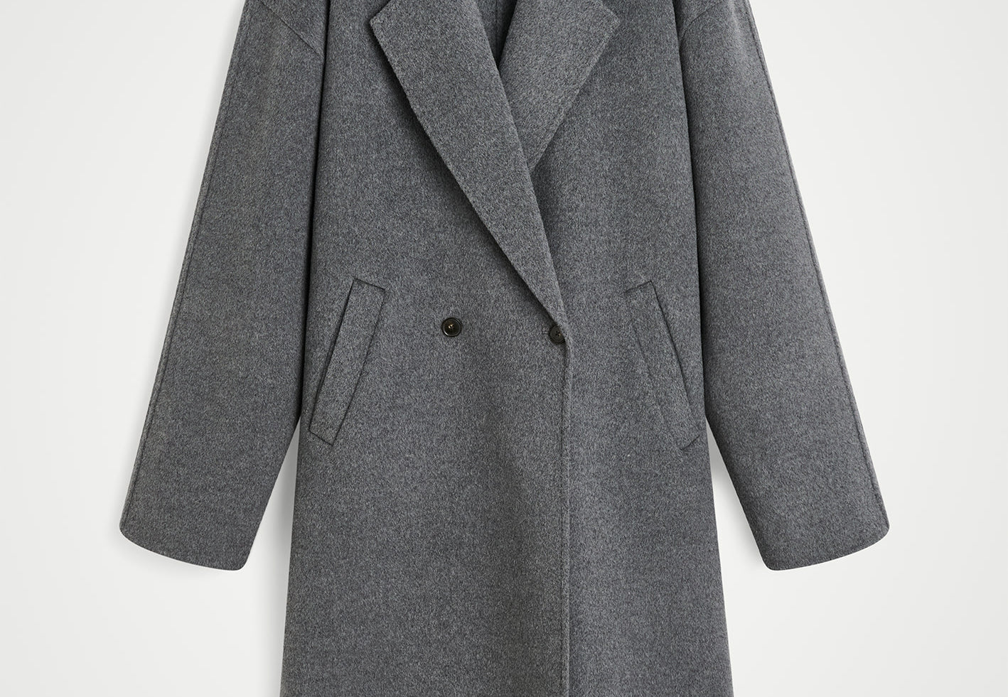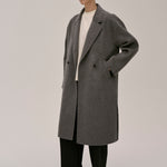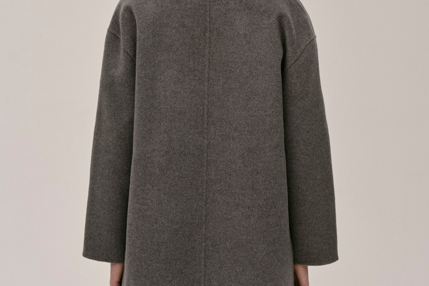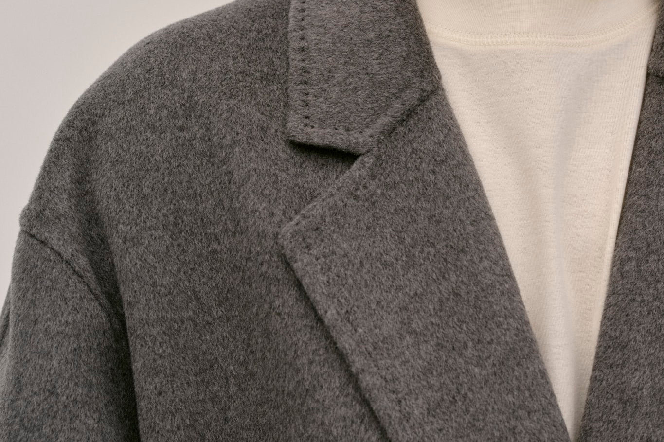 The Zion Lux Coat is an oversized coat that reaches to the calf. It features dropped shoulders, double-breasted buttoning, two paspel pockets, and a slit at the back.